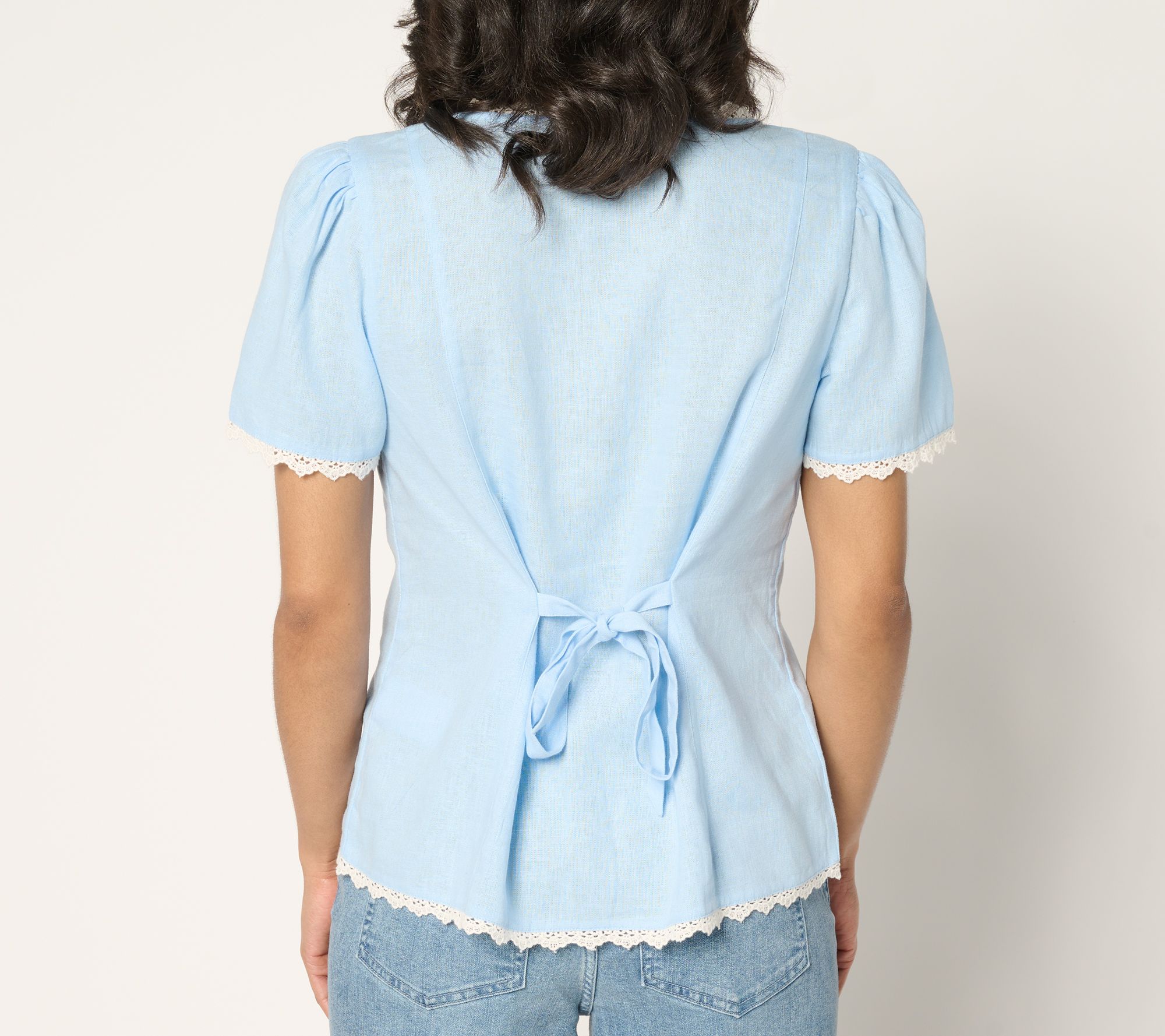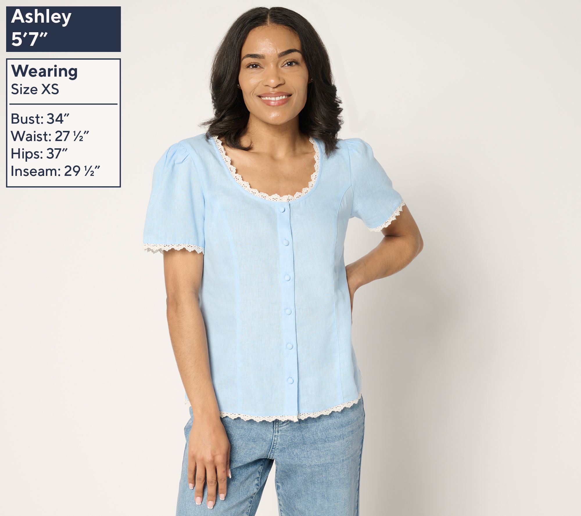 Get ready for compliments with this Lizzy Lou linen blouse. The short sleeves, scoop neckline, and lace trim details give it a feminine touch, while the self-tie waist allows you to create a flattering silhouette. Perfect for casual outings or dressier occasions, this semi-fitted top offers a stylish blend of linen and viscose for comfort and elegance. From Me by Jennie Garth.