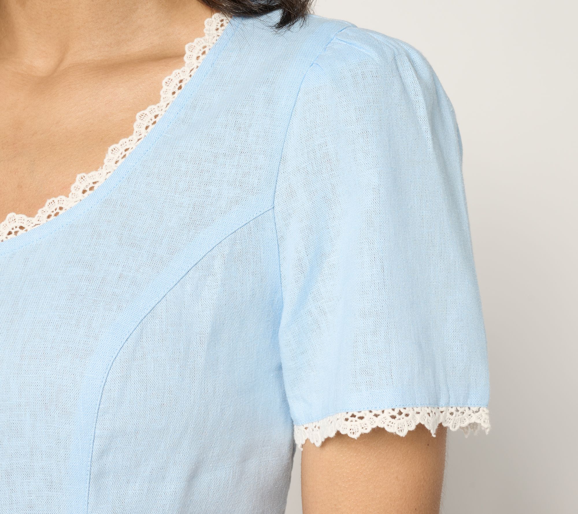 • Features: short sleeves, shirring at sleeve cap, set-in armholes, scoop neckline, lace trim details at neck and sleeves, princess seam detail, self-tie at waist