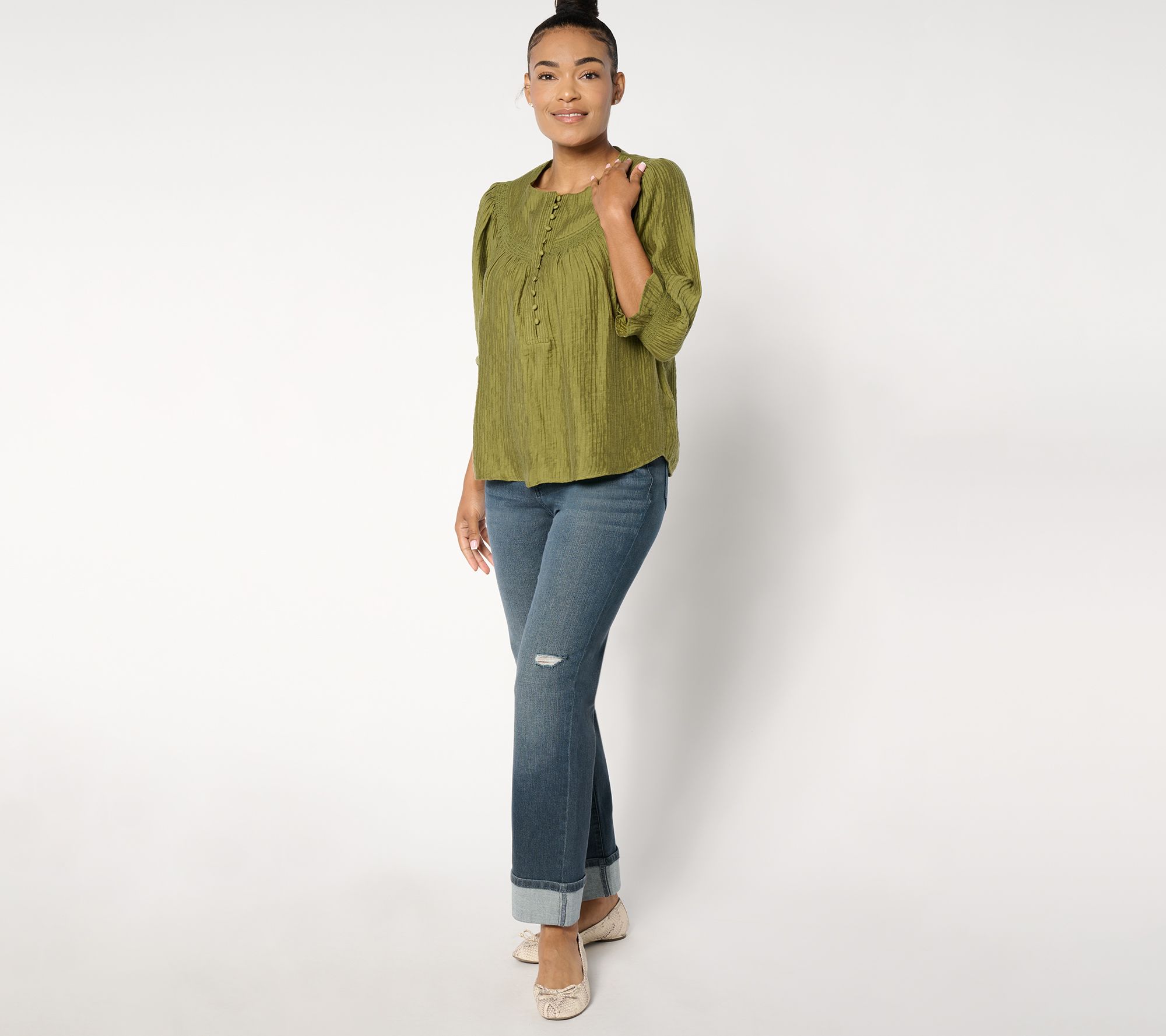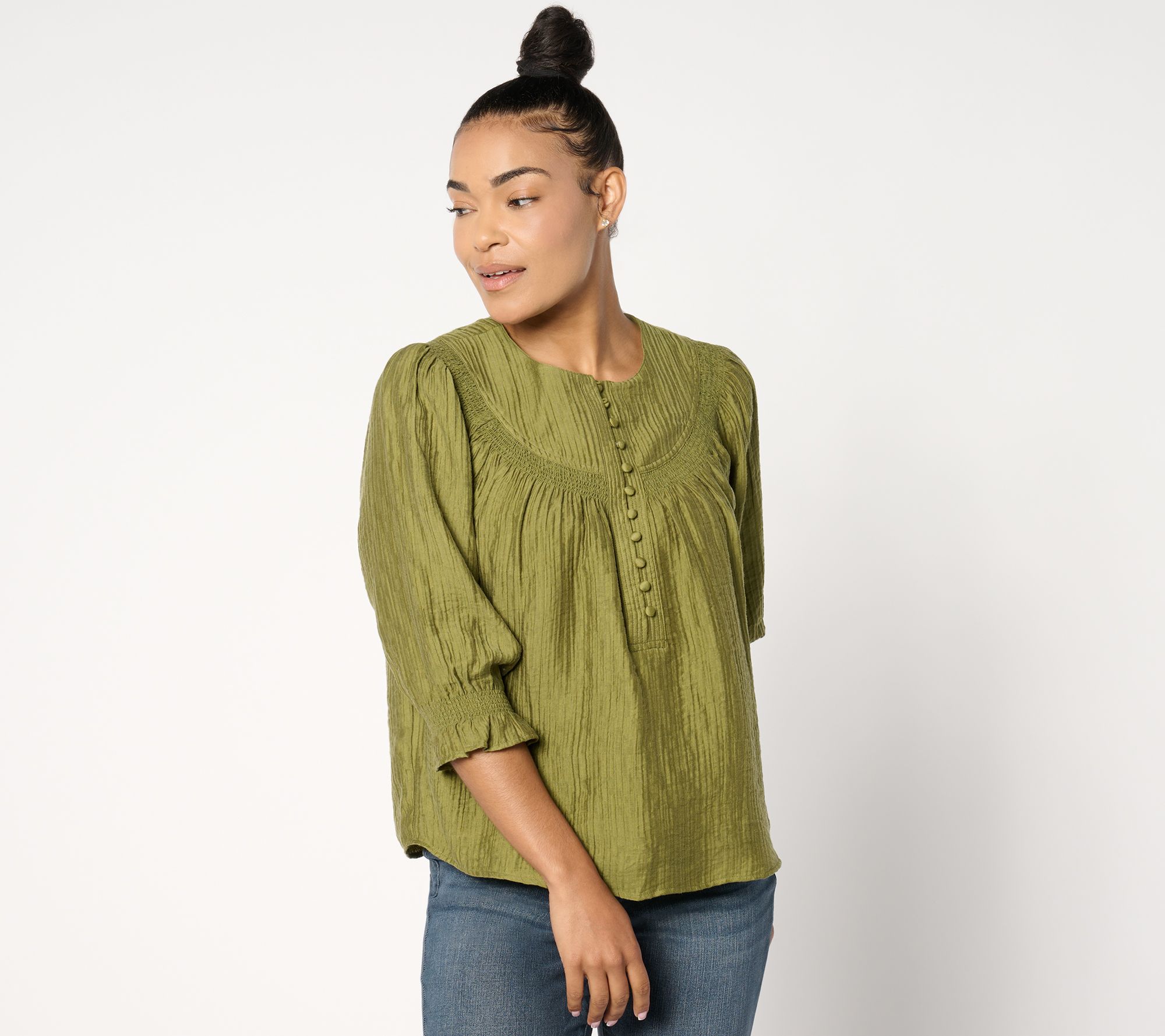 A stepped-up style from your basic button-up or well-loved T-shirt, this woven blouse brings a welcome refresh to your everyday options. From Me by Jennie Garth.