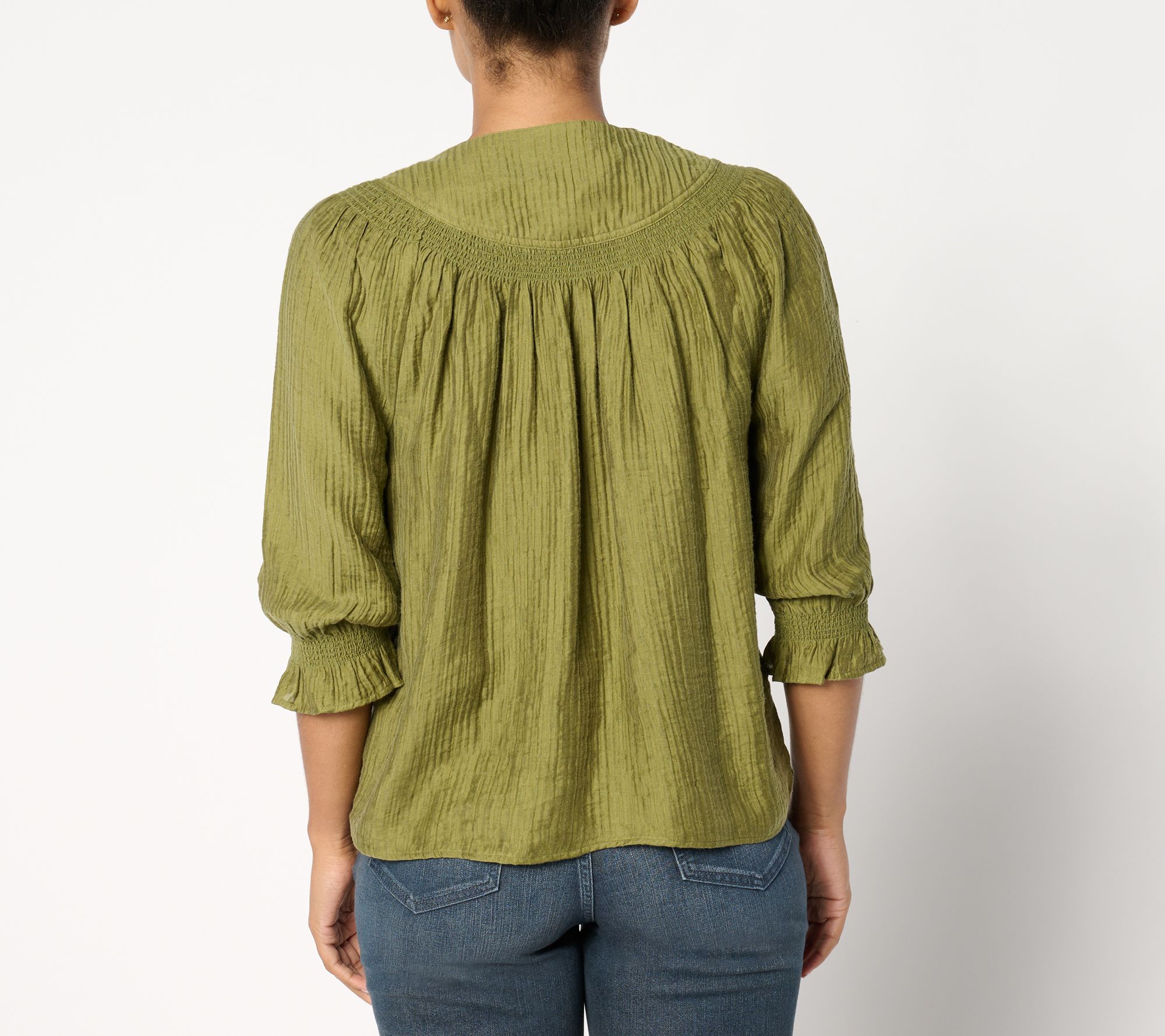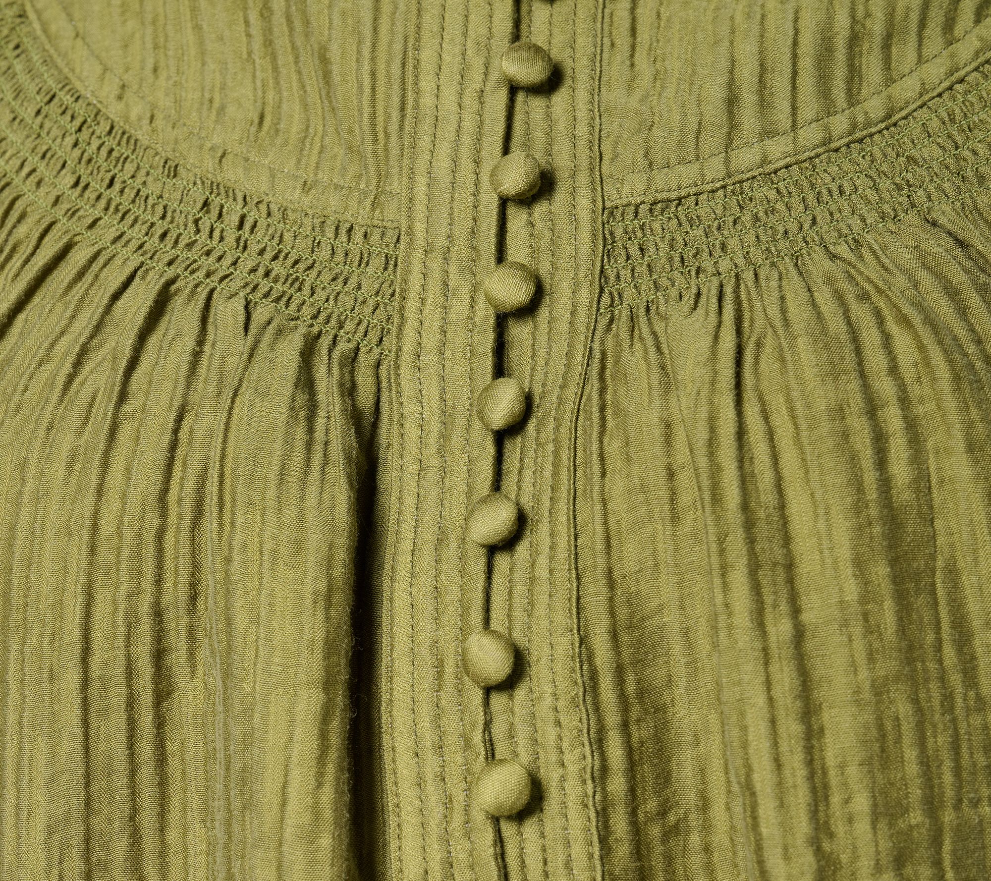 • Features: smocking under yoke, smocked sleeve cuffs, straight hem, self-separate panel at center front with elastic button loop and covered button at center front