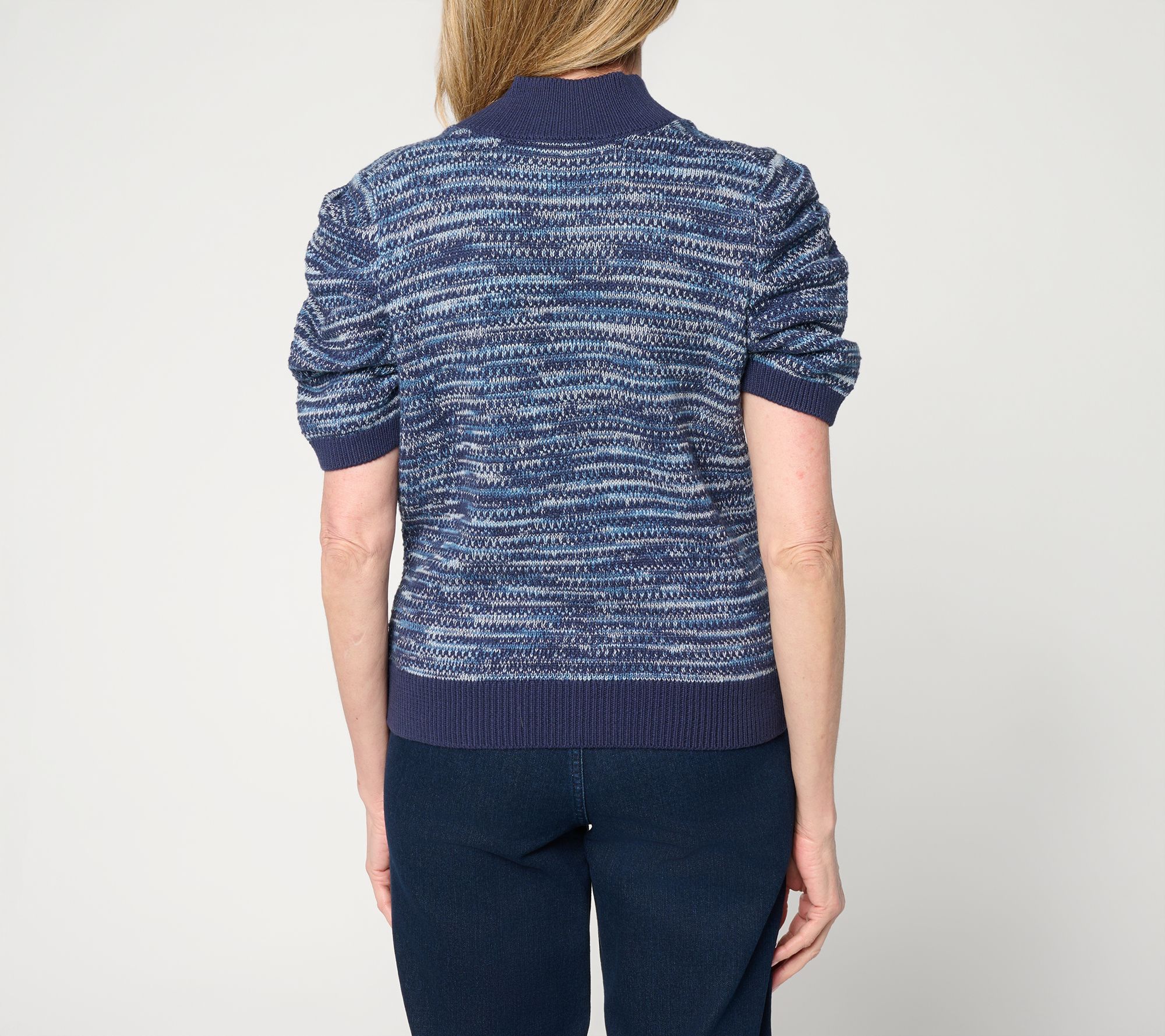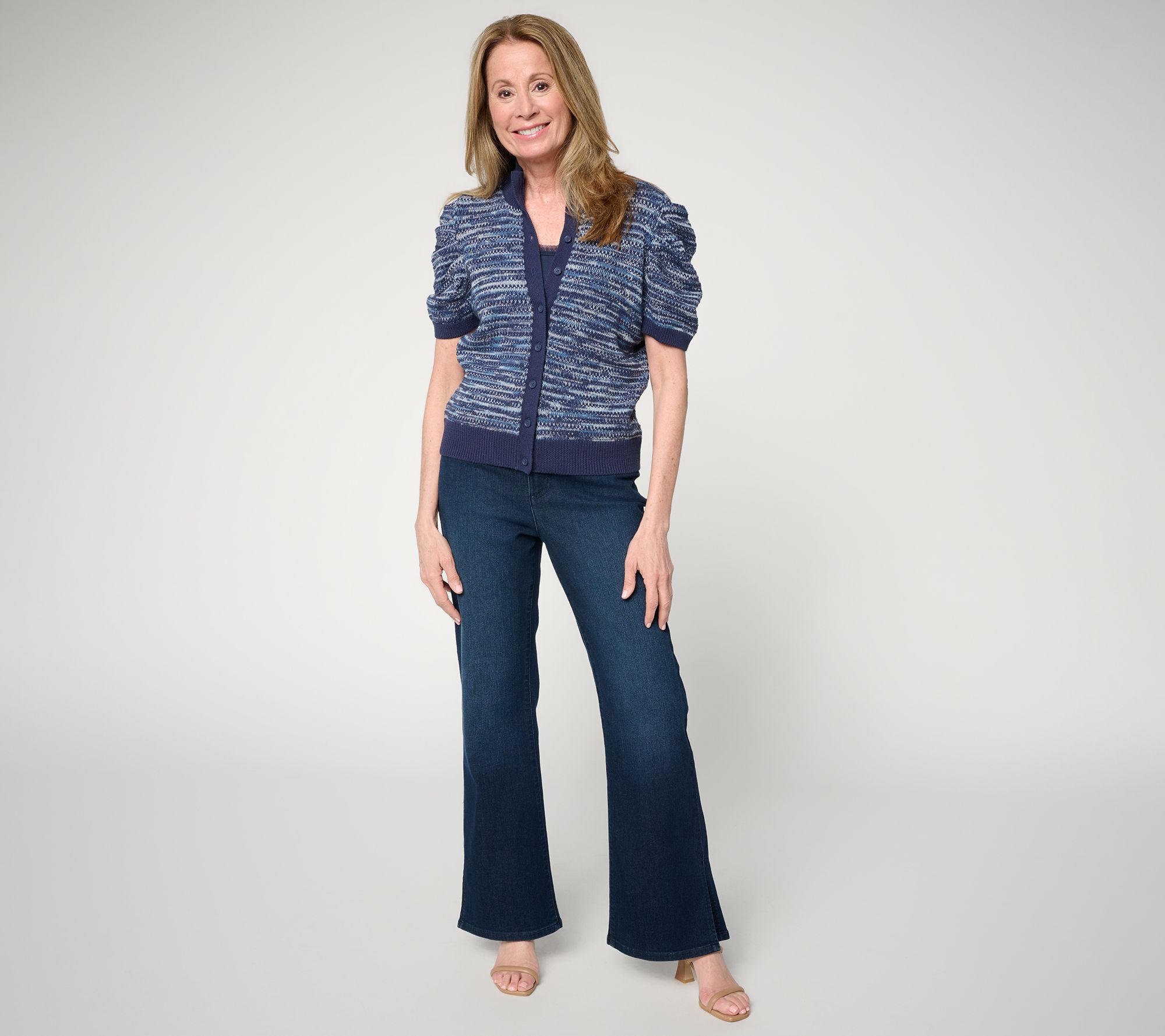 A space-dyed design and softly pleated sleeves add the right touch of polish and texture to this live-in-it cardigan. Button it up and bolt for coffee runs or exursions out, confidently dressed in a layer that could never be called cookie-cutter. From Me by Jennie Garth.