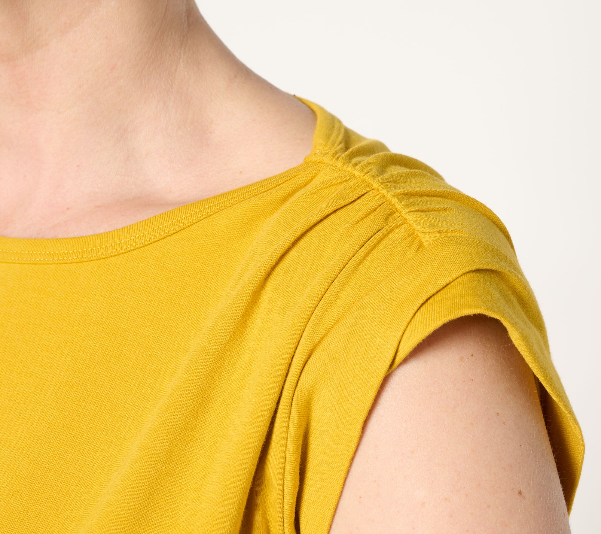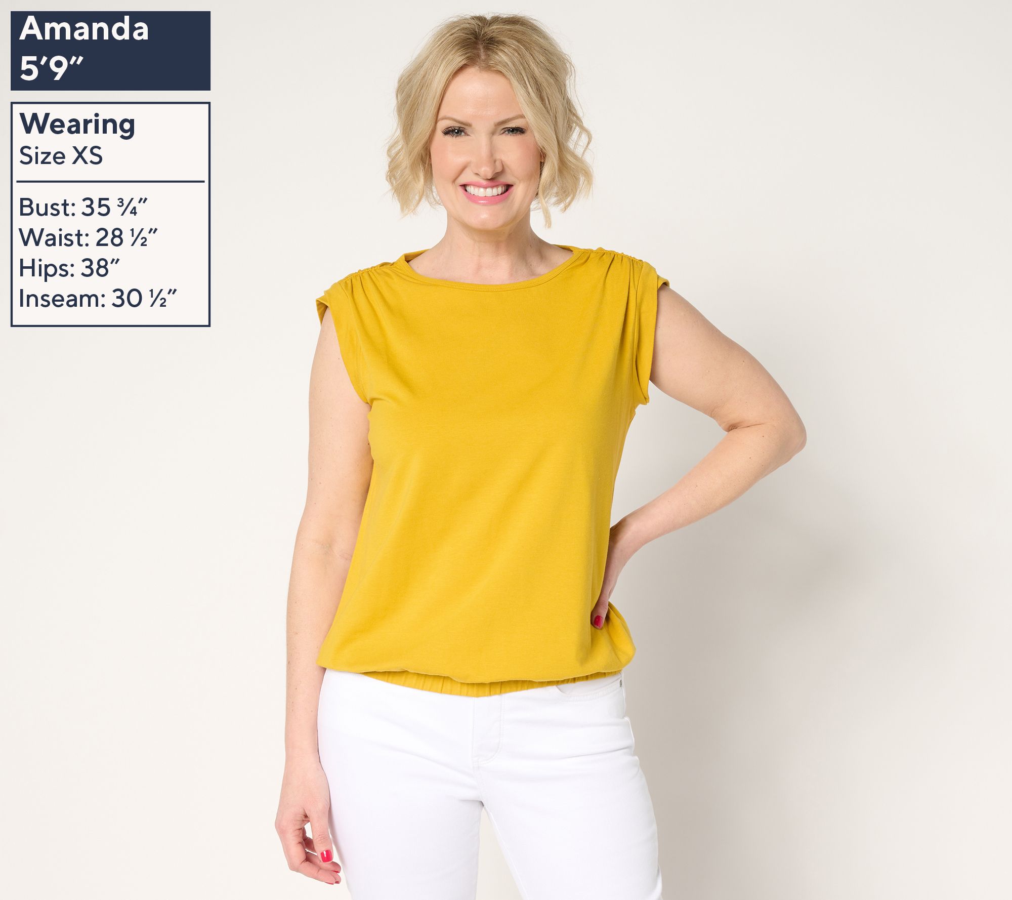 • Features: elastic hem, crew neckline, light shoulder pads with shirring, twisted roll cuffs, encased elastic hem, slight blouson