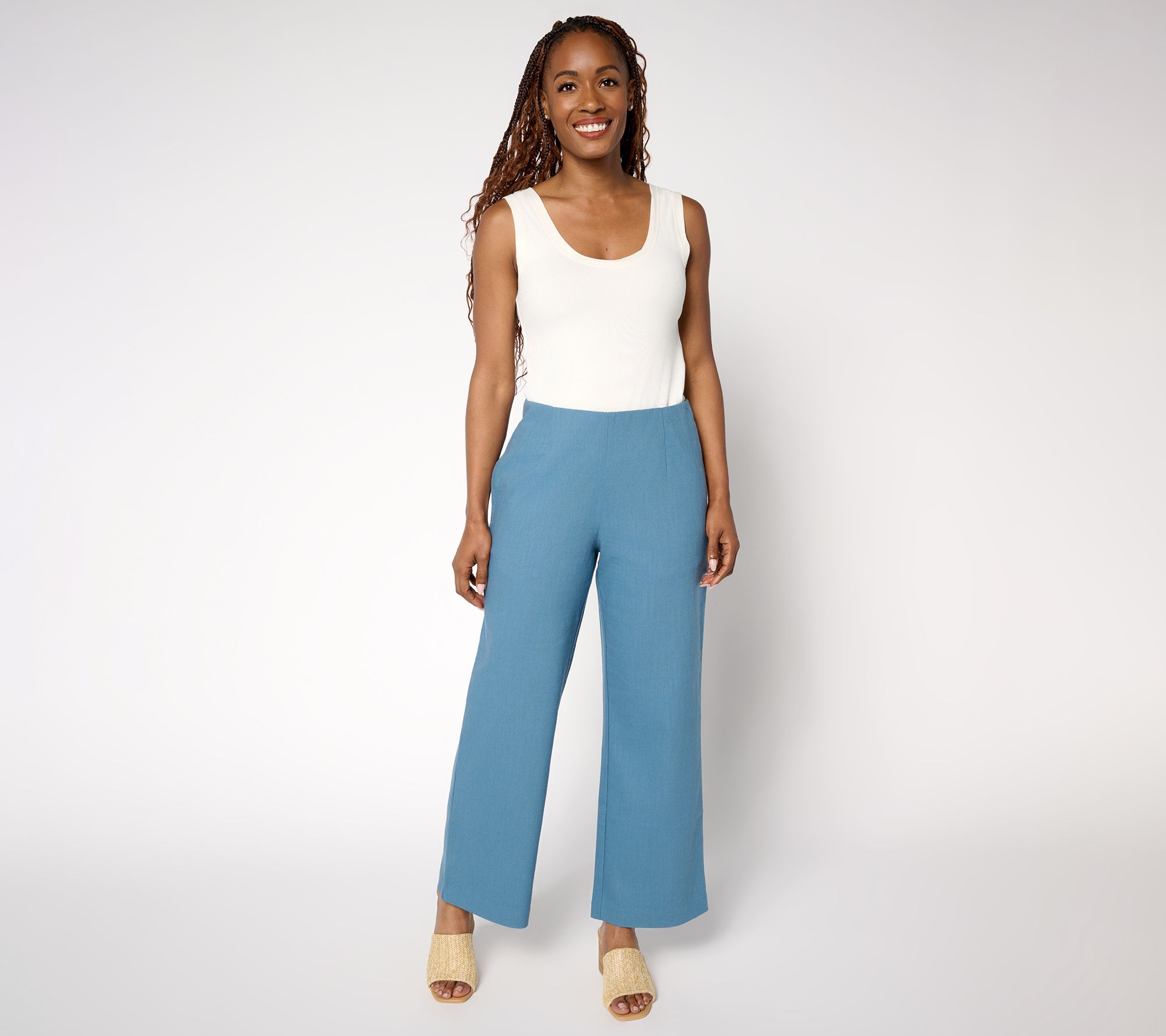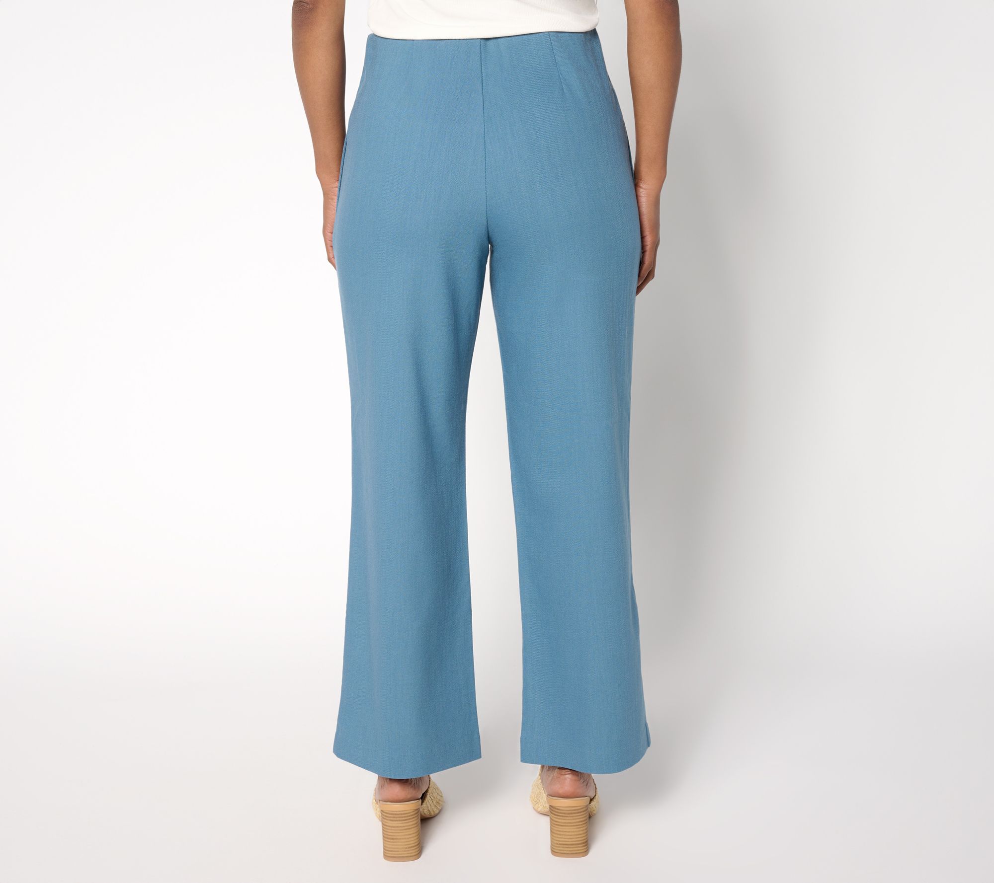 We have lift off! Launch your work-ready looks with these Me by Jennie Garth twill pants. A trouser style with clean lines and a no-fuss fit, the Hollywood waistband and soft stretch keep things smooth around the waist, while the wide-leg silhouette make styling so easy for both polished casual and more profesh looks. Front and back waist darts lend a tailored touch, while side seam pockets add just the right amount of function. From Me by Jennie Garth.
