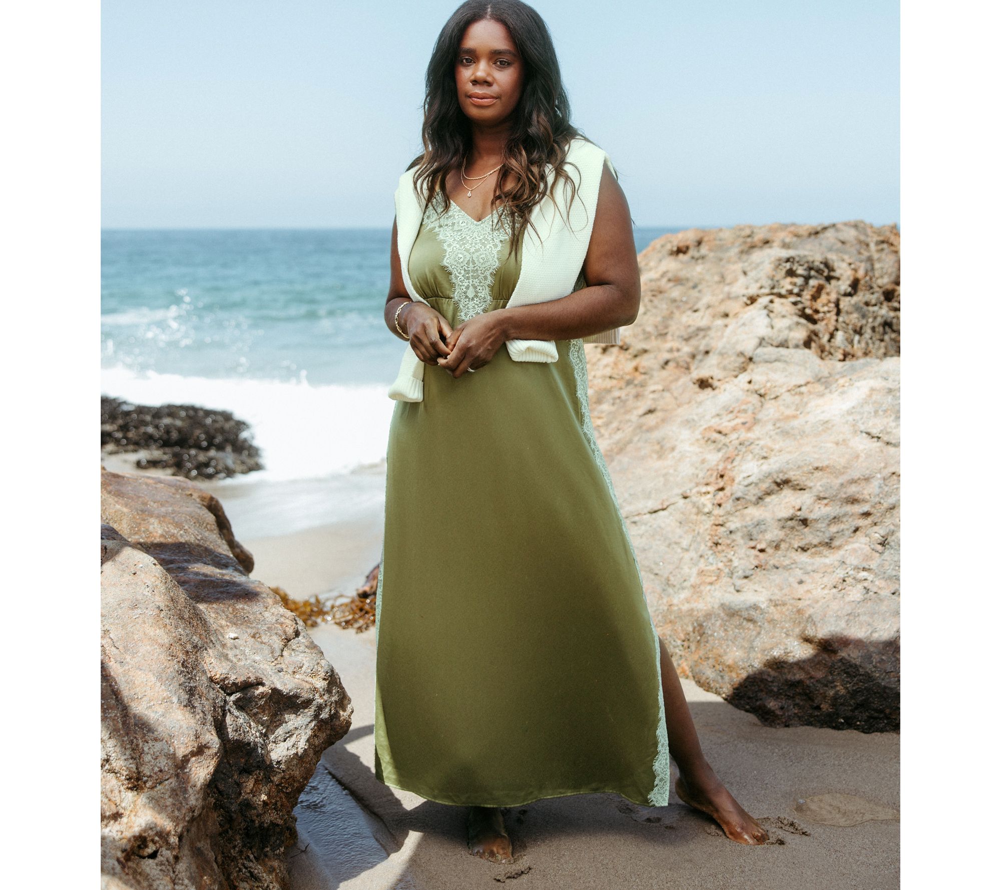 Just right for date night or an intimate gathering with friends, this satin maxi dress exudes luxe vibes. An elegant lace trim and chic side slit add touches of sophistication and ladylike charm. From Me by Jennie Garth.