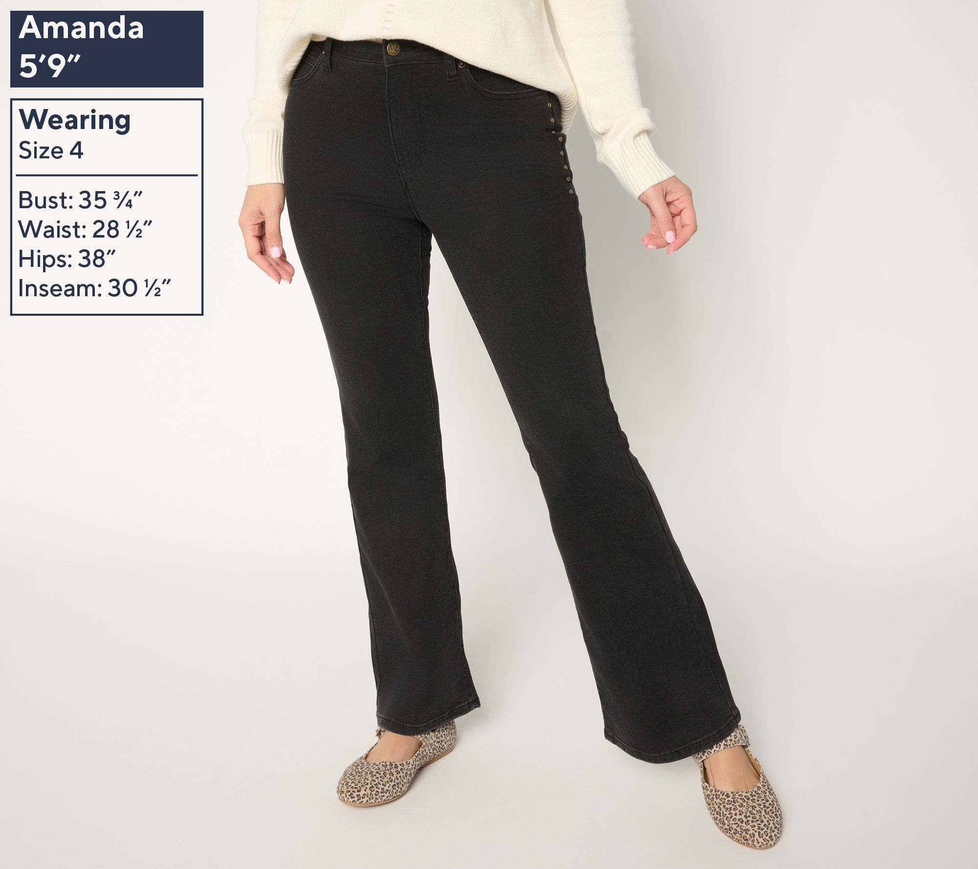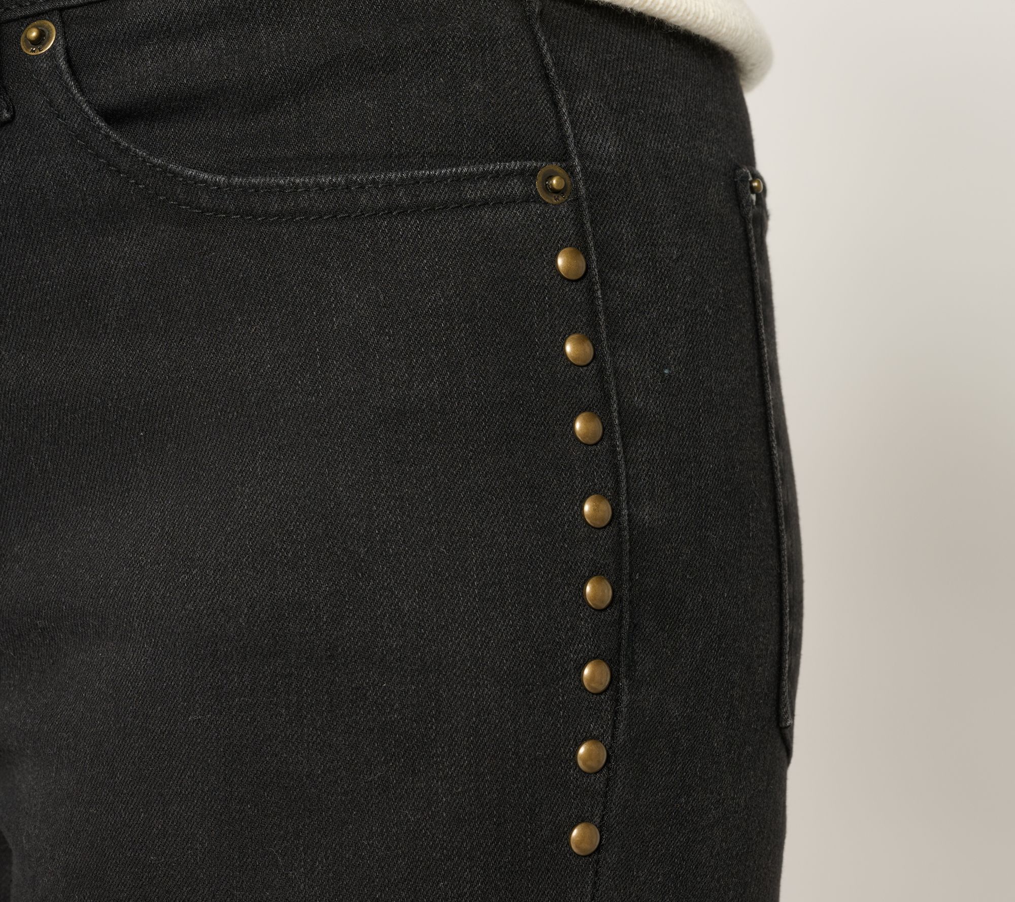 Slip into these woven denim boot-cut pants for a standout look, whether you're heading to casual Fridays at work or weekend get-togethers. Timeless five-pocket styling, eye-catching studded details, and a flattering full-length silhouette create an easy wardrobe favorite that can be dressed up or down. From Me by Jennie Garth.
