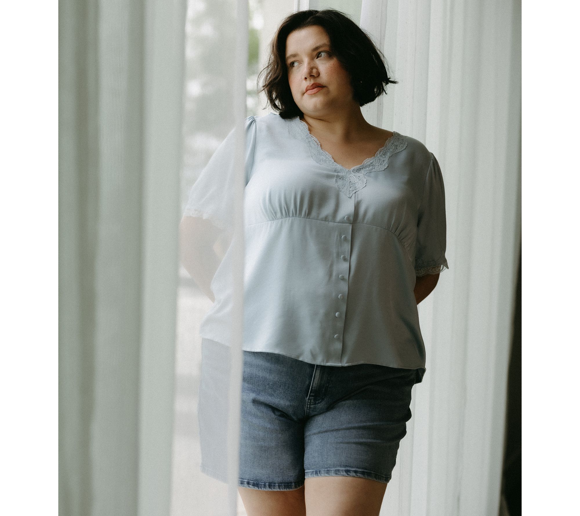 • Features: lace trim, short sleeves, non-functional button at center front, curved at under bust, straight bottom hem