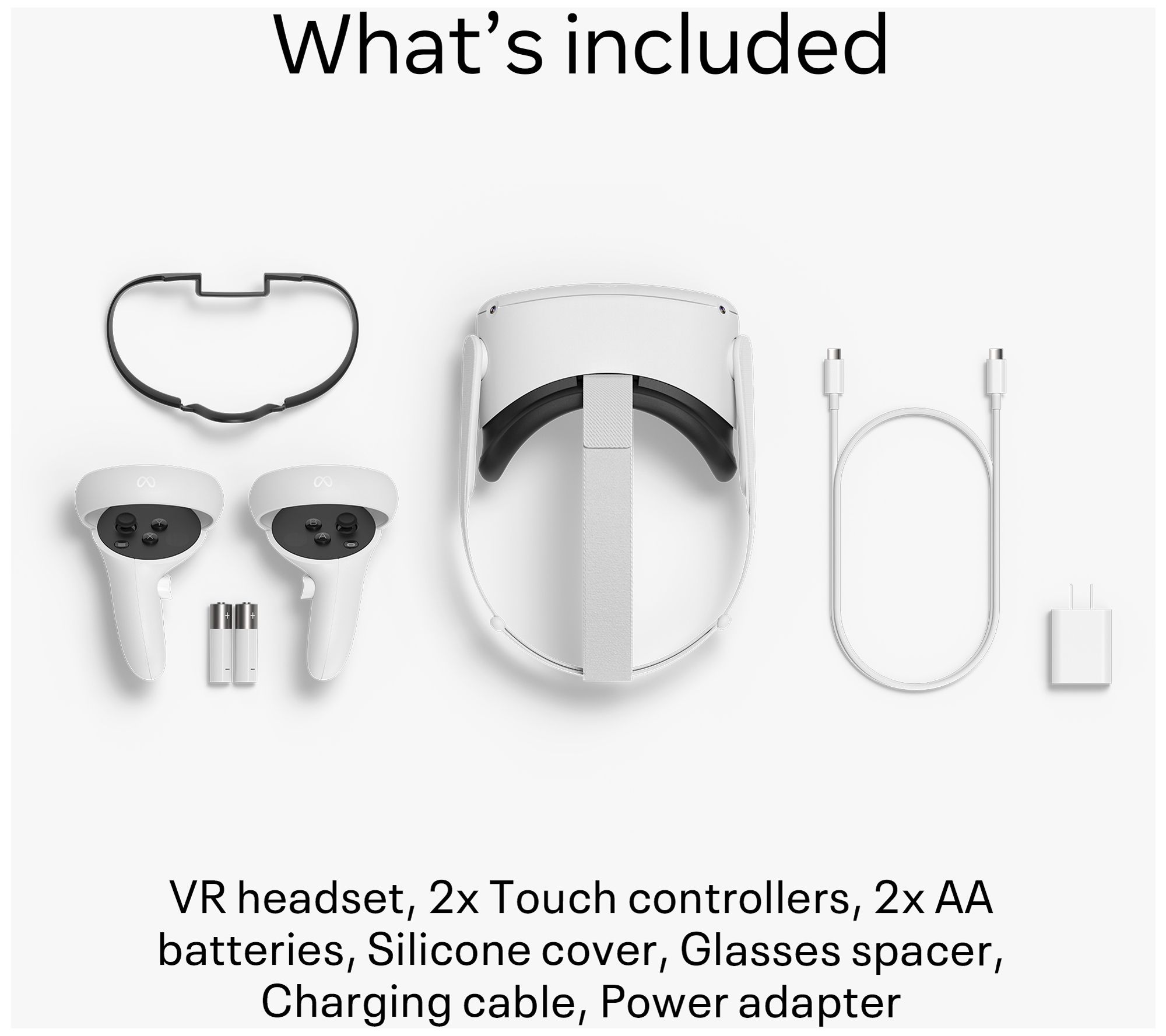 • Includes Quest 2 VR headset, left and right Touch controllers, 2 AA batteries, power adapter, charging cable, glasses spacer, silicone cover, and Elite Strap