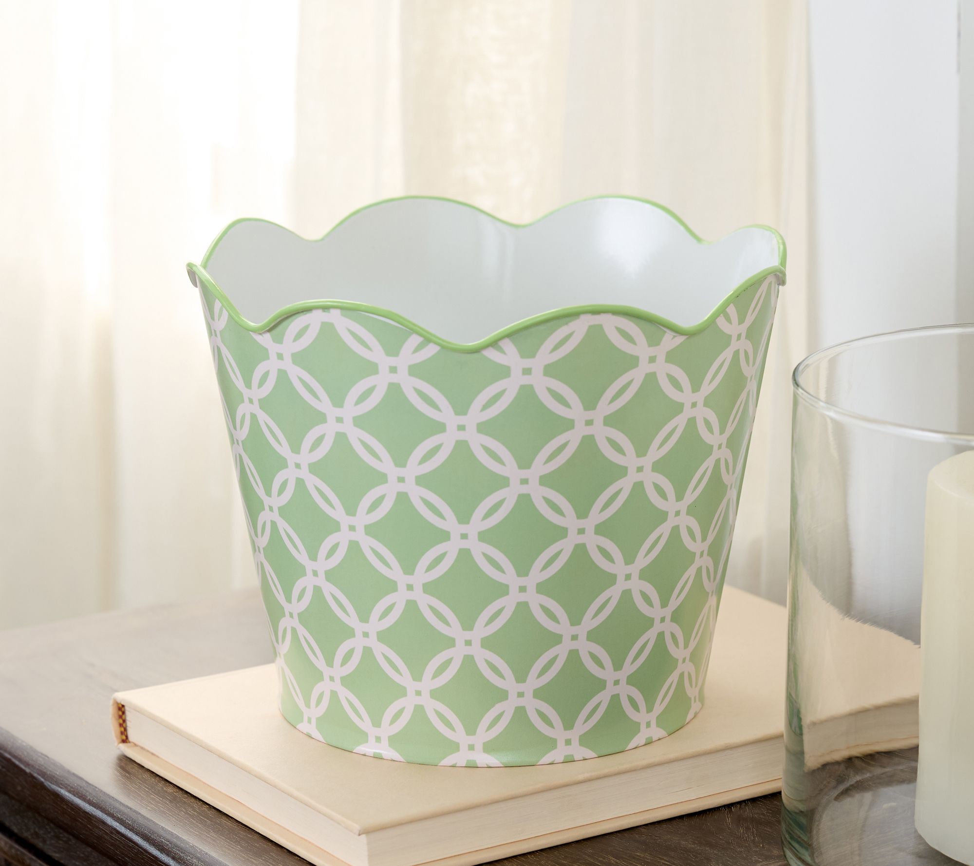 Fill that empty side table or book nook with something really special from Valerie Parr Hill. This metal pot features an eye-catching interlocking pattern and sweetly scalloped edge, making it the perfect accent for any indoor space. (Fill it with rolled hand towels in a guest bath for a spa-like touch.) From the Valerie Parr Hill Collection.