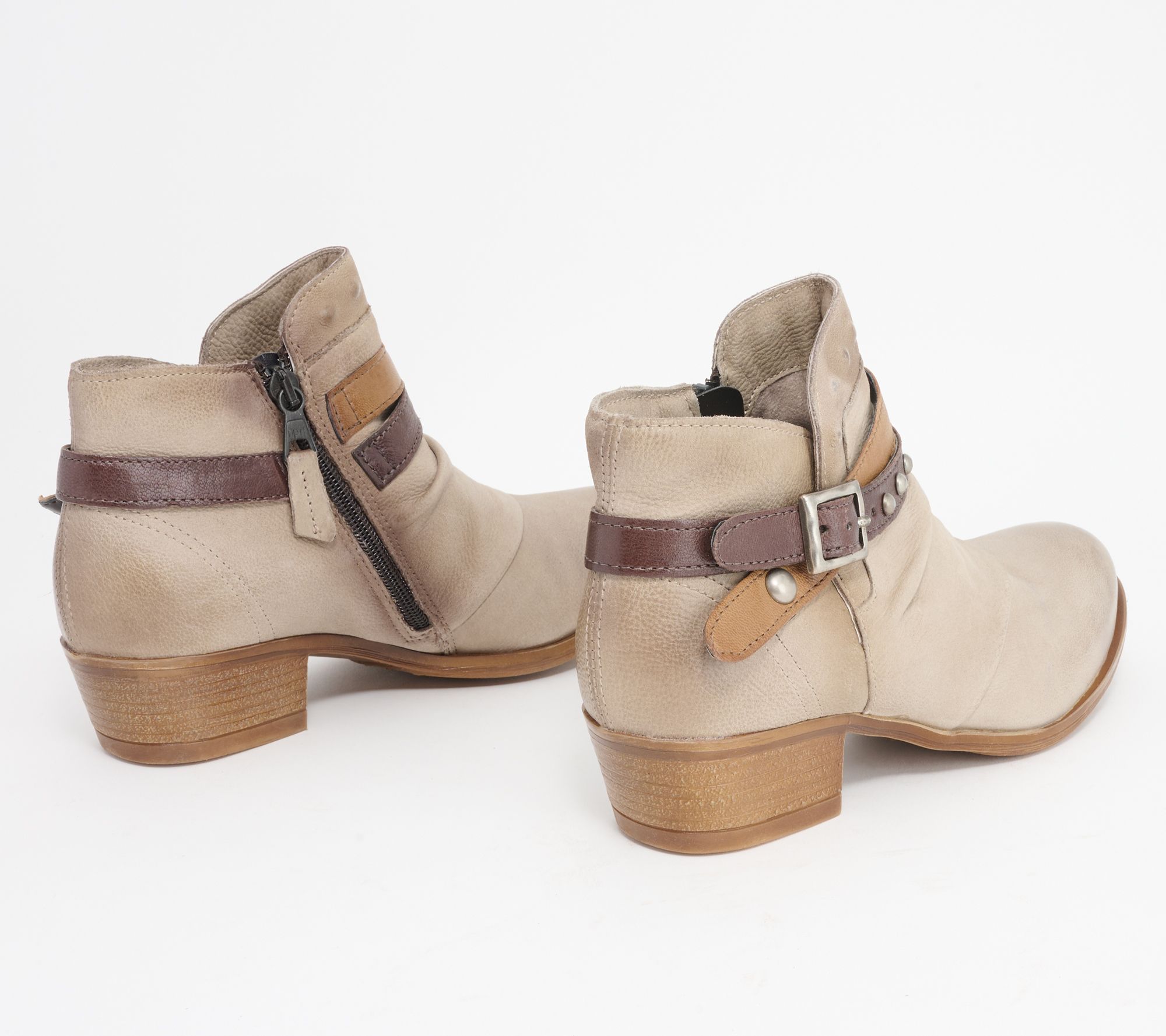 Fabulous from every angle, these European leather ankle boots have a multi-colored belt design for added style. From Miz Mooz.
