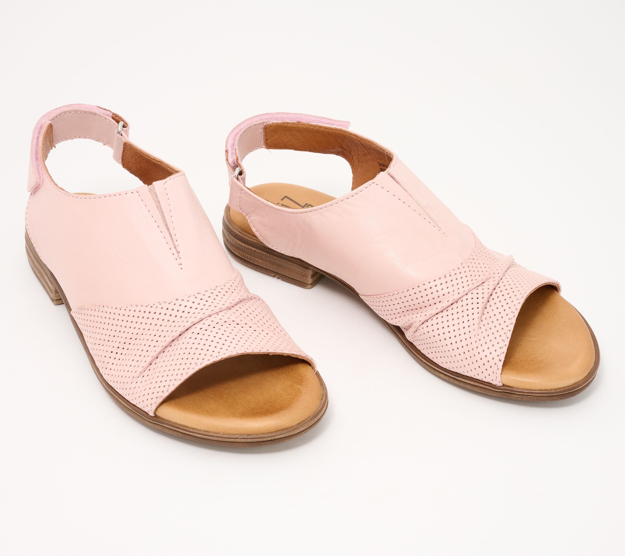 • European leather upper, adjustable hook-and-loop back closure, ruched and perforation detail