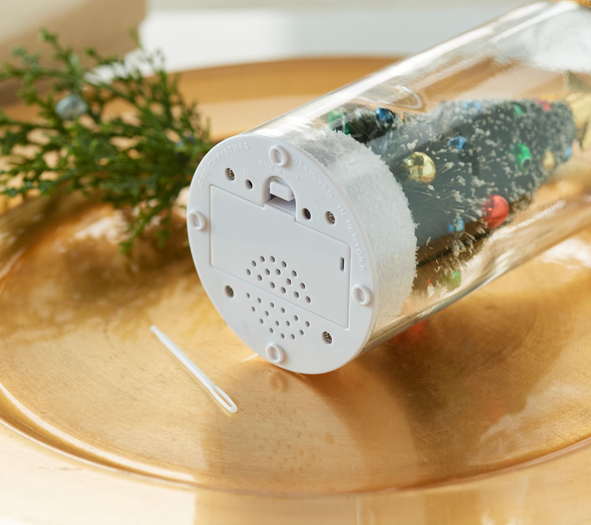 Uncork a merry pre-recorded message within this glass bottle that dually impresses with an interior, decorated Christmas tree. From Mr. Christmas.