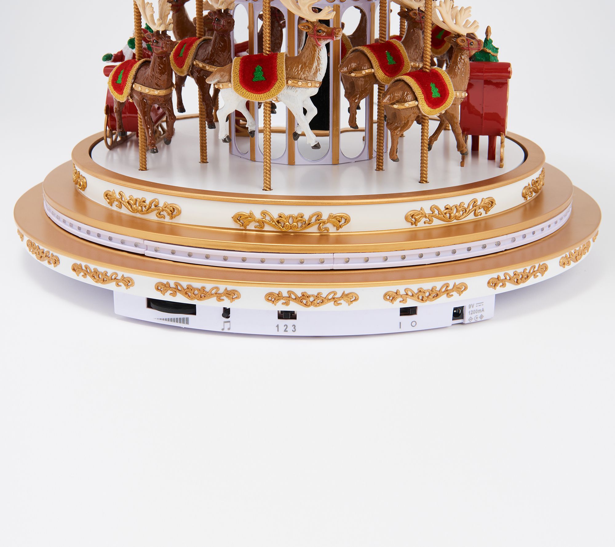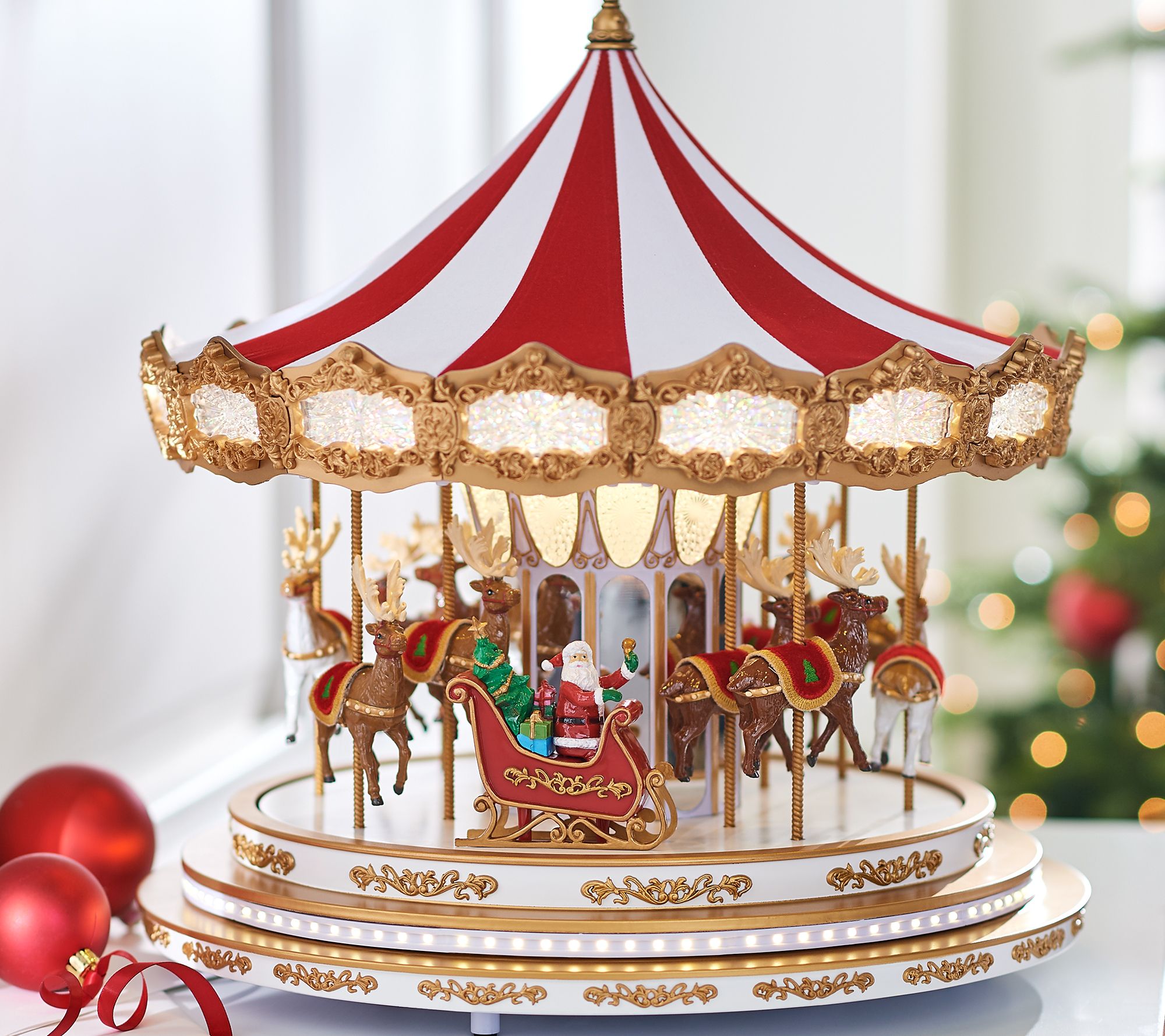 Hop aboard for a fun-filled musical ride at Christmas -- or any time of the year. This beautifully decorated and detailed carousel plays a variety of holiday-themed music as the platform circles around. From Mr. Christmas.