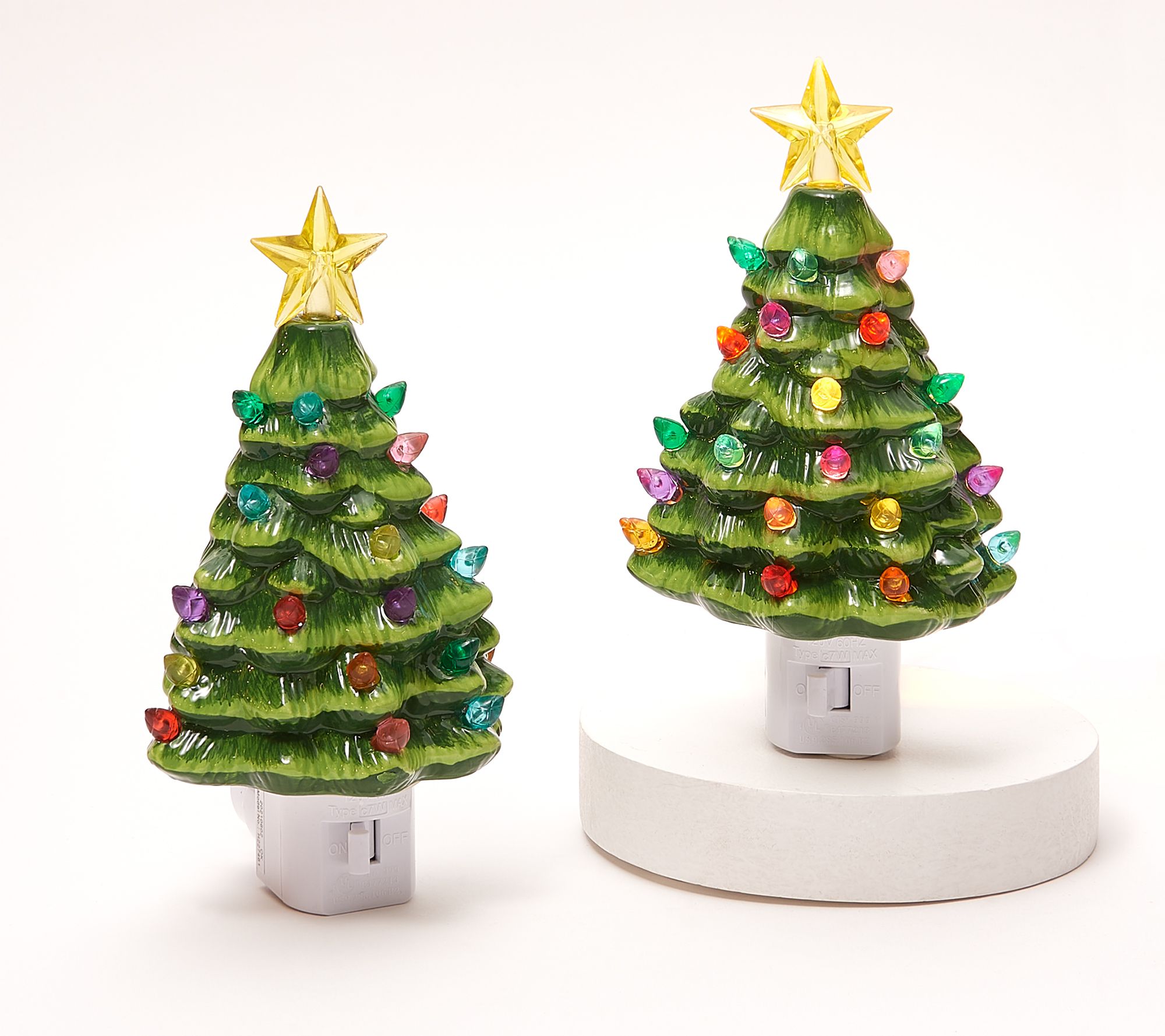 Light the silent night with the incandescent glow radiating from this set of two nostalgic ceramic tree night lights. From Mr. Christmas.