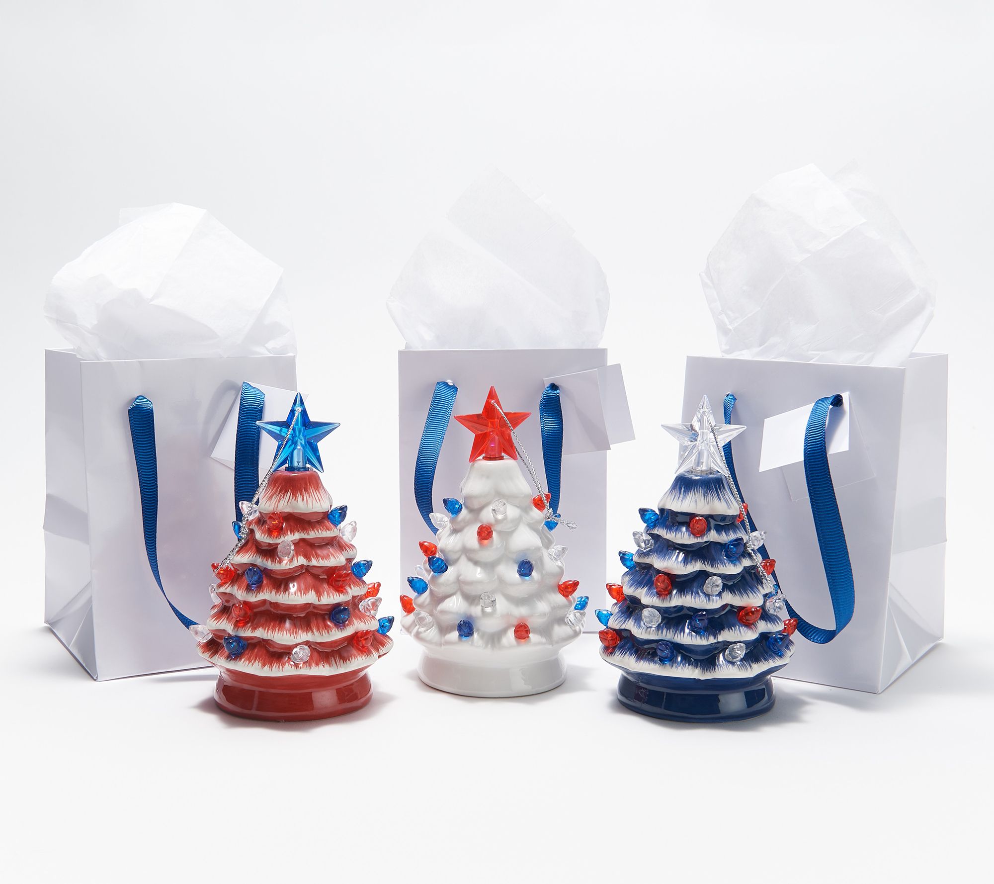 Show your patriotic pride with this set of decorative mini trees, illuminated with red, white, and blue LED bulbs. From Mr. Liberty.