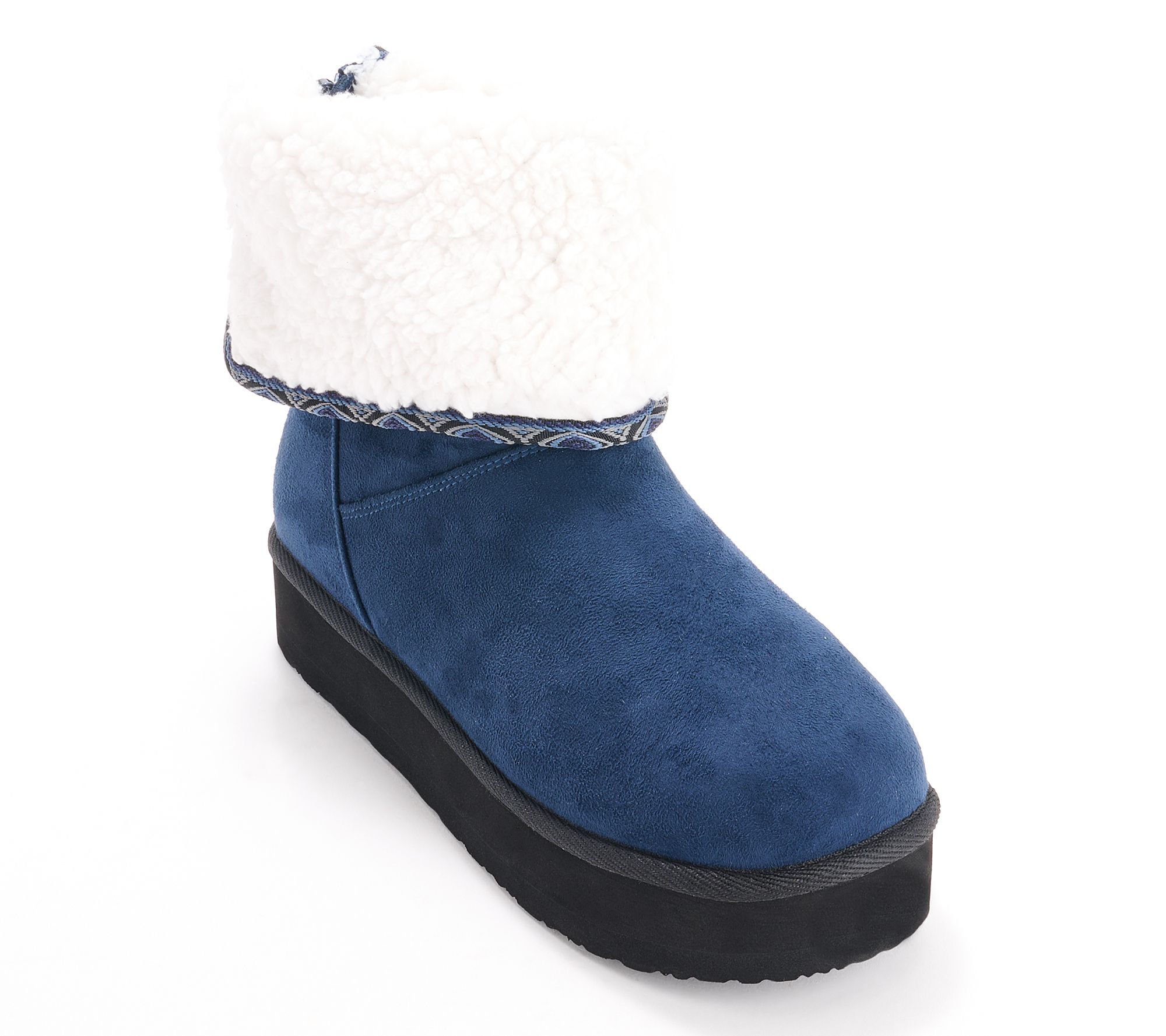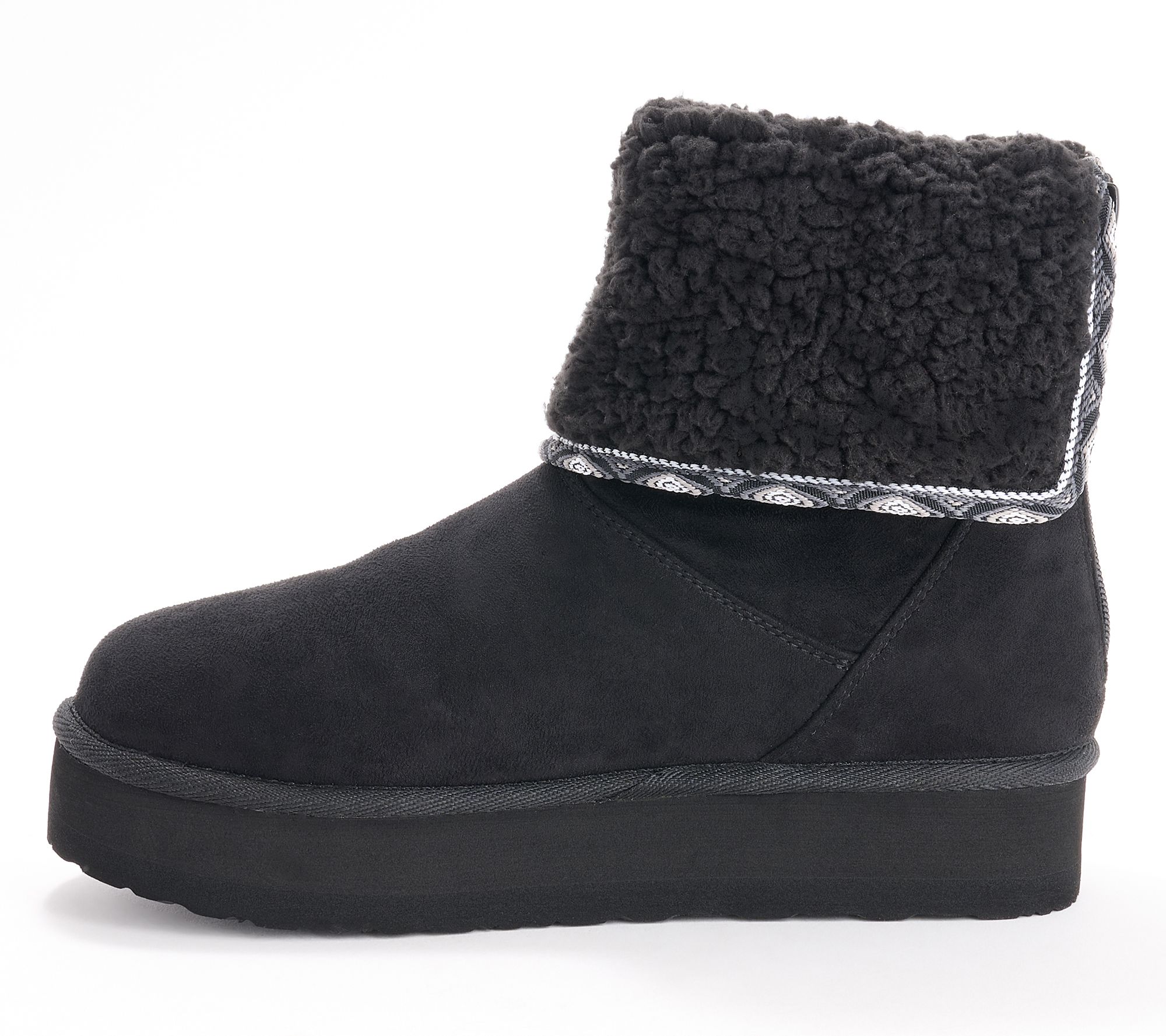 • Faux suede upper, faux fur cuff, decorative trim along opening, back-seam zipper