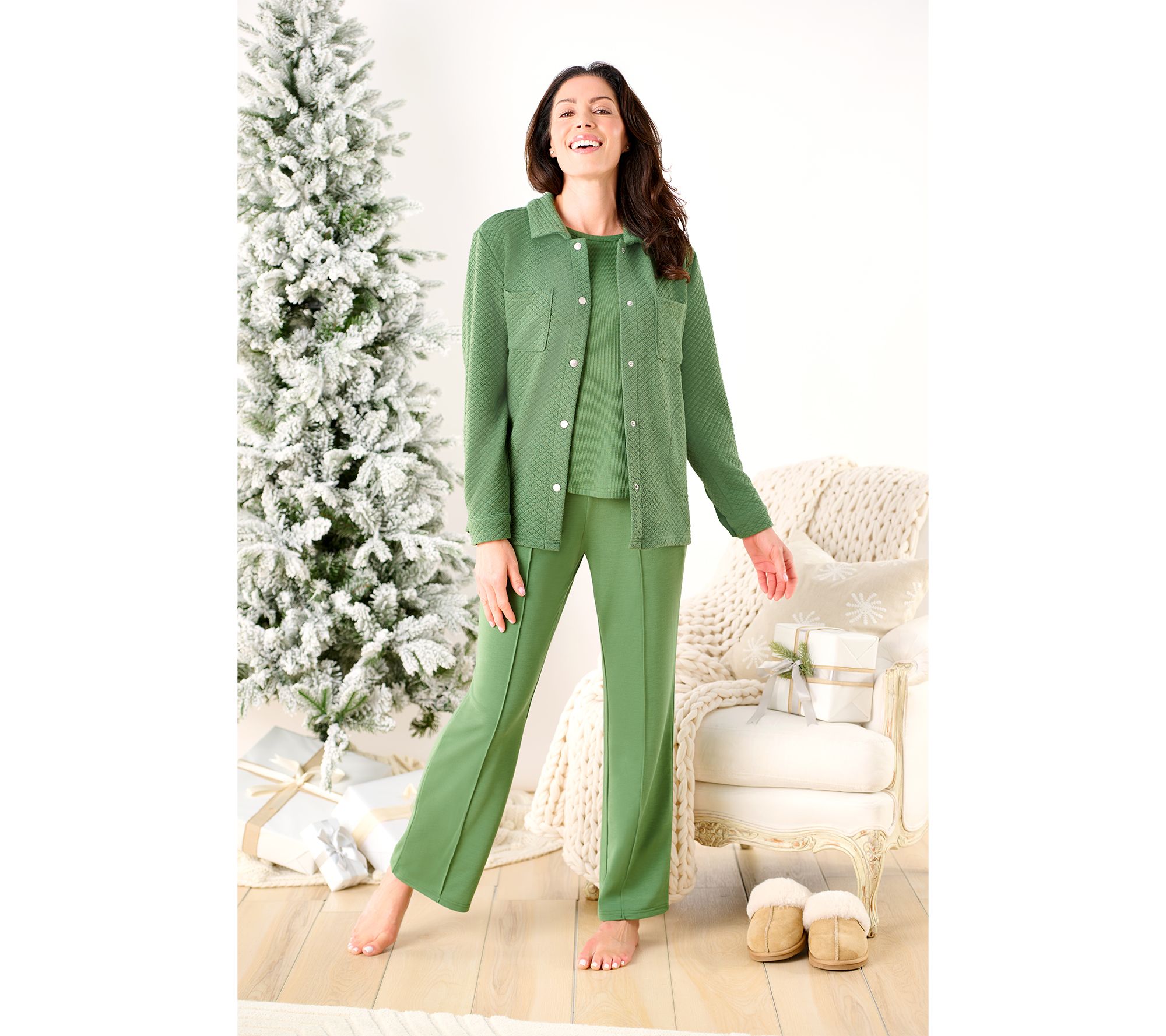 Lounge all you want, but this set is so much more. Stylish details like fall-forward colors, cute quilting, seamed trouser-like pants, and pockets (on the pants and shacket) make this comfy collection worthy of wearing out. Keep it as a coordinated set or treat it as three separate pieces -- the shacket alone makes a great grab-and-go layer for errands, outdoor activities, and (of course) cozying up on the couch on chilly winter nights. From MUK LUKS.