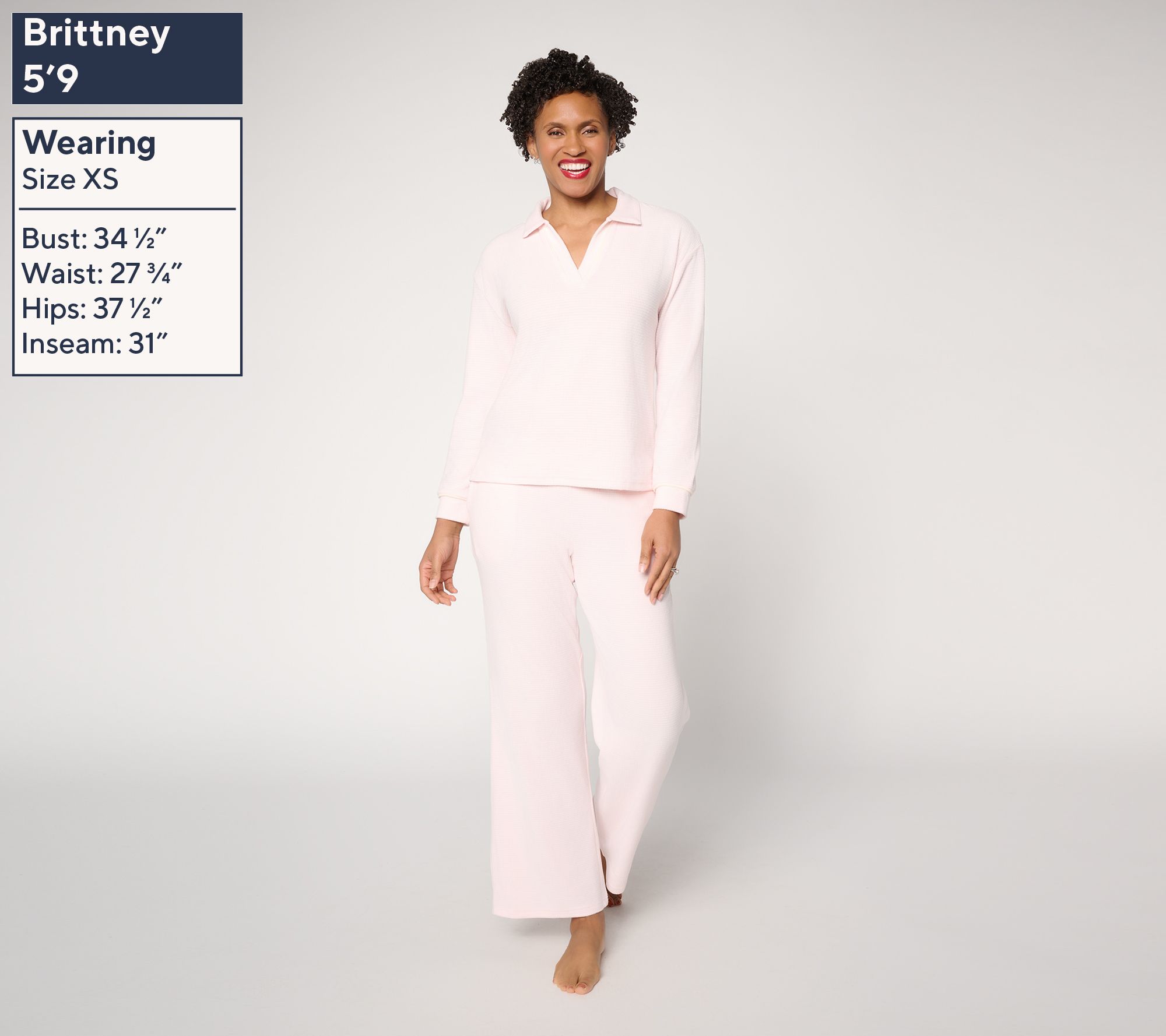 Whether you're winding down after a busy day or easing into the weekend, this boucle lounge set brings snuggly comfort and trend-right style together in one cozy combination. With a V-neck top, flared-leg pants, and a graceful silhouette, it's designed for laid-back moments at home, from movie nights to morning routines. From MUK LUKS.