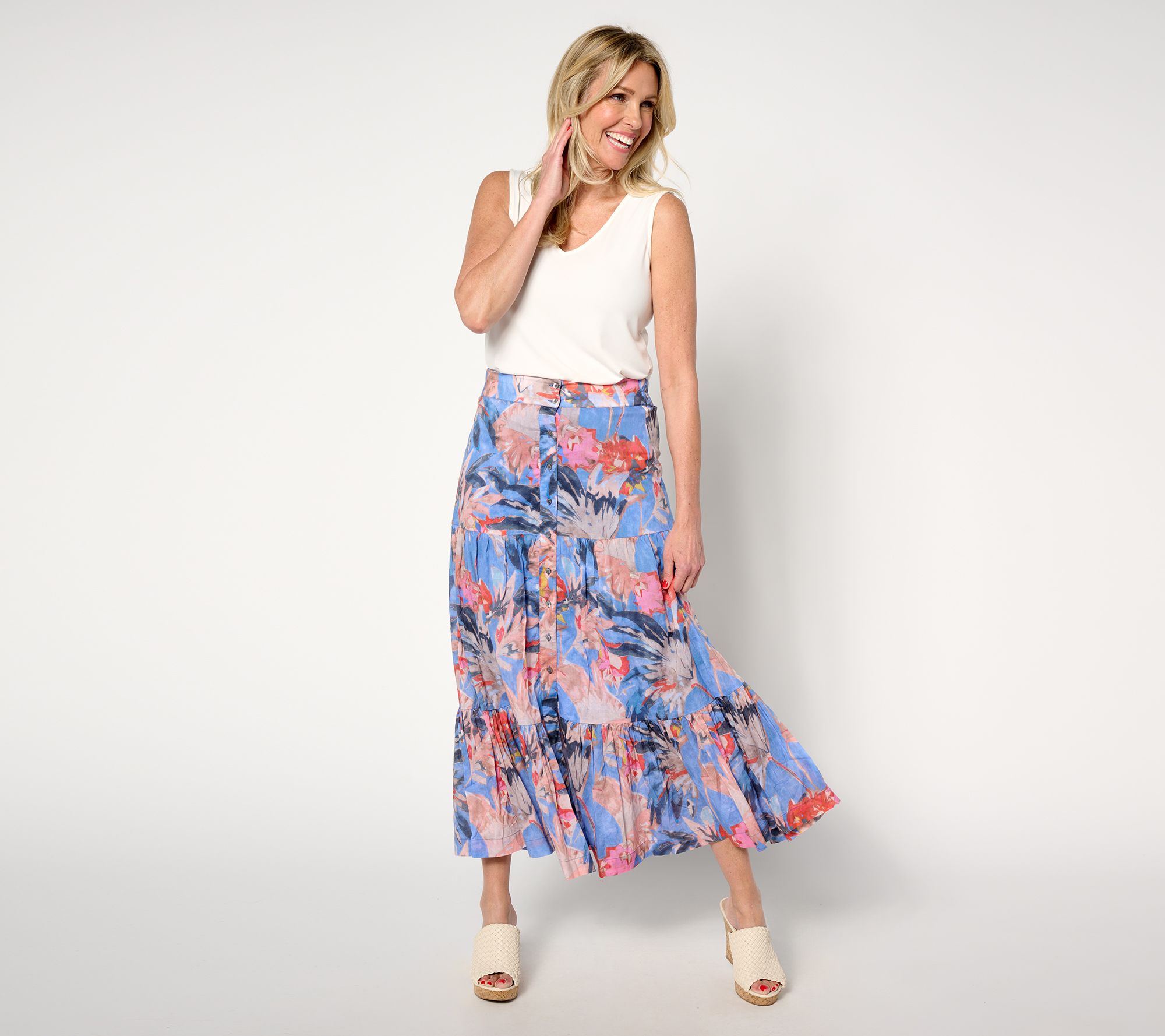Don this colorful tiered skirt and exude Bohemian flair. The eye-catching print and button detail makes this look a keeper, while an A-line silhouette flatters every figure. From NIC + ZOE.