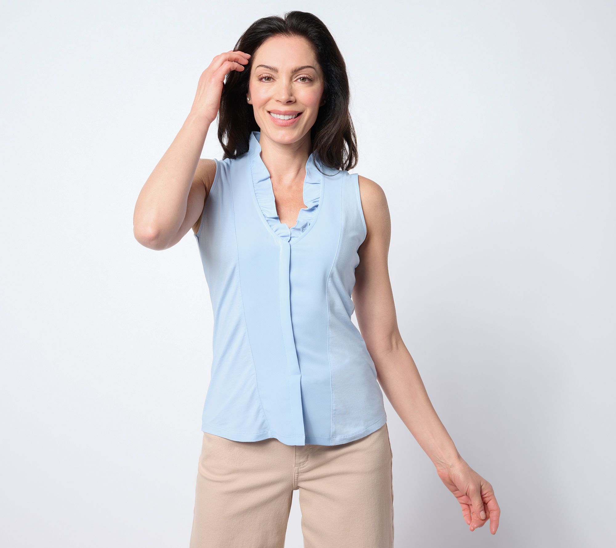 Whether it's nine-to-five or after five, this ruffled tank works overtime at adding a playfully polished look to trousers, skirts, and even shorts. The V-neckline and sleeveless design make it perfect for layering or wearing on its own. From NIC+ZOE.