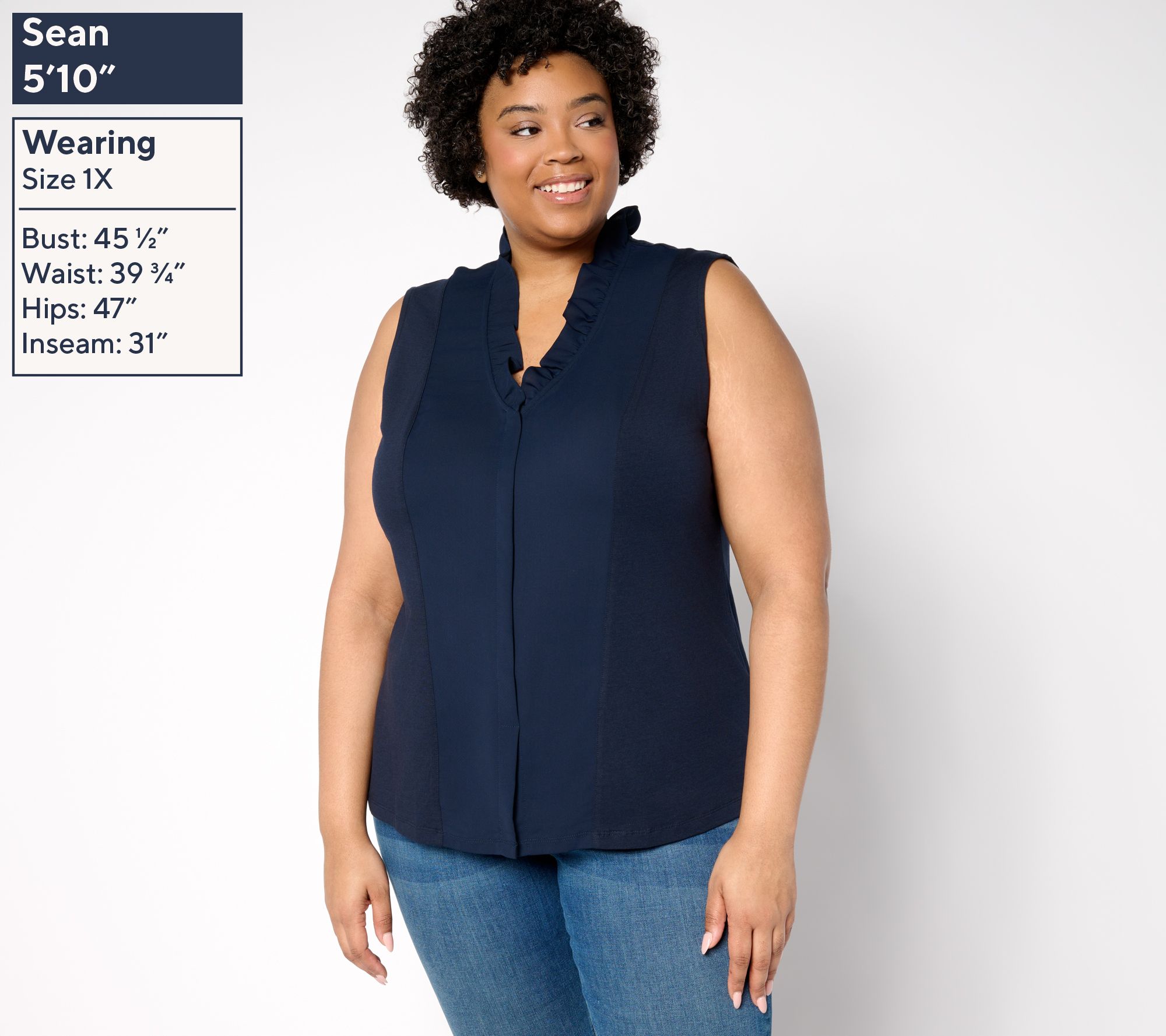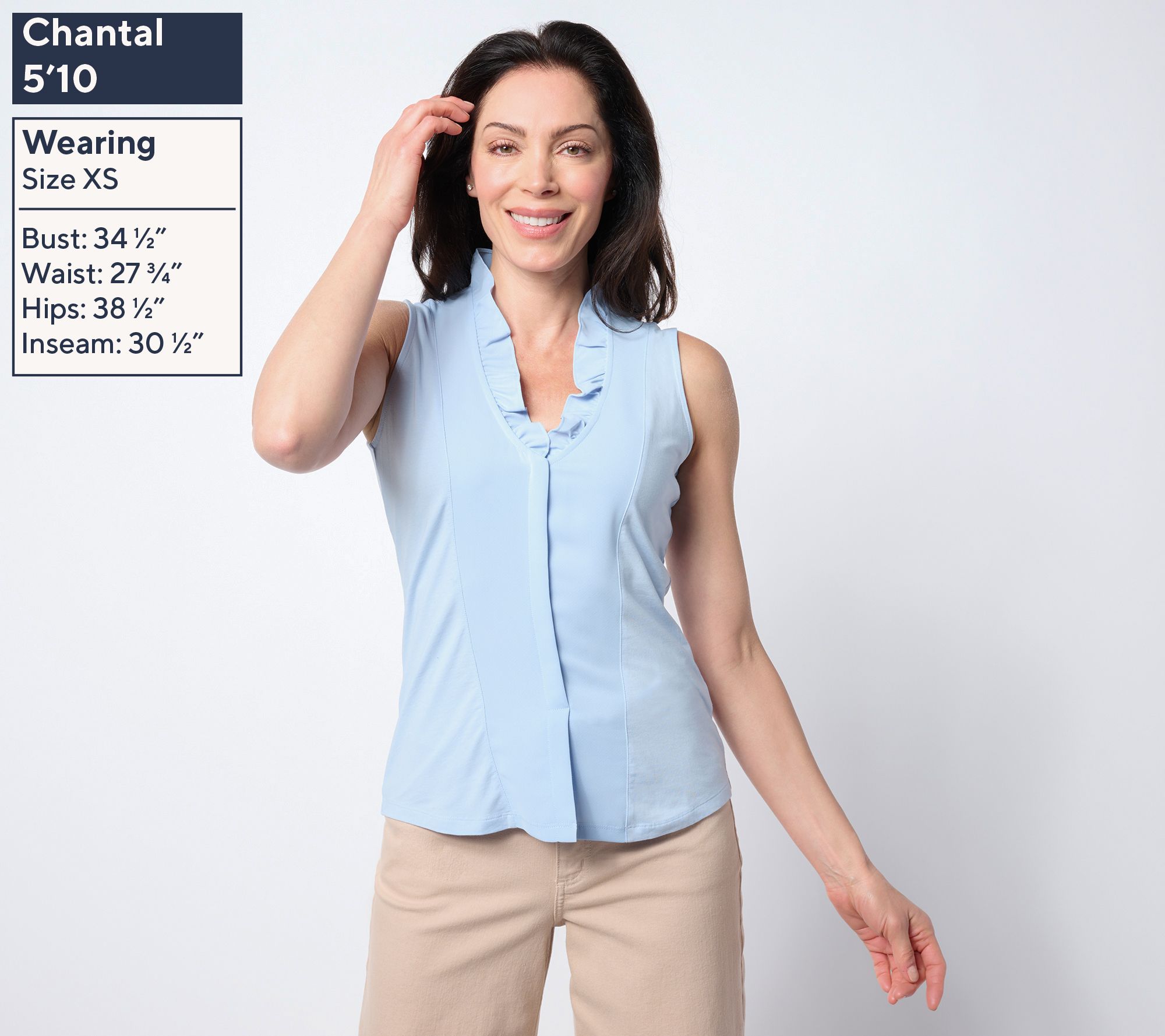 • Features: woven front panel with ruffle at V-neckline, sleeveless