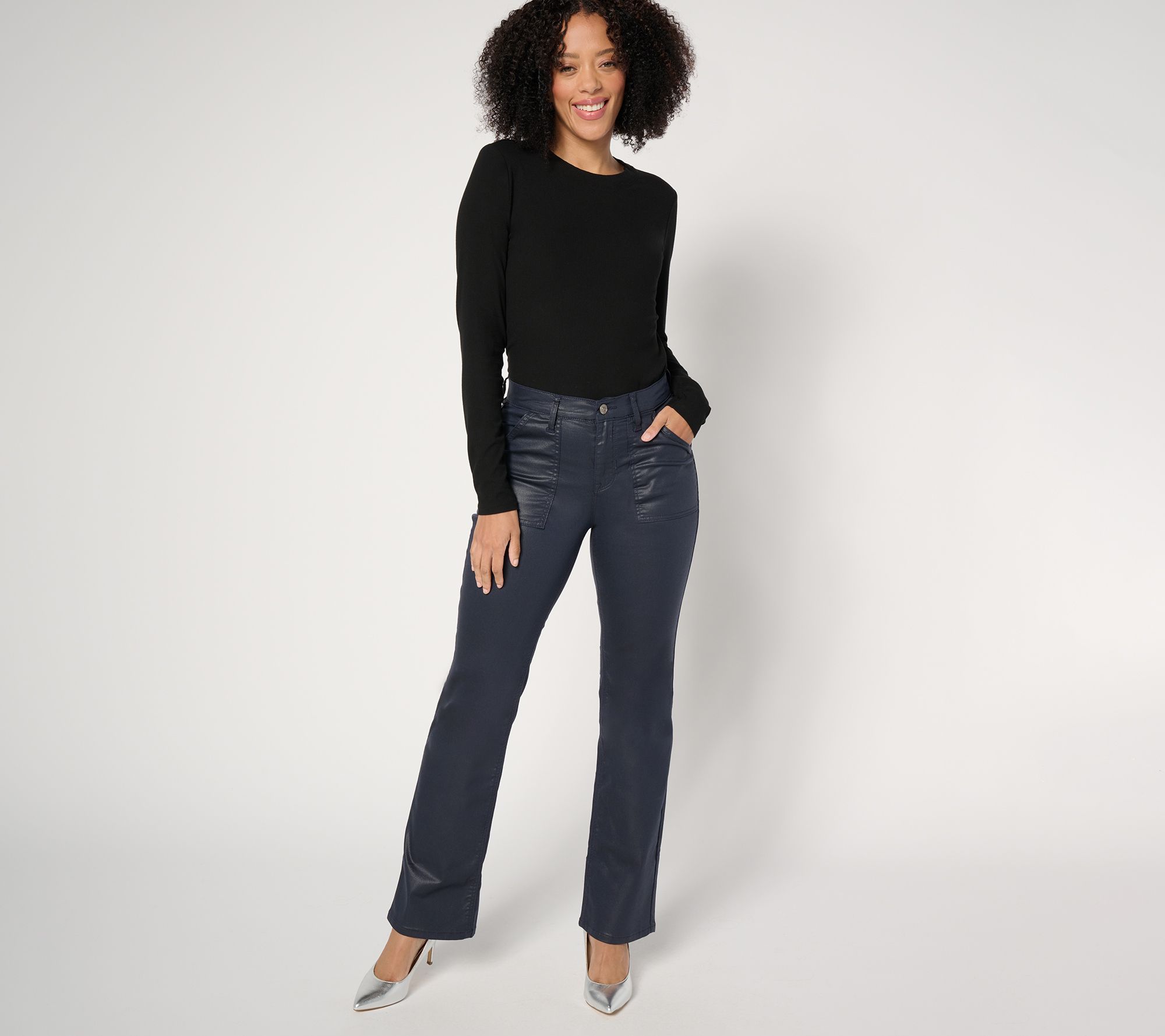 The coolest thing to happen to denim since acid washing, these coated boot-cut jeans are ready to party -- or just put the yay in your Friday! From nicole by Nicole Miller.