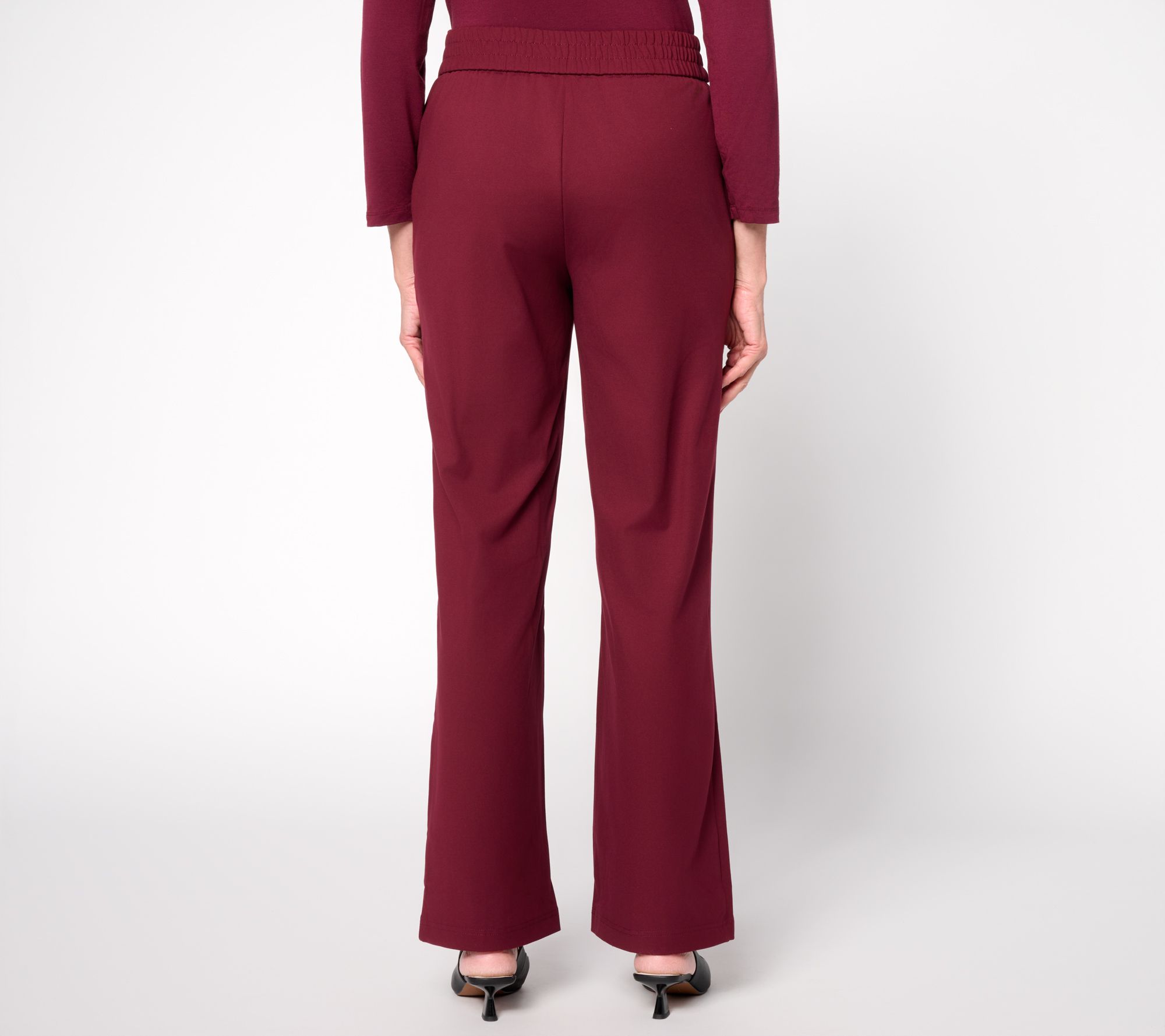 Whether heading to lunch with friends or settling in for a productive afternoon at work, these knit straight-leg pants offer a streamlined look that moves effortlessly through your day. The pull-on style with a flat front waistband and back shirring keeps comfort at the forefront, while side pockets provide added convenience for essentials. From nicole by Nicole Miller.