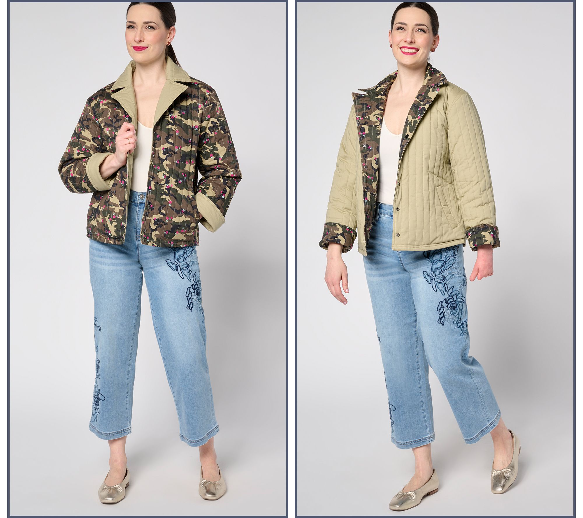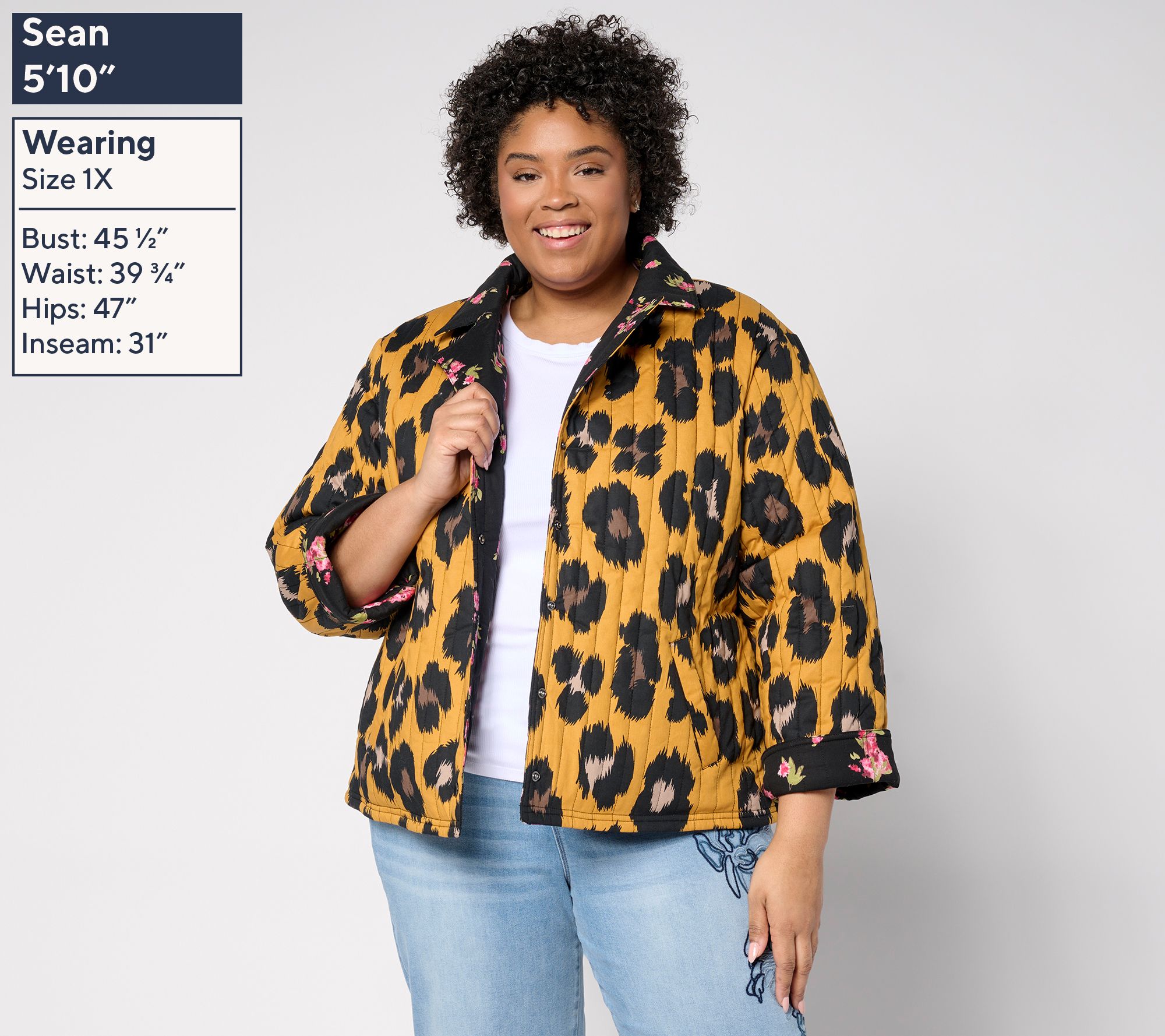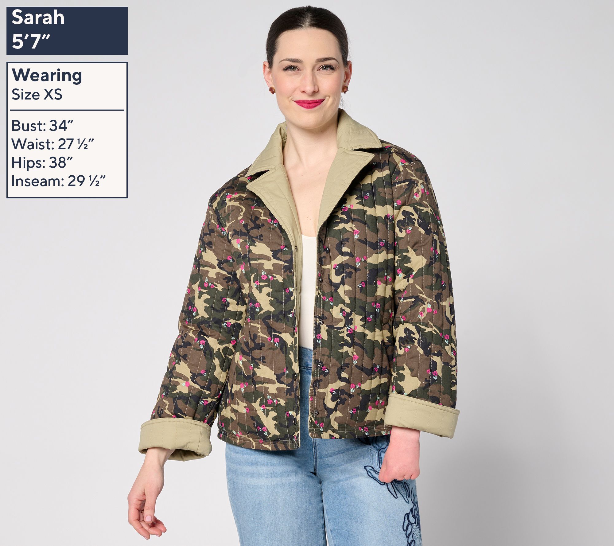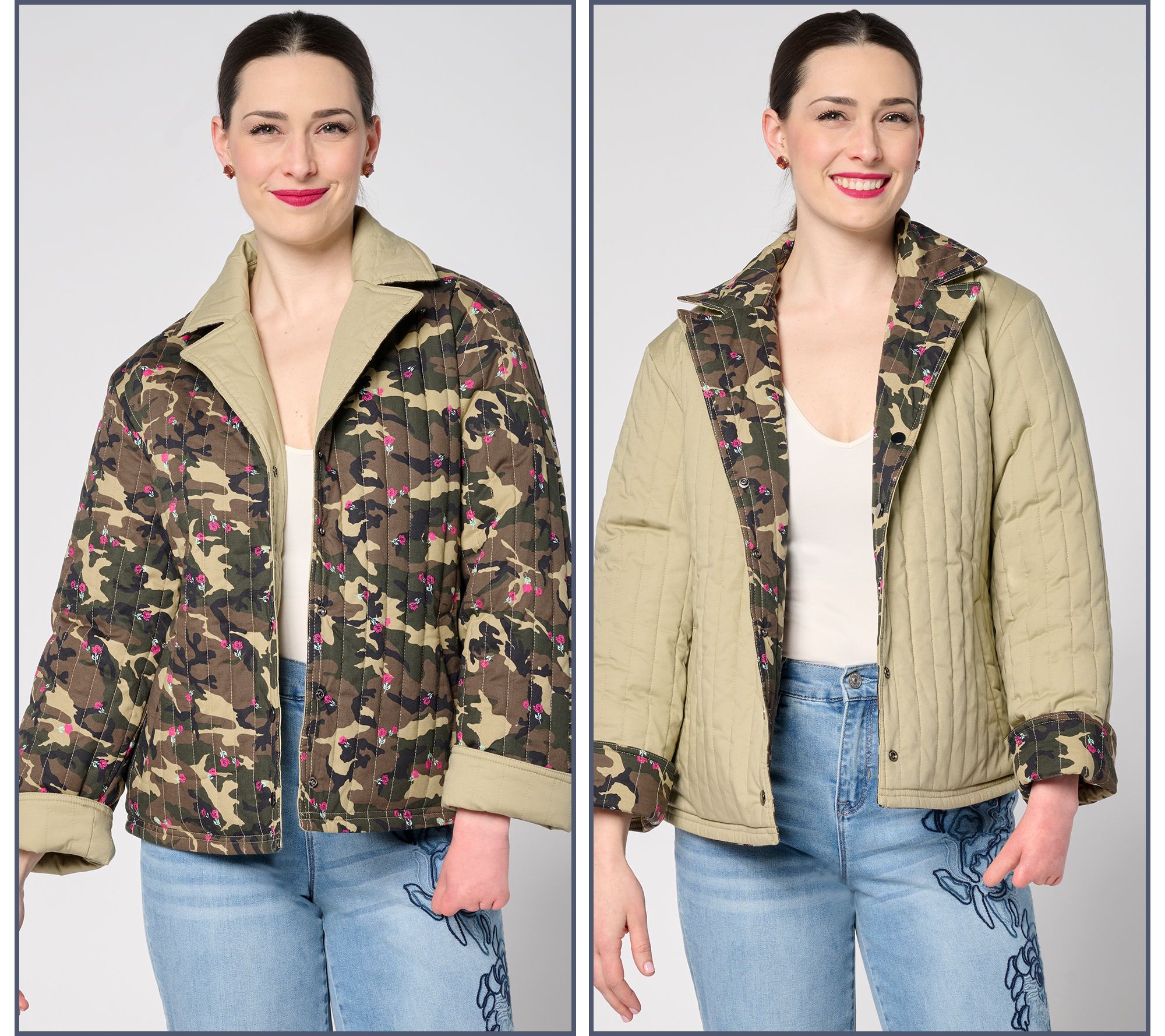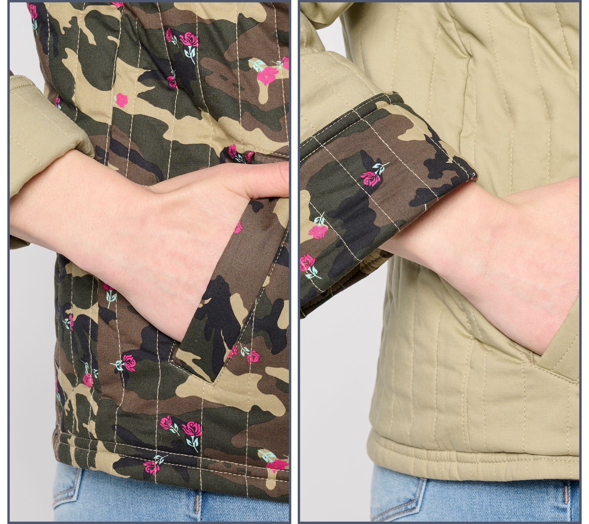 • Features: quilted, printed, reversible design, notched collar, long sleeves, cuffs, vertically sewn allover topstitching