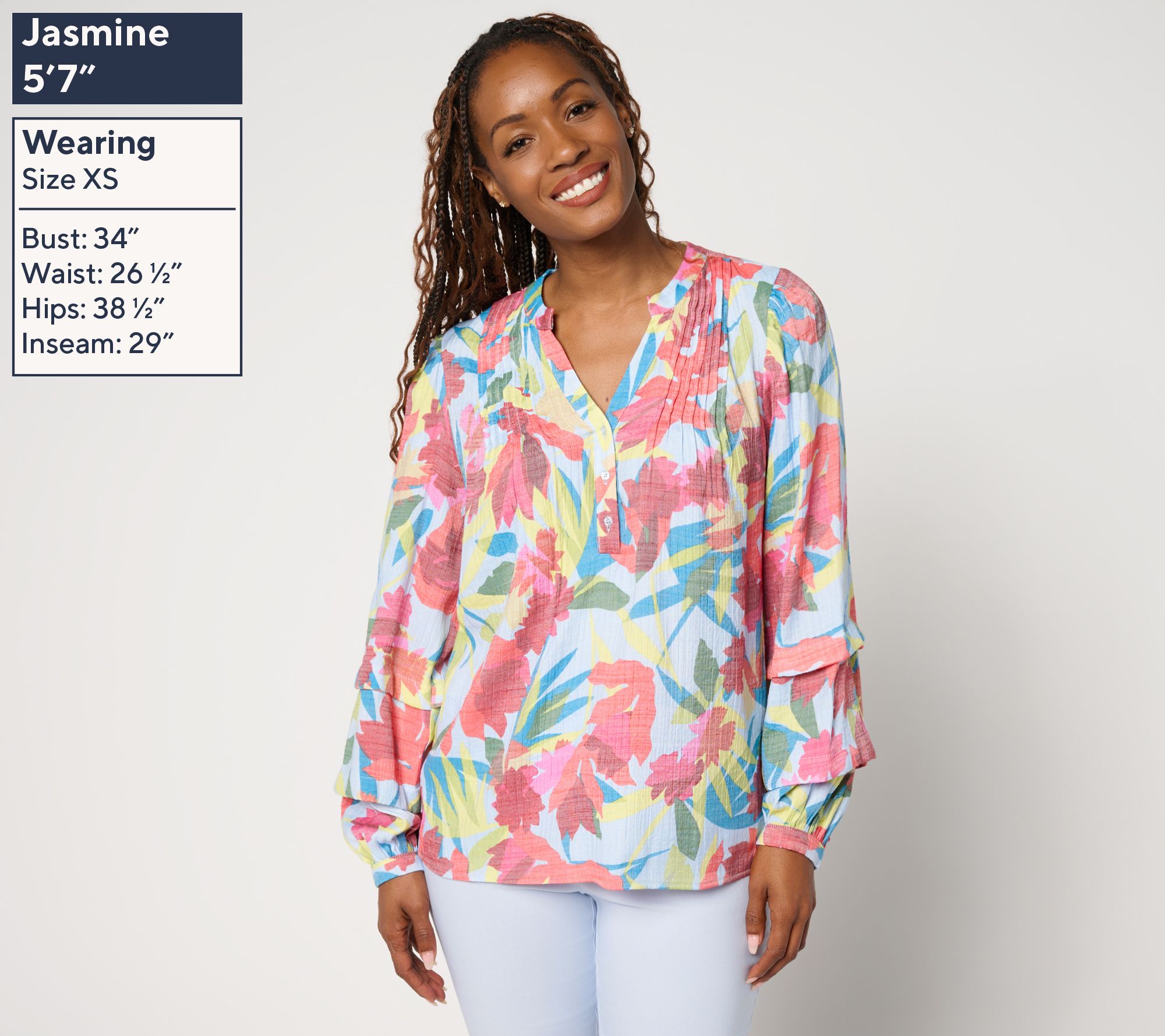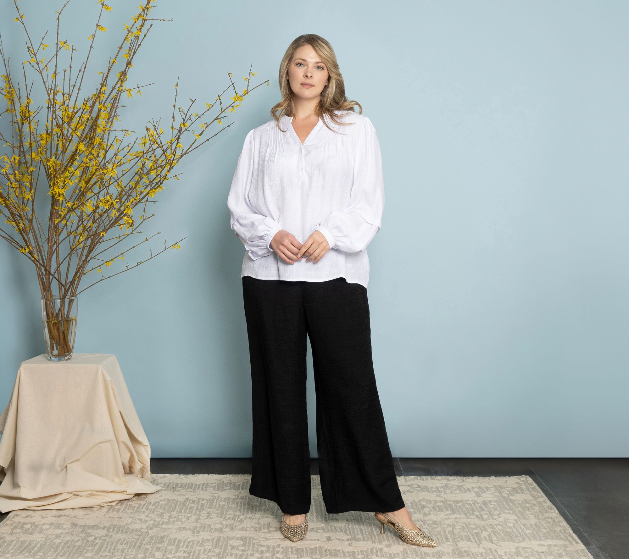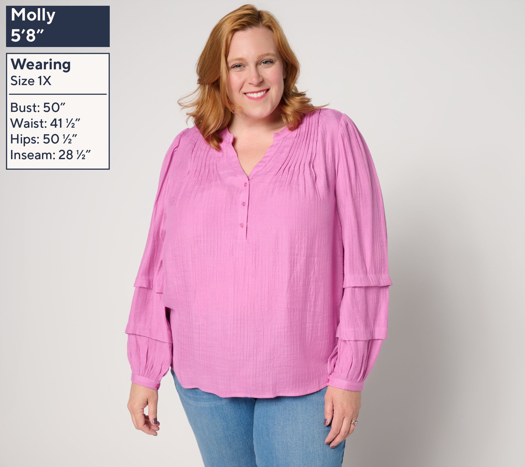 • Features: henley button-front split neckline, pleating from shoulder to bust, shirred shoulder caps and back yoke, blouson sleeves with fold detail, button cuffs