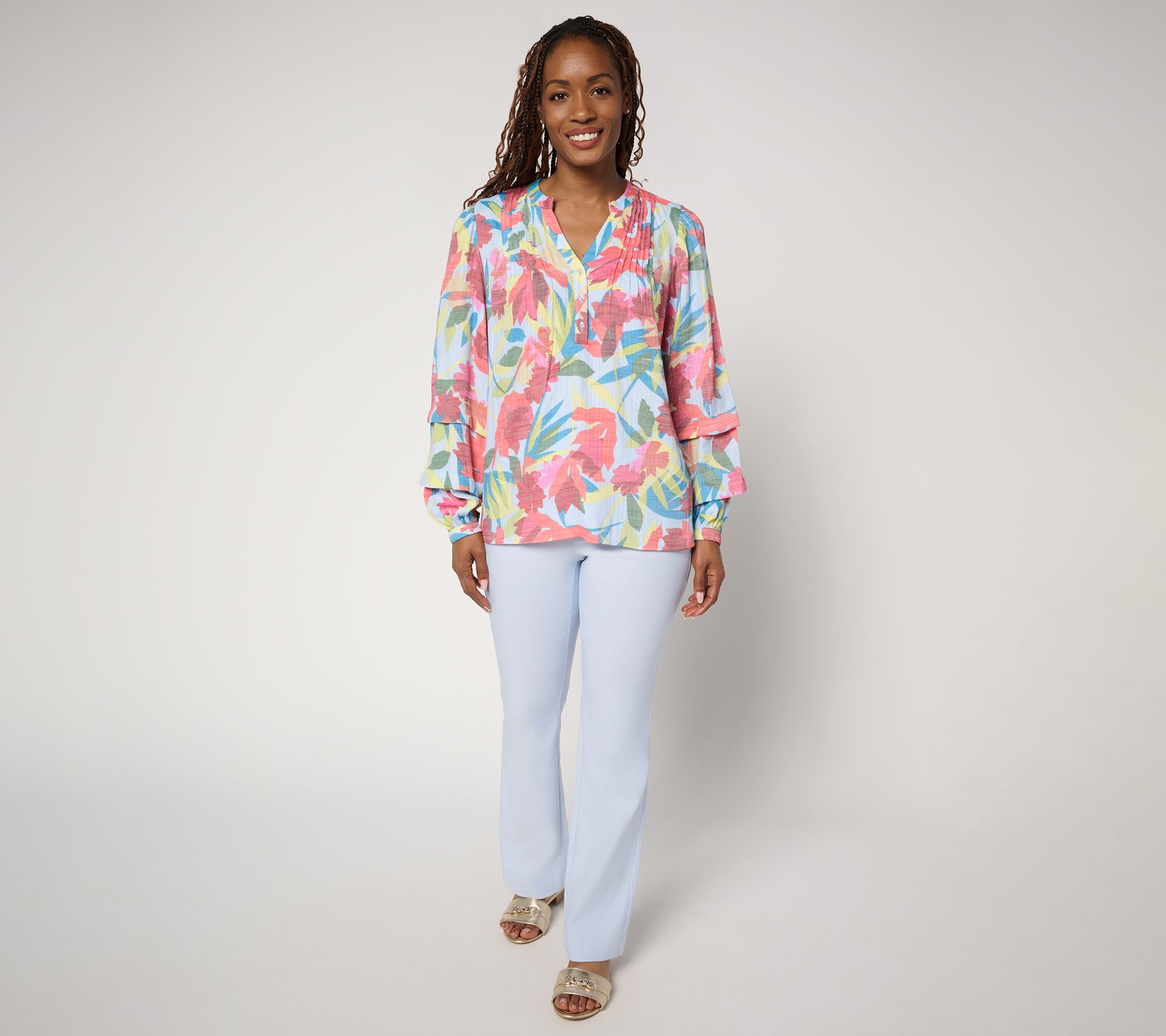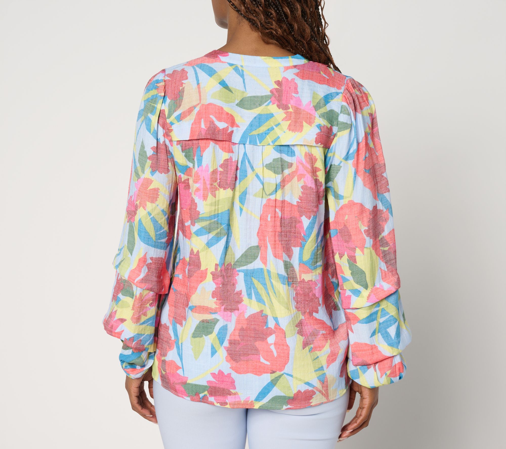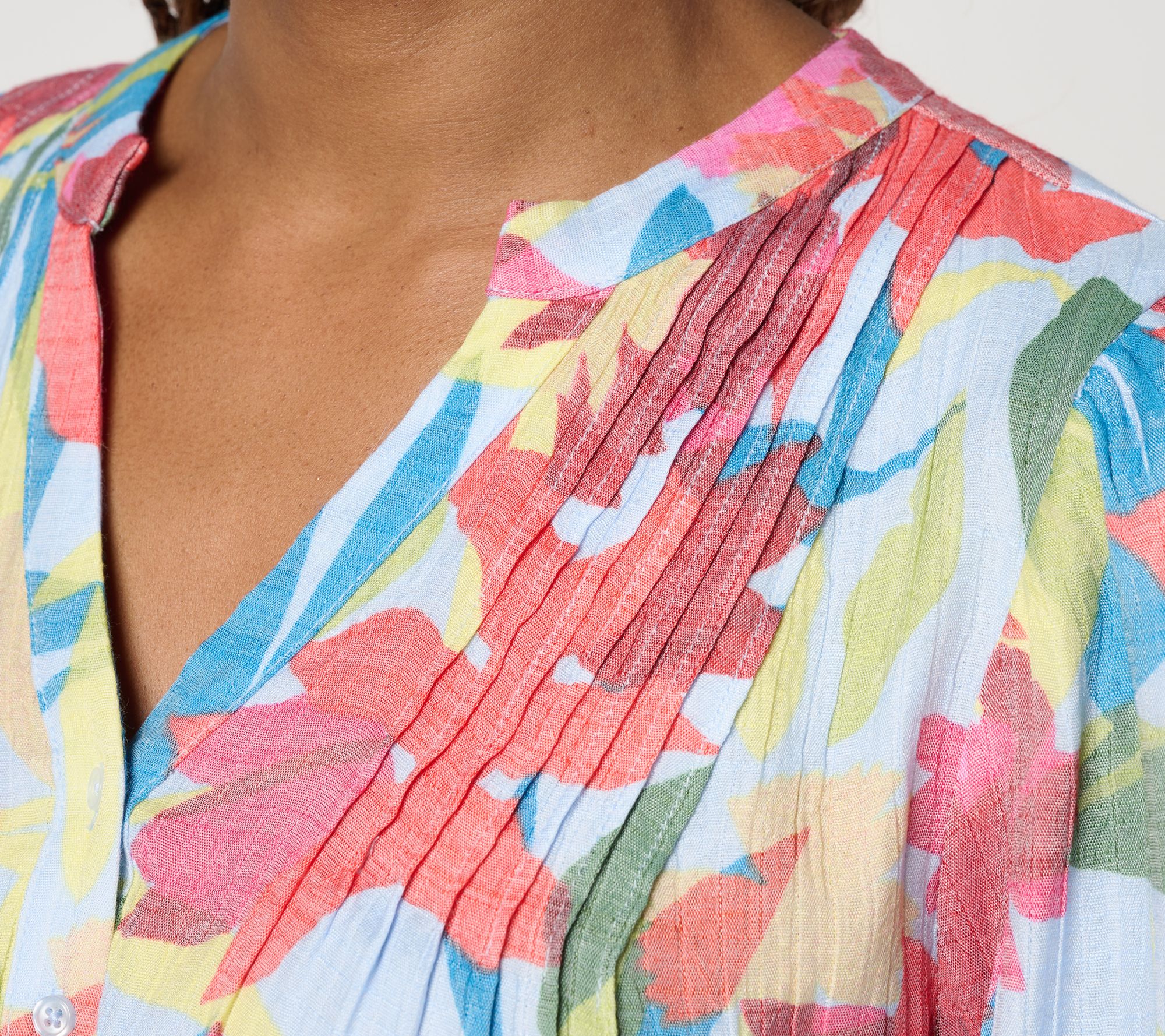 • Features: henley button-front split neckline, pleating from shoulder to bust, shirred shoulder caps and back yoke, blouson sleeves with fold detail, button cuffs