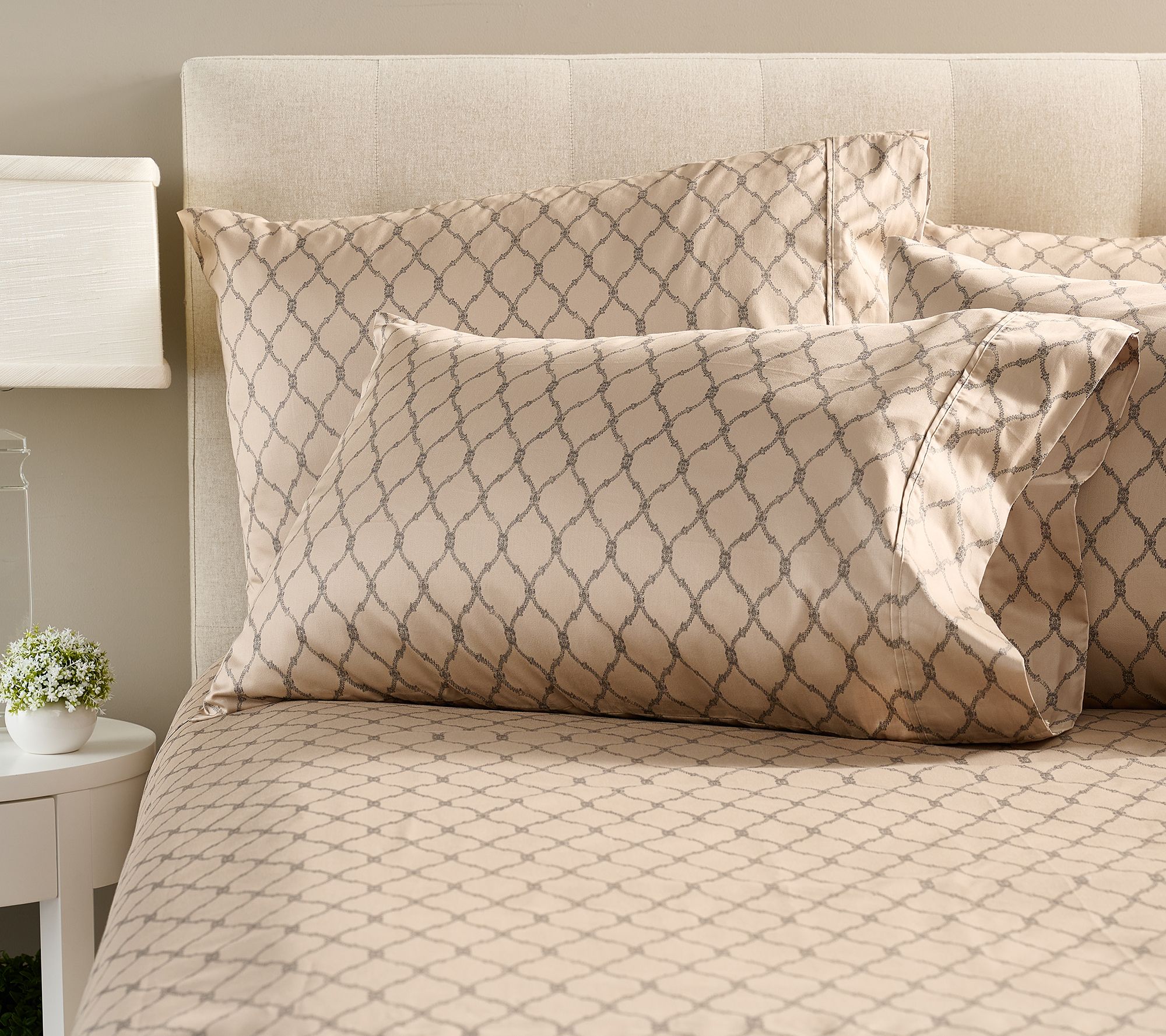 Includes flat sheet, fitted sheet, and four pillowcases; additional items (shown) not included