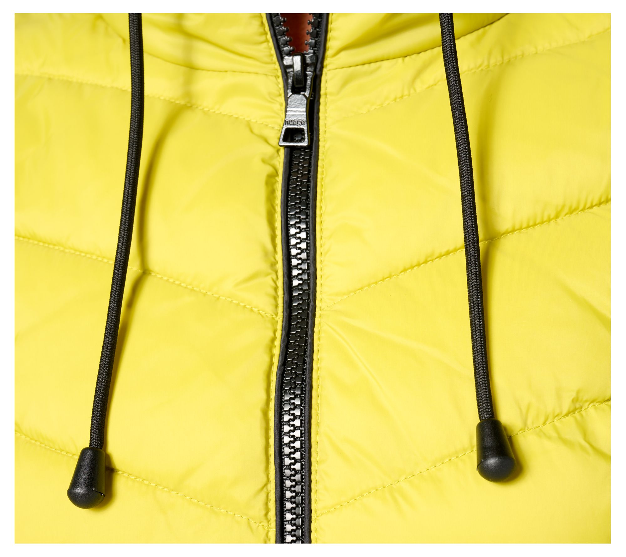 • Features: chevron quilted design, contrast color lining, fixed adjustable hood with drawcord, narrow quilted side panels, pockets, drawcords at hood