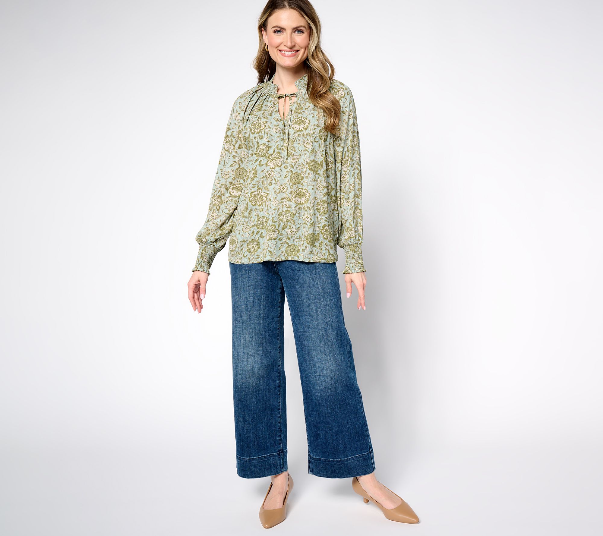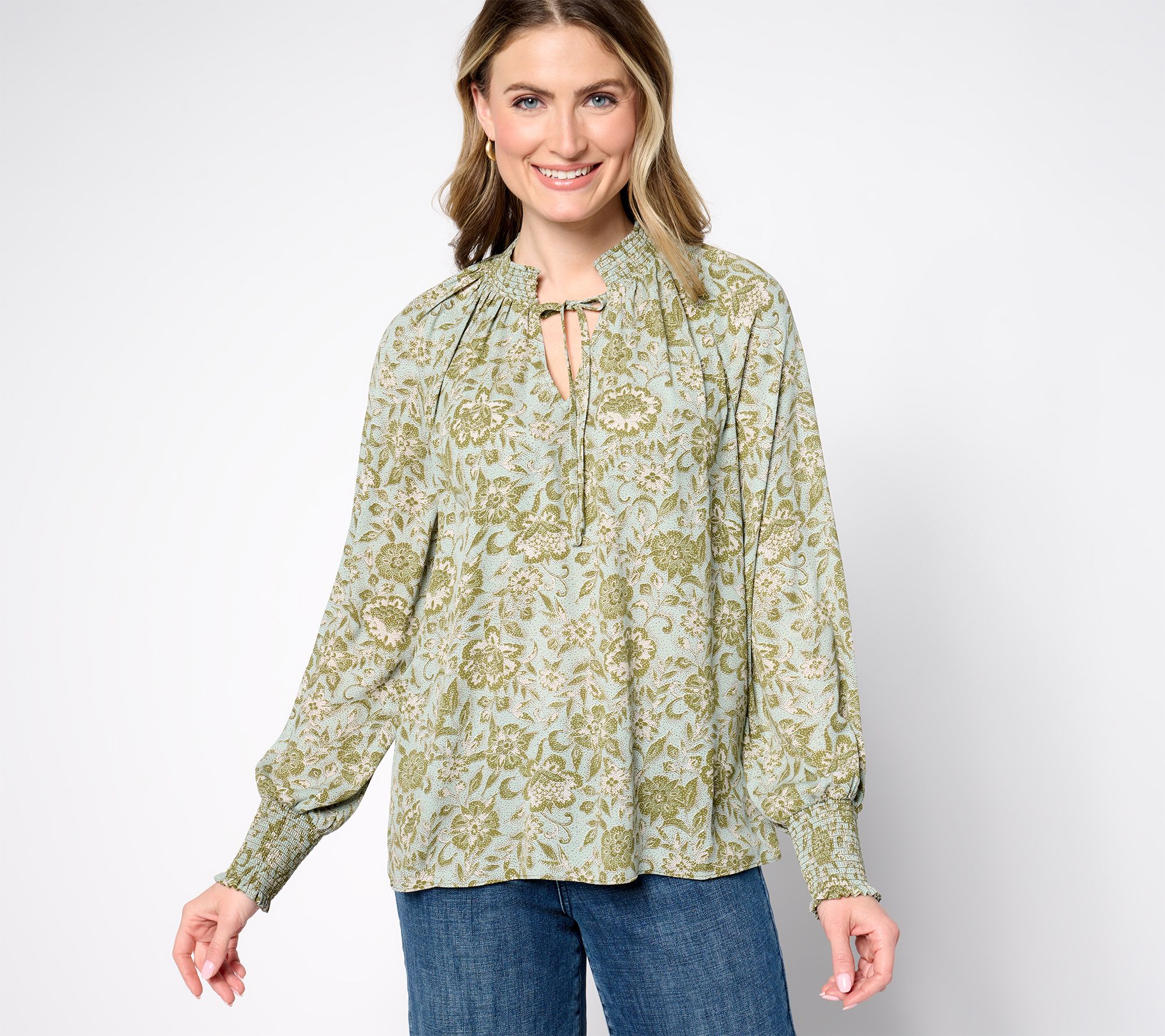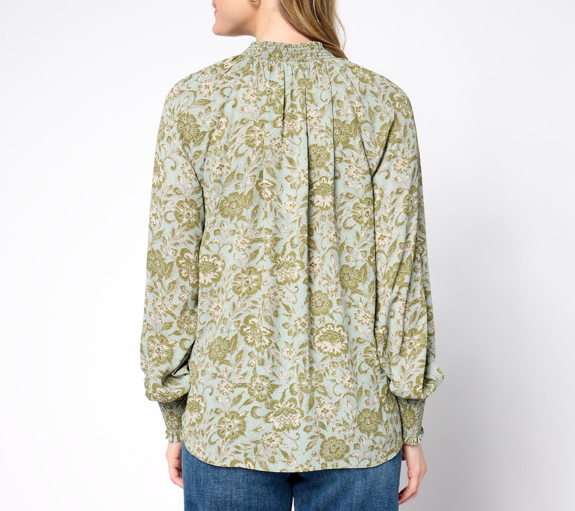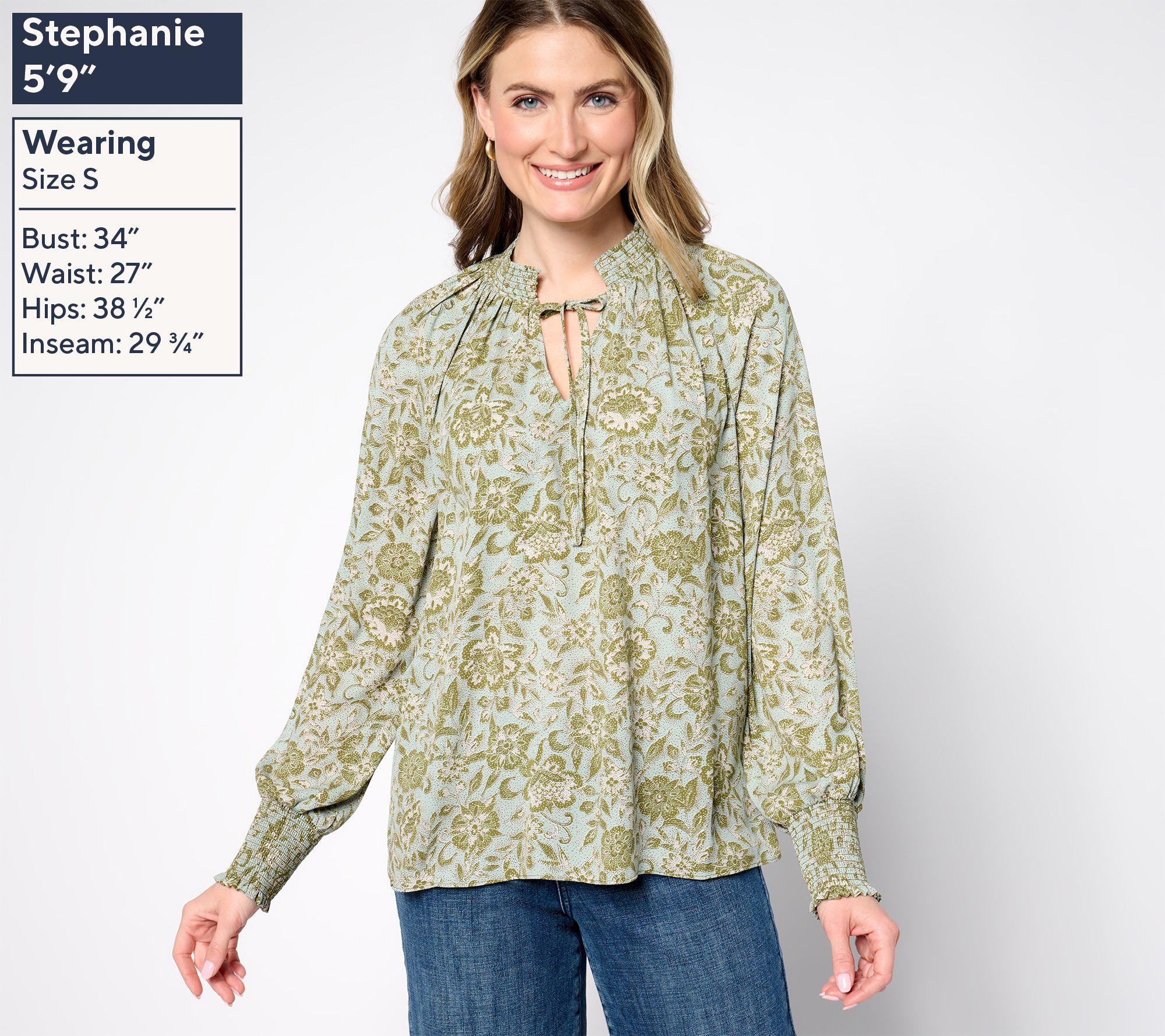 • Features: pullover, stretch smocking at neckline, long full sleeves with stretch smocked cuffs, tie neck, curved hemline, back gathers