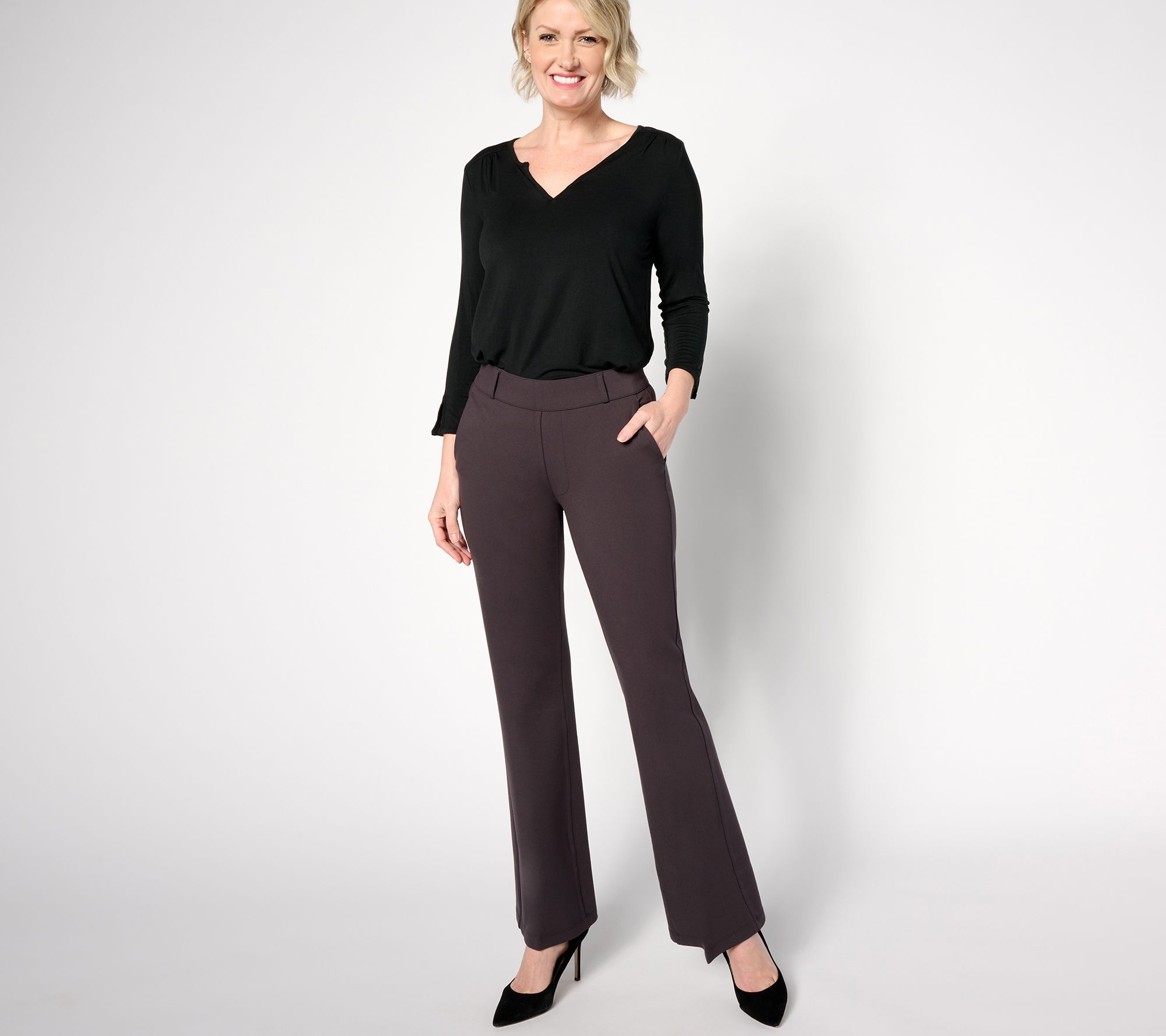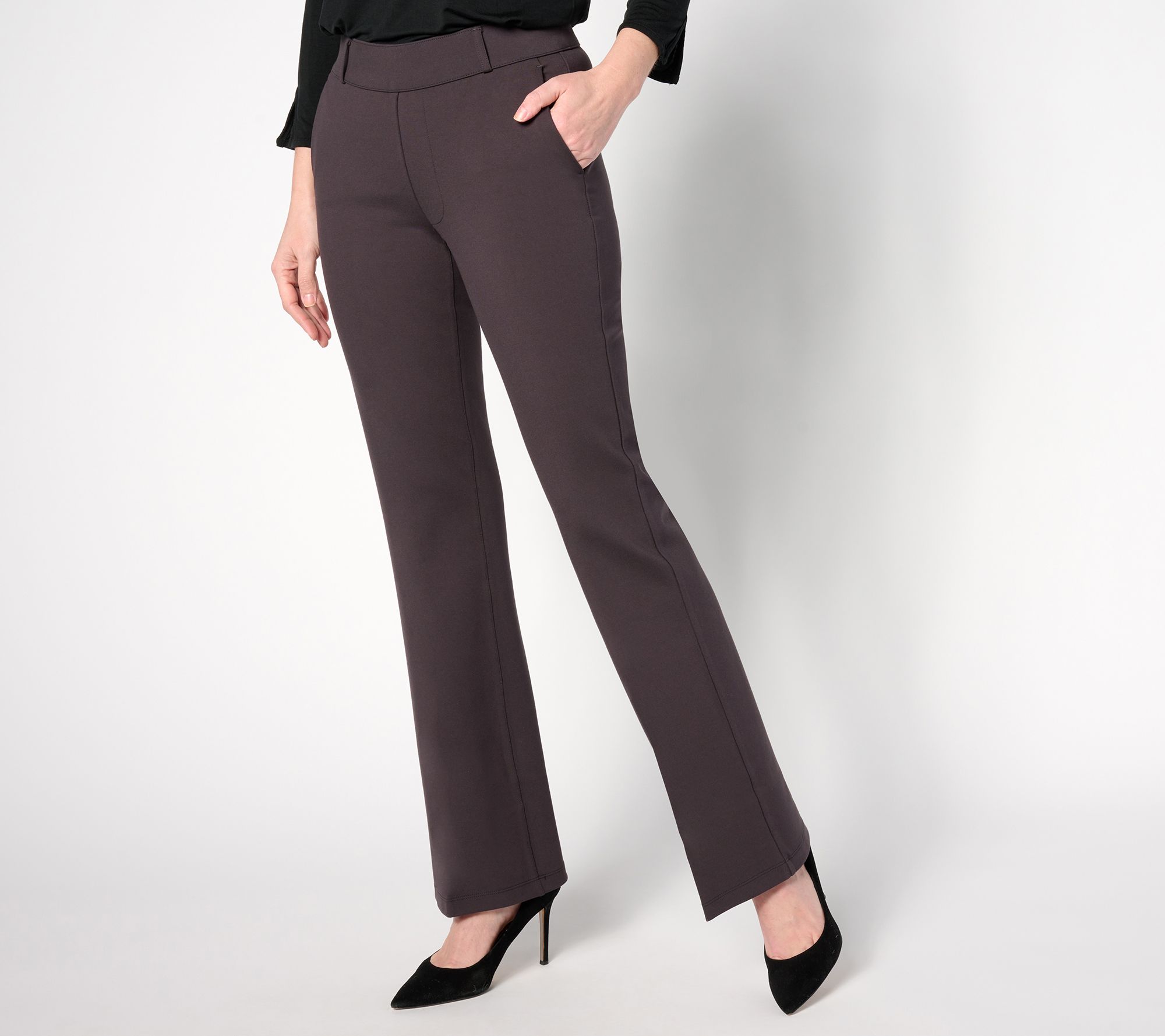 • Features: belt loops, back darts, faux front slash pockets, faux back welt pockets, pull-on waistband, LiftTuck® technology