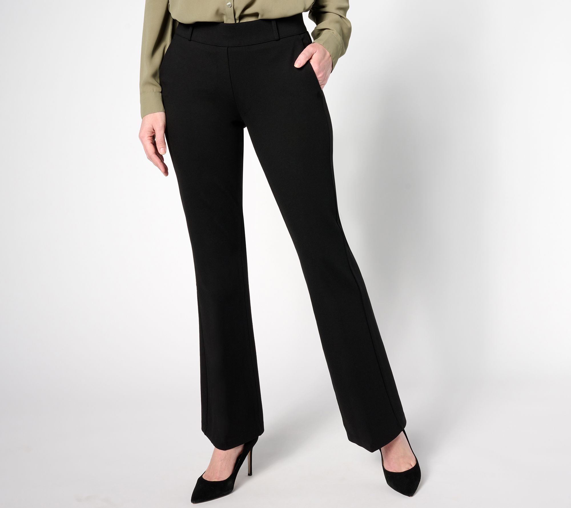 • Features: belt loops, back darts, faux front slash pockets, faux back welt pockets, pull-on waistband, LiftTuck® technology