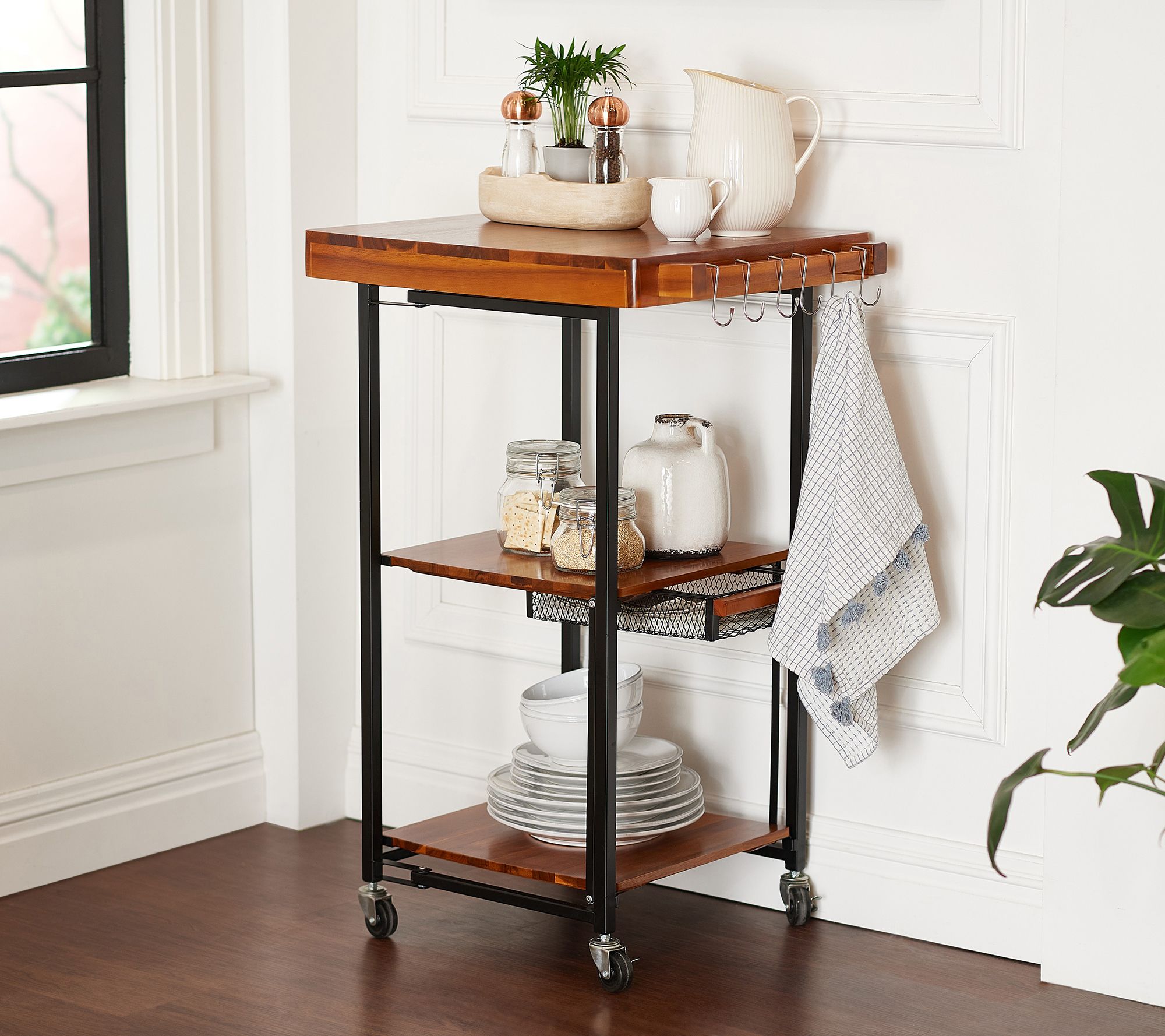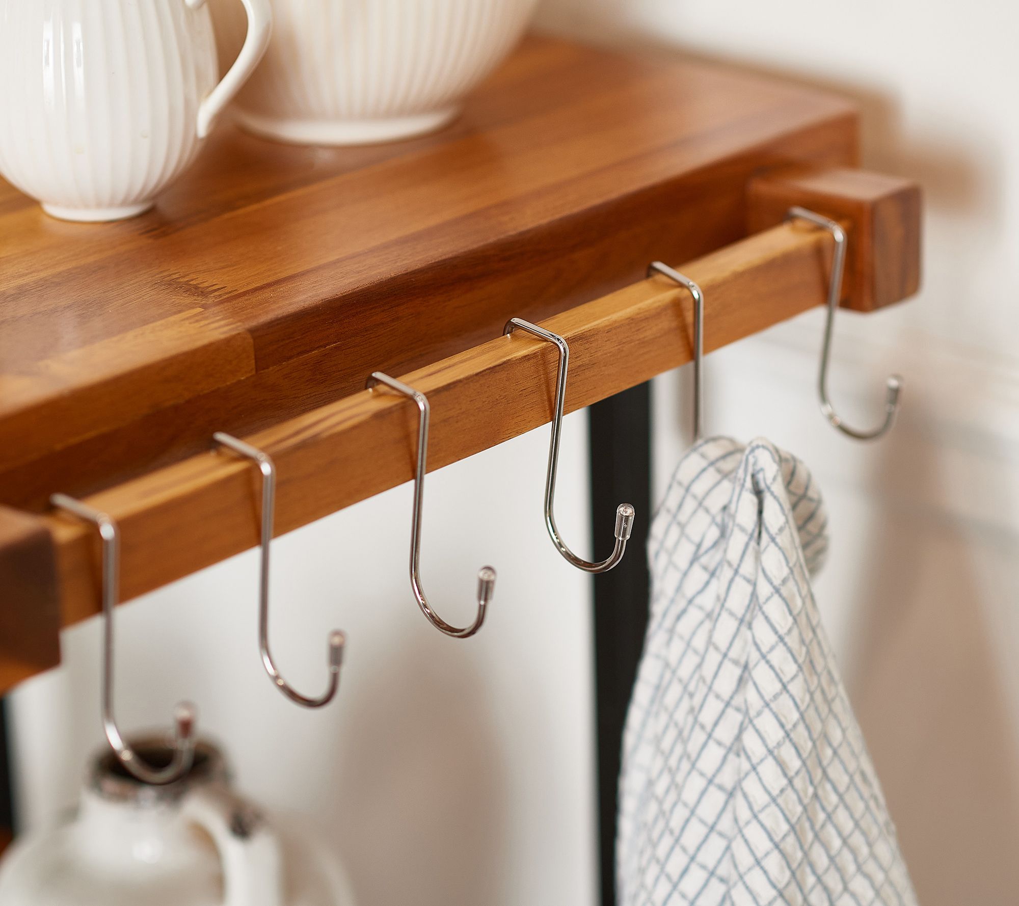With a tabletop, two shelves, and a drawer, plus six convenient hooks (finally, a place to hang up that damp dish towel), it's ready to re-introduce tidiness to your kitchen.