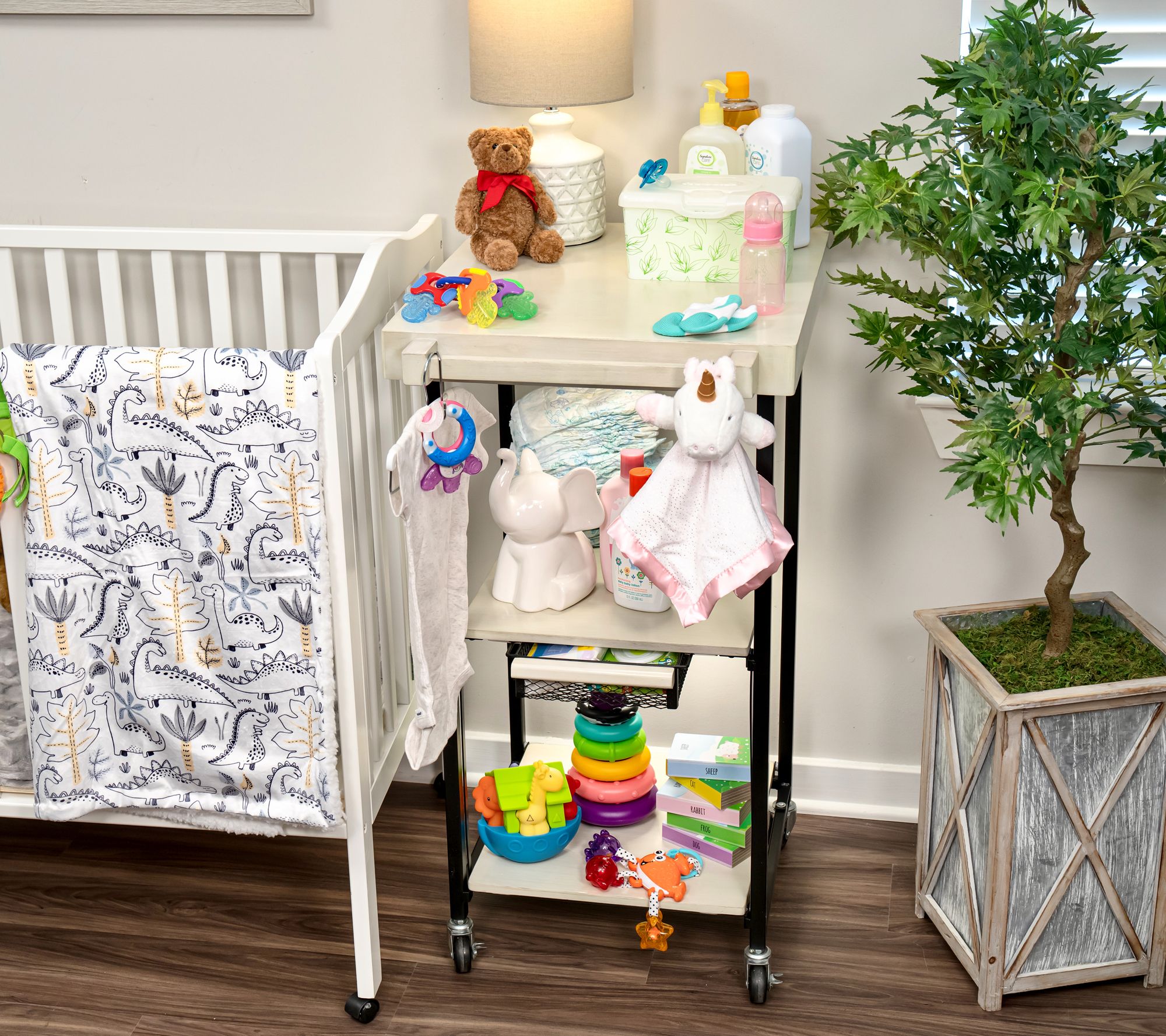 • Tabletop, two shelves, a drawer, and six hooks