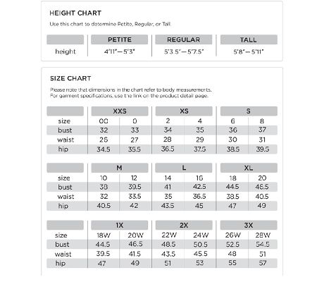 • 8 fits bust 37", waist 31", hip 39-1/2"; 20W fits bust 46-1/2", waist 41-1/2", hip 49"
