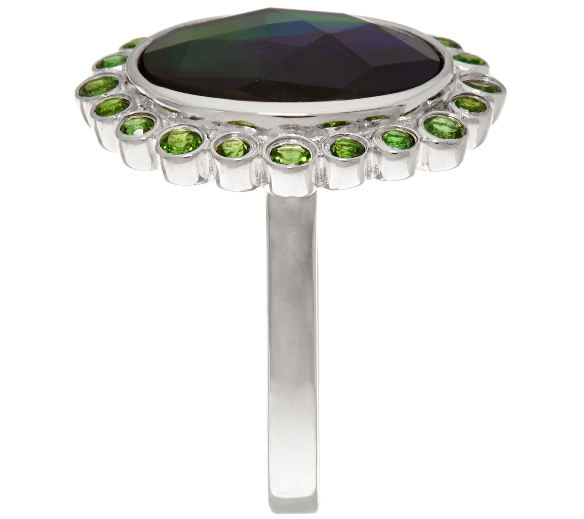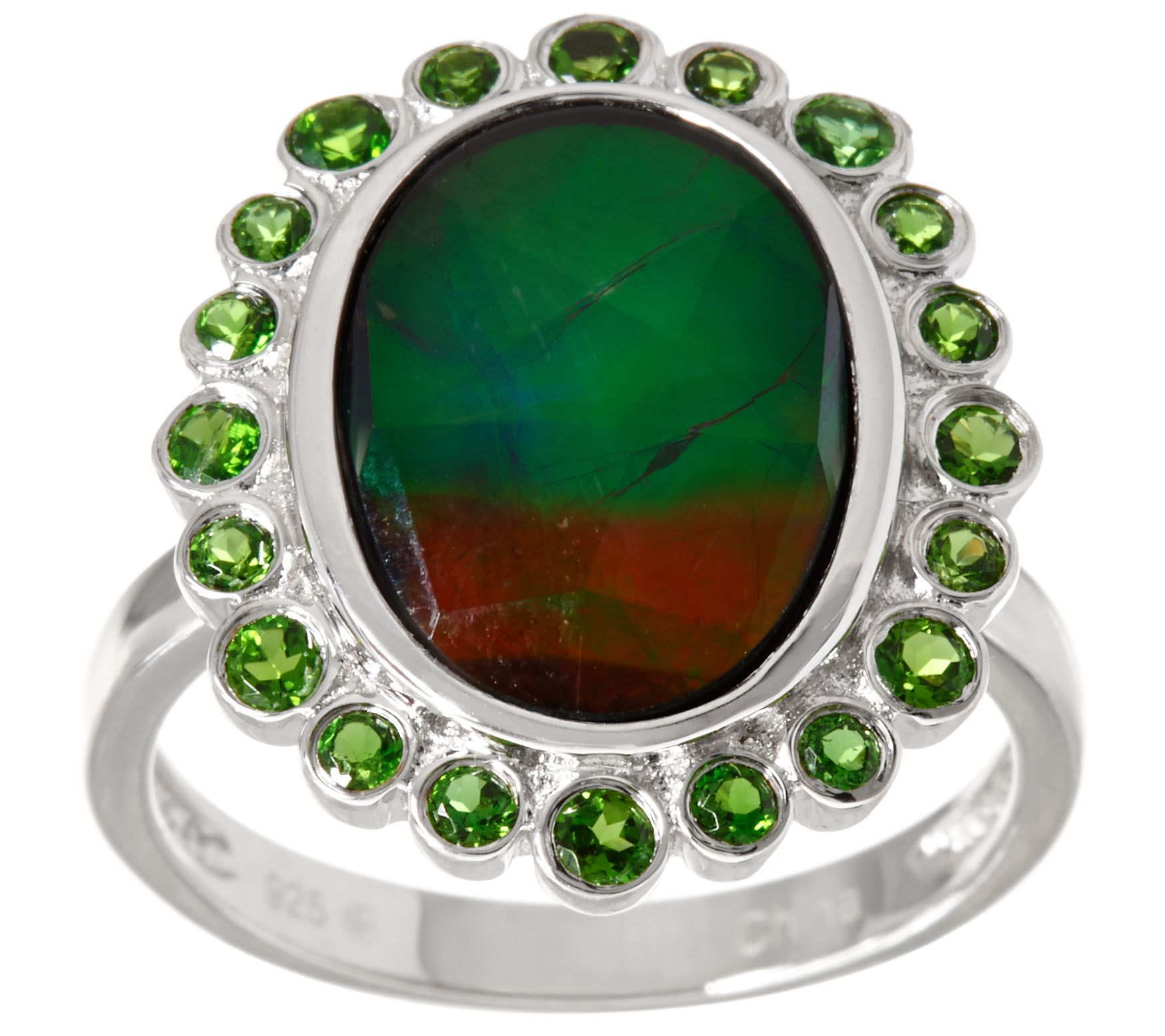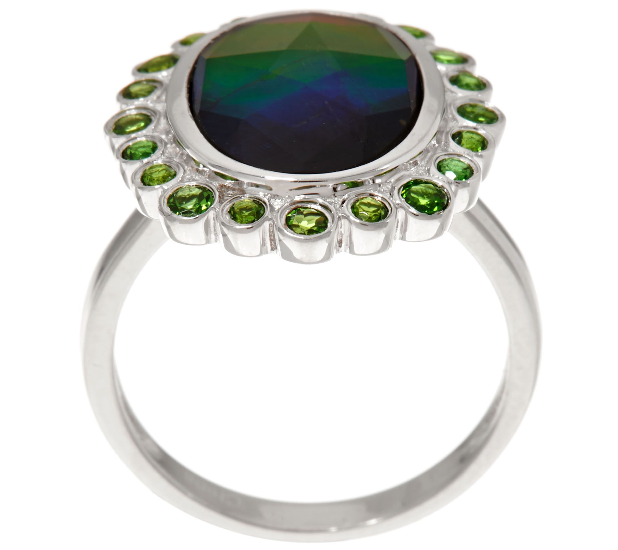 • Bezel-set, oval ammolite triplet, consists of crystal quartz top with ammolite center and backing; halo of bezel-set, round chrome diopside in various sizes; polished band