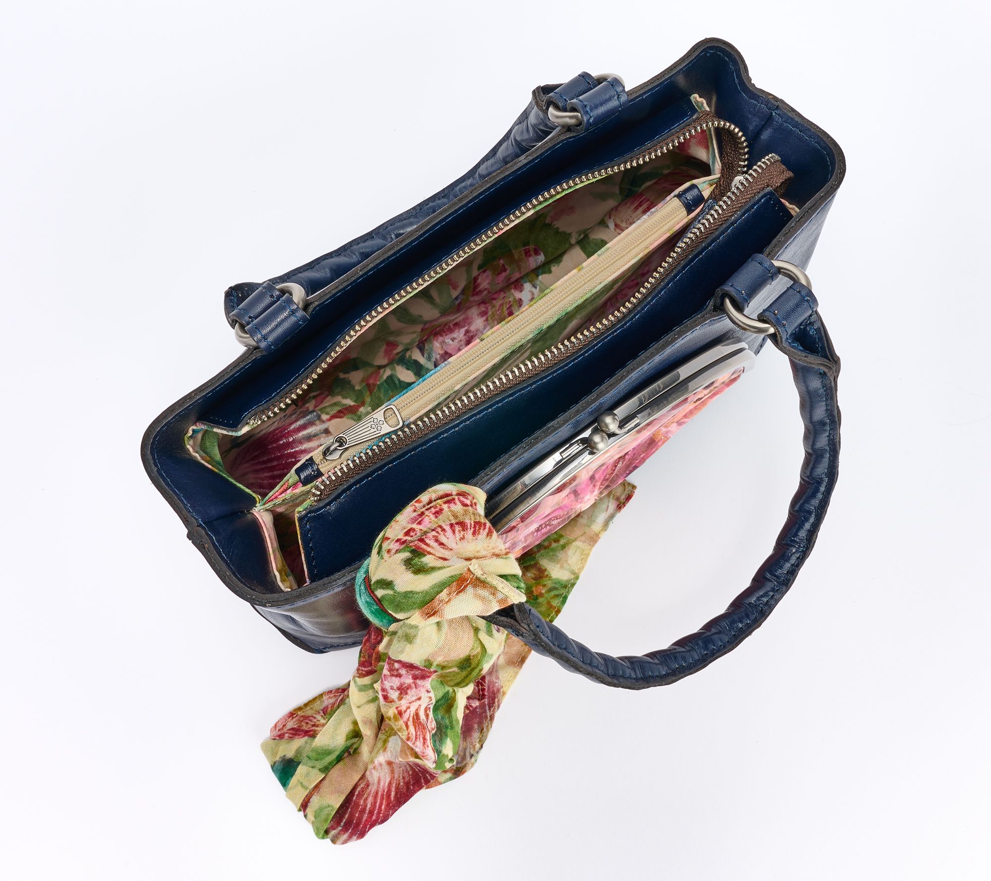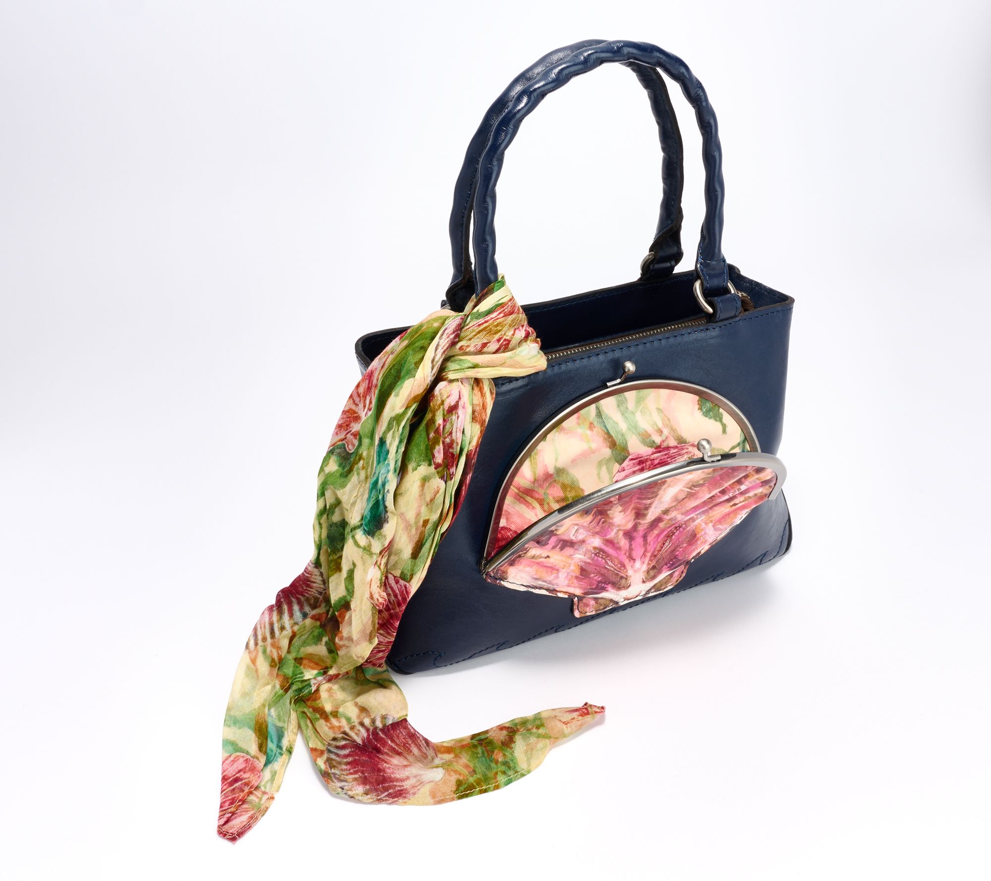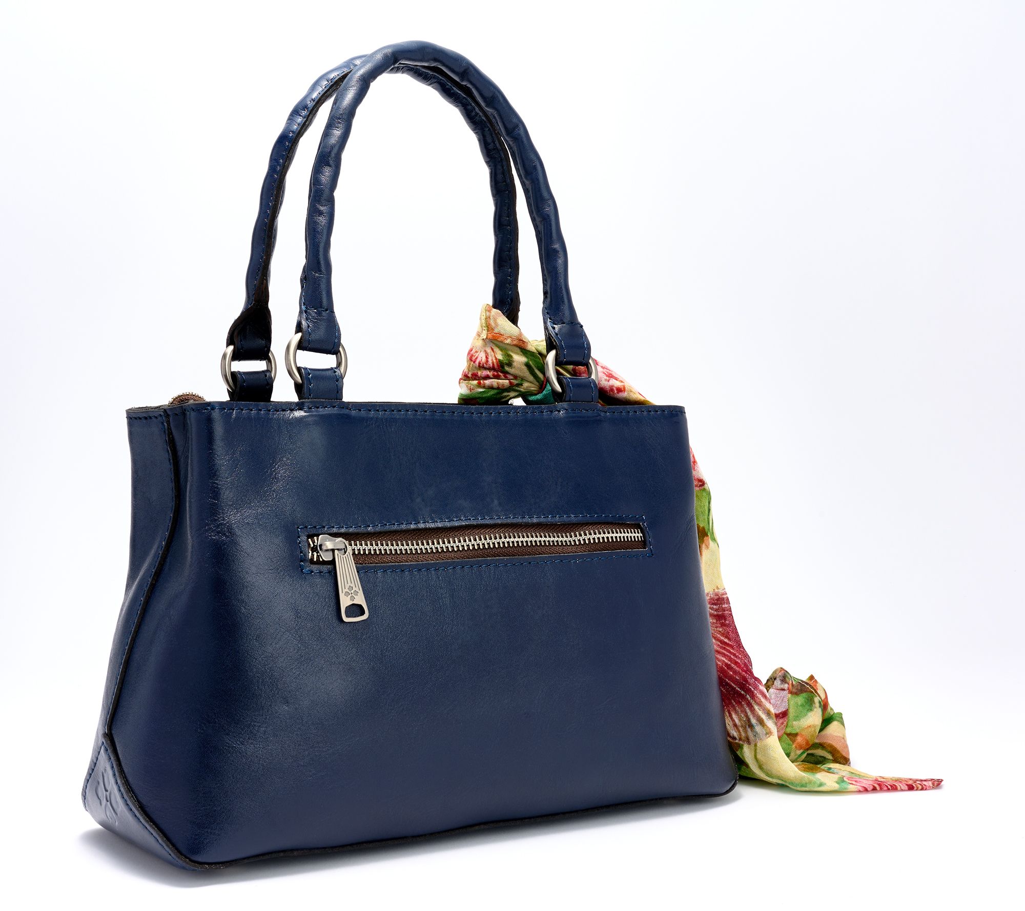 So pretty and chic, this leather satchel is adorned with a seashell embellishment and a printed scarf. Two main interior compartments and a rear zip pocket keep you organized on the go, and you can carry it by the strap or the top handles for total versatility. From Patricia Nash.