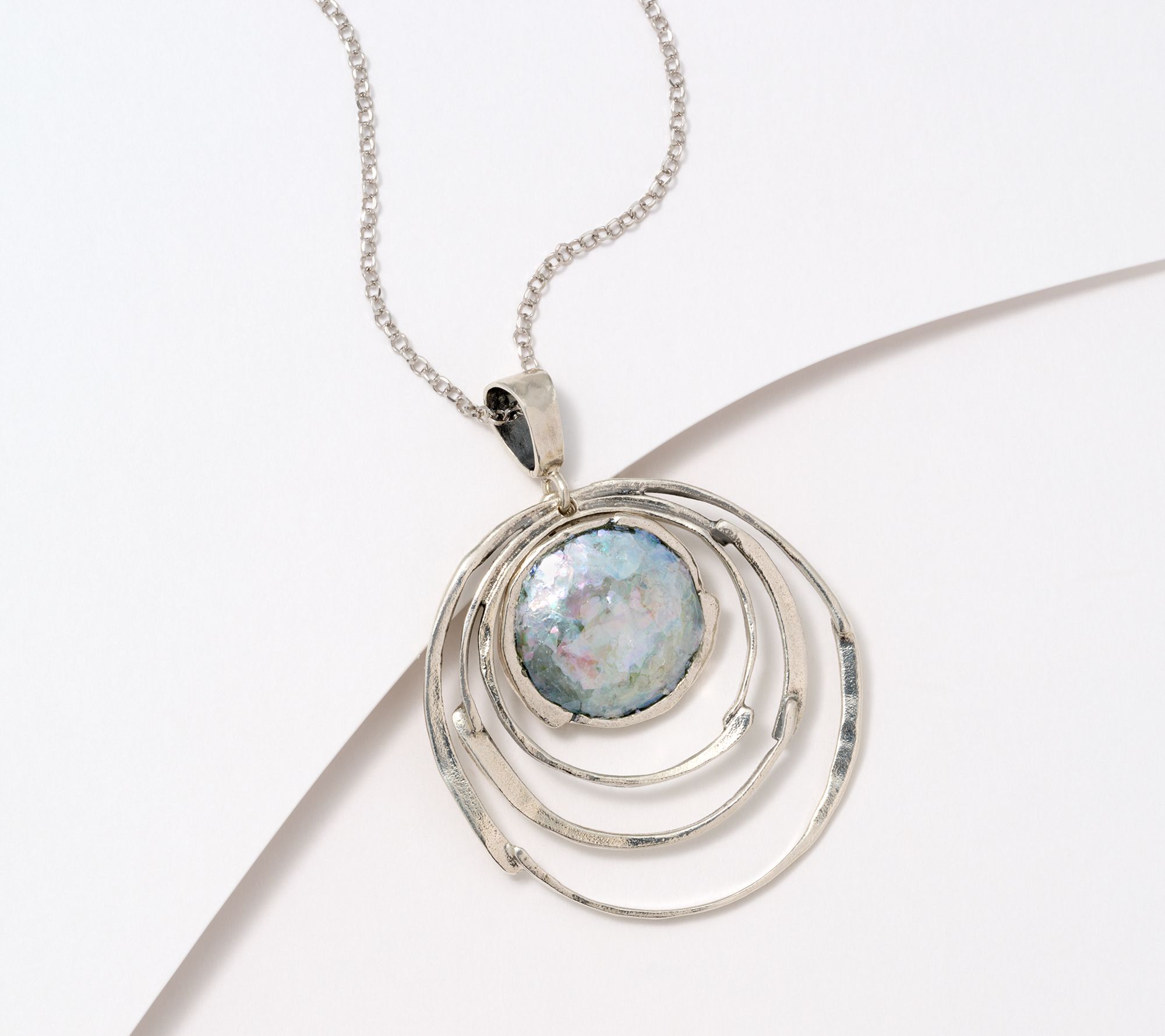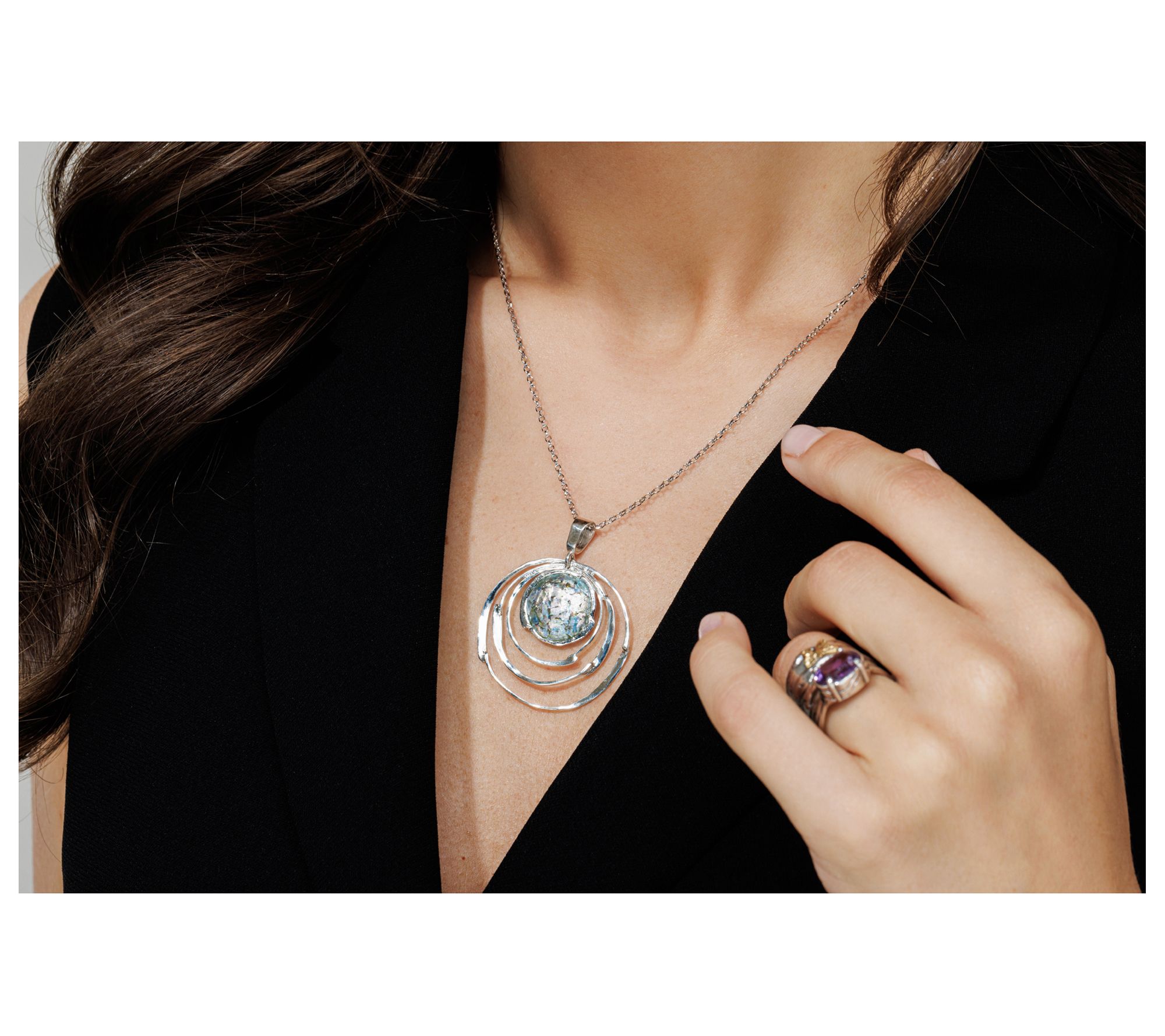 Anchored by a mesmerizing round Roman glass dangle placed in the center of a circle design, this captivating pendant creates a ripple effect that's both peaceful and playful. From Or Paz® Sterling Silver Jewelry.