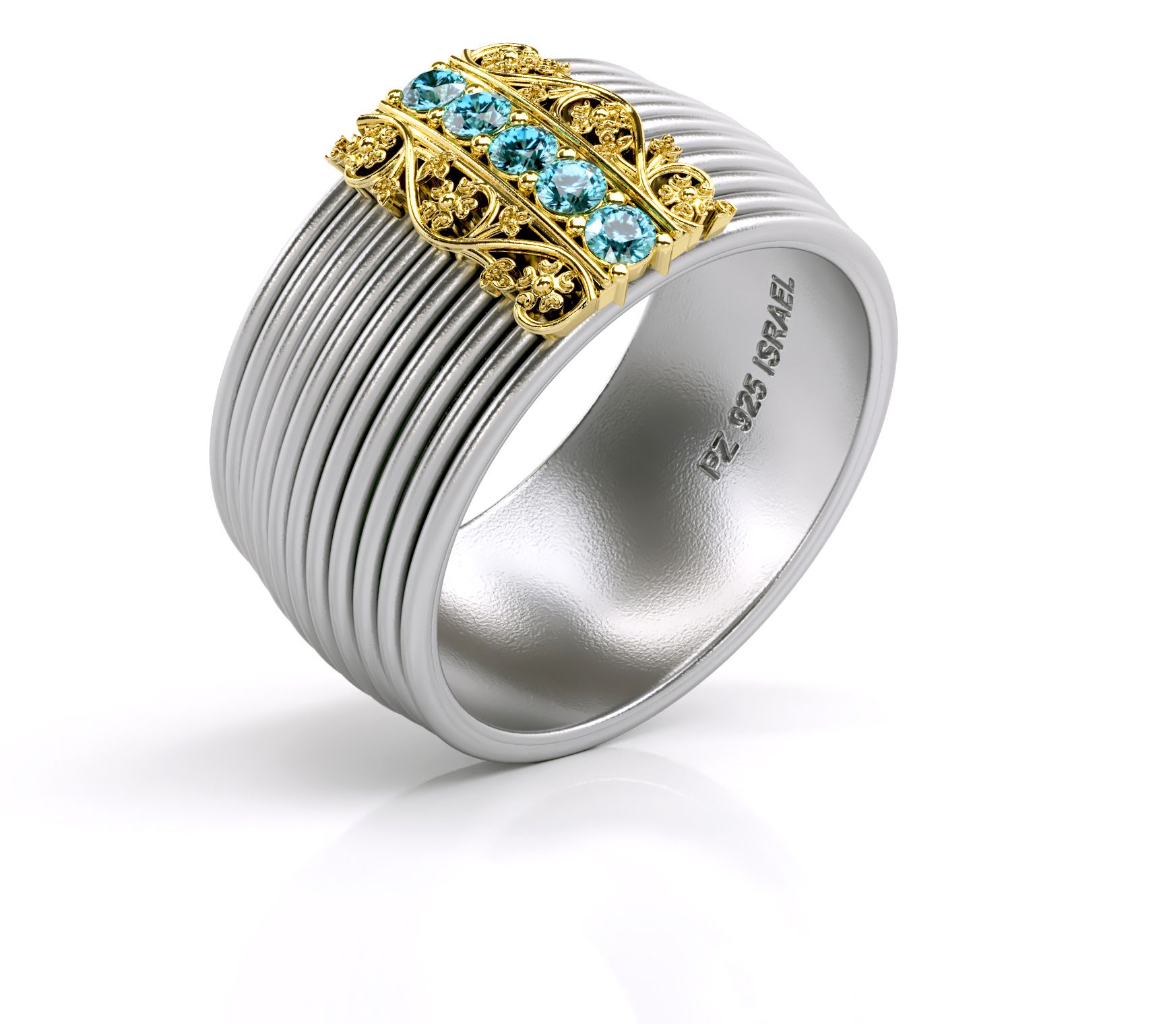 • Two-tone band; 14K yellow gold-plated sterling silver lace design; round, prong-set gemstones; oxidized