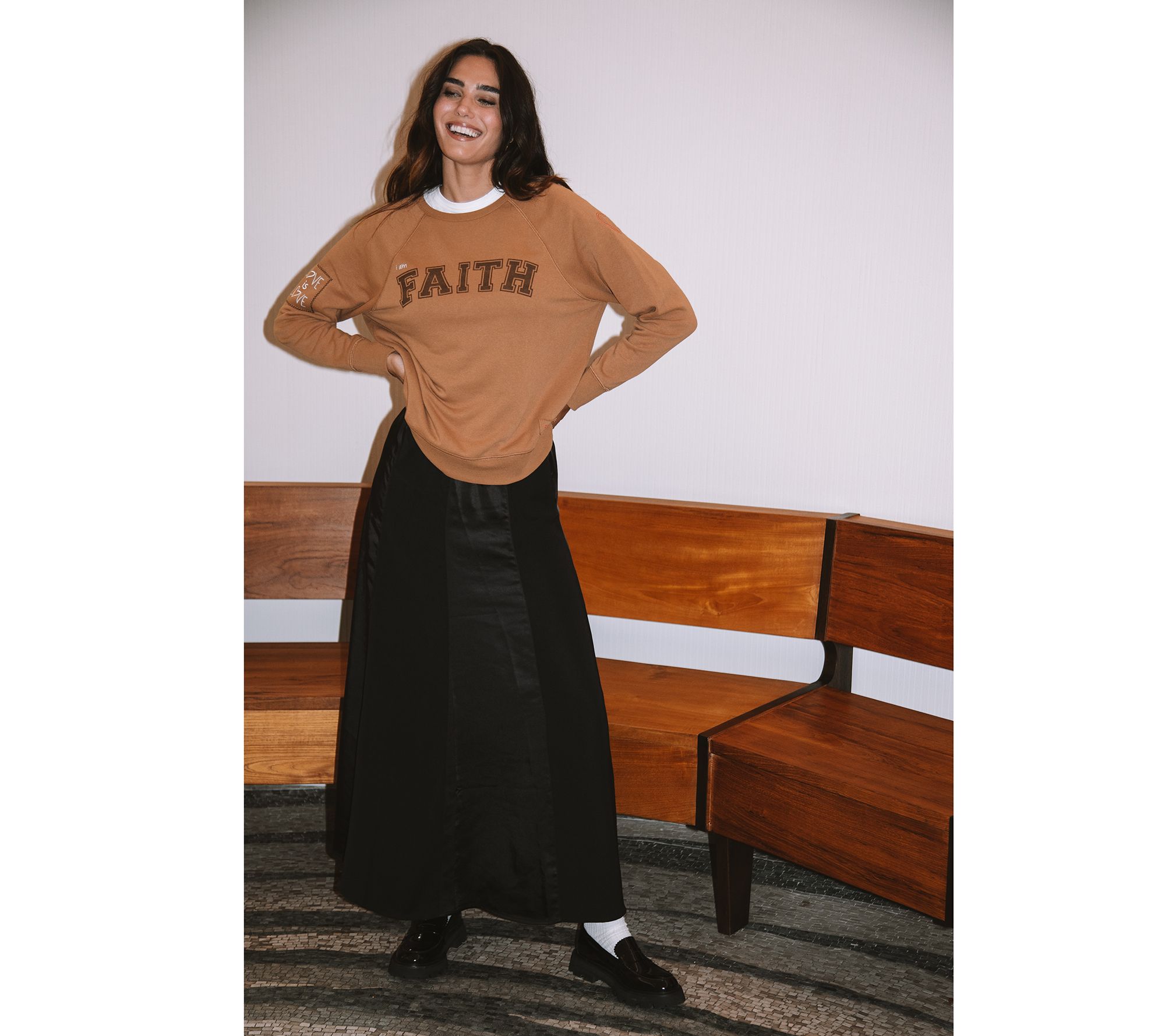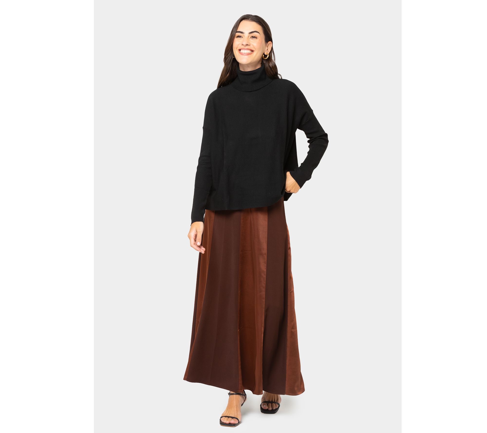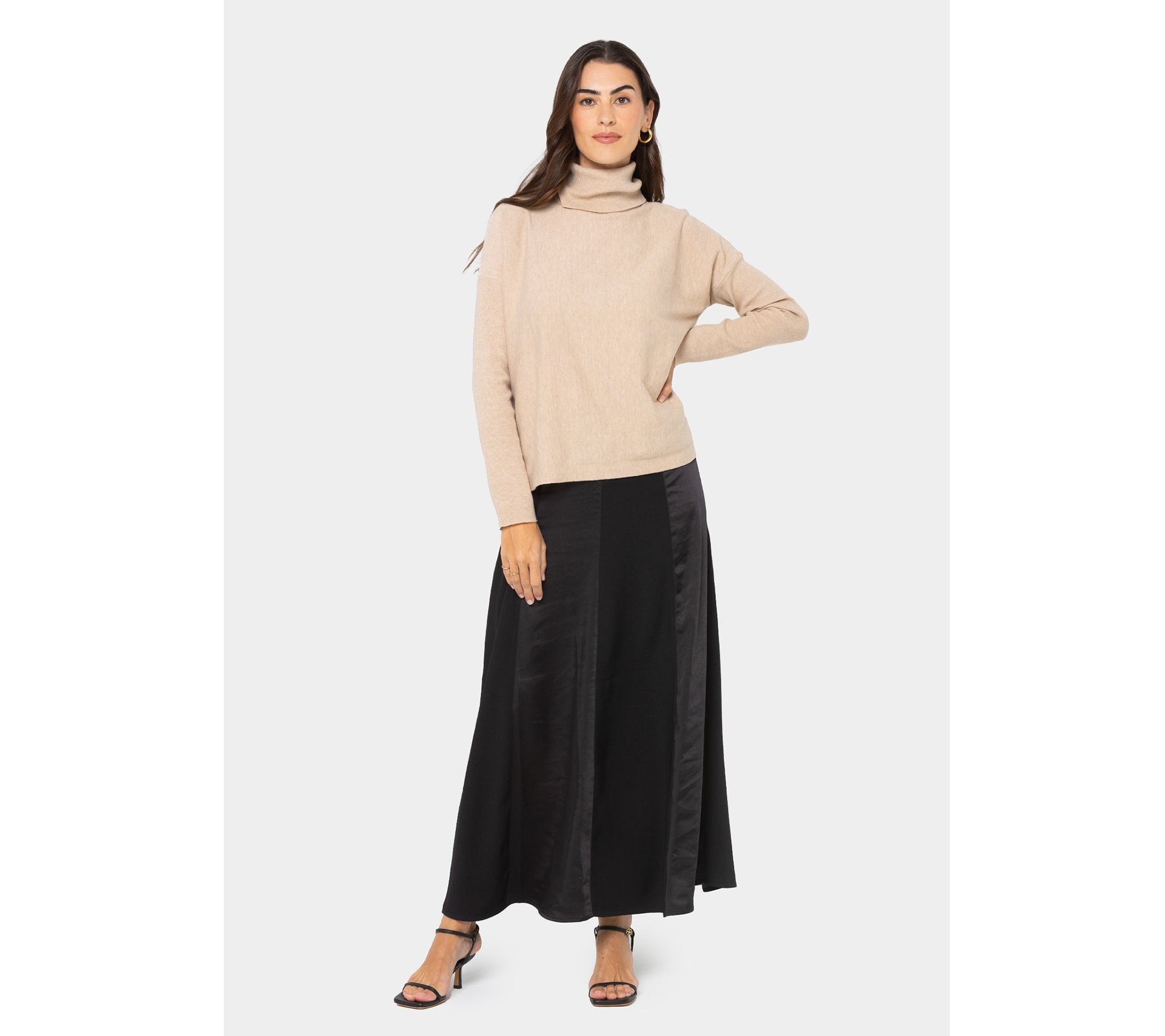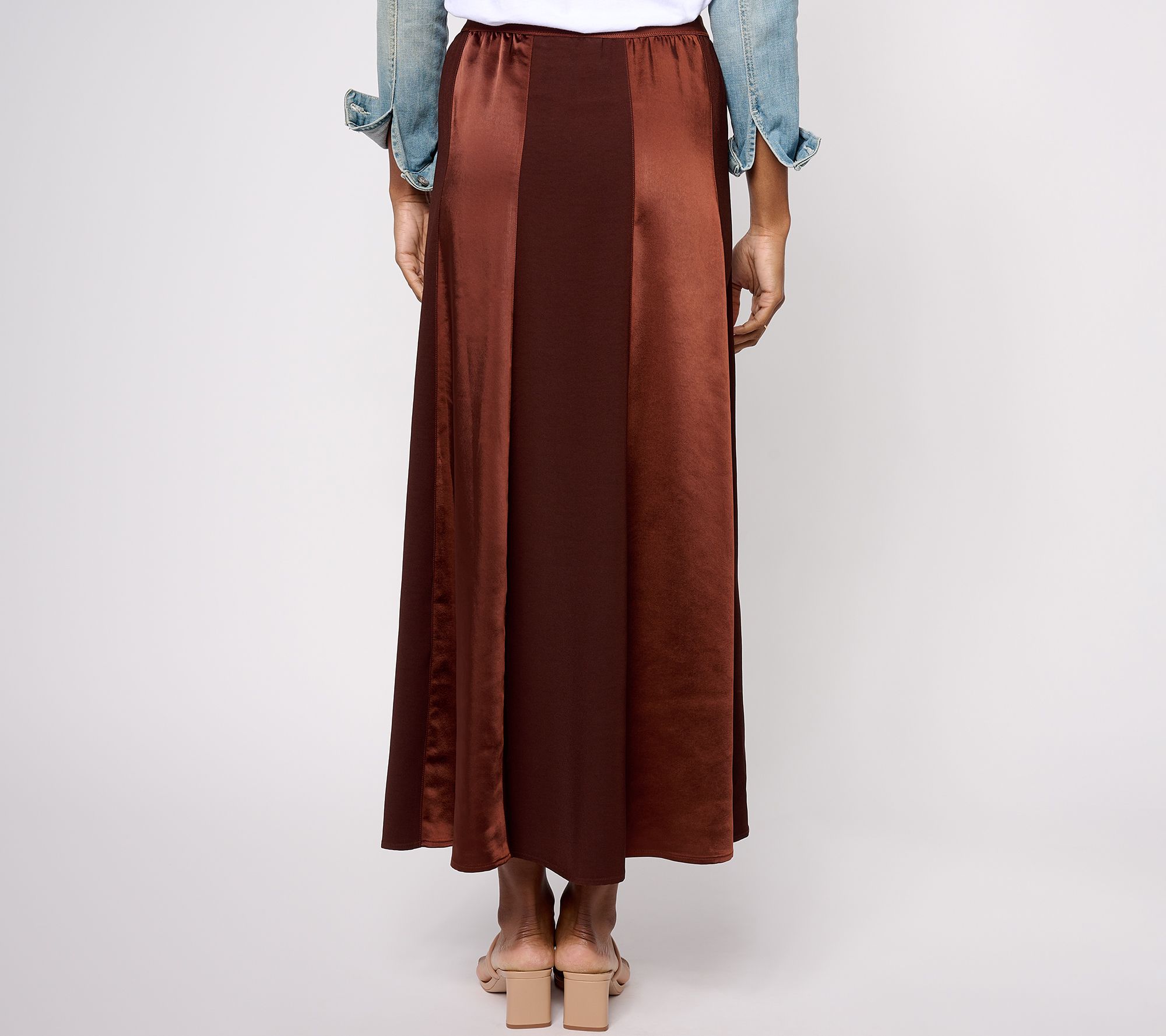 Be best dressed at all the fabulous fall functions when you sport this satin skirt with a sweater and heels. The contrasting matte and shiny panels bring the wow factor to this look. From Peace Love World.