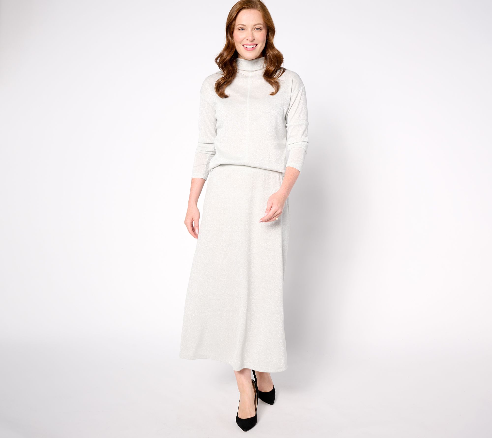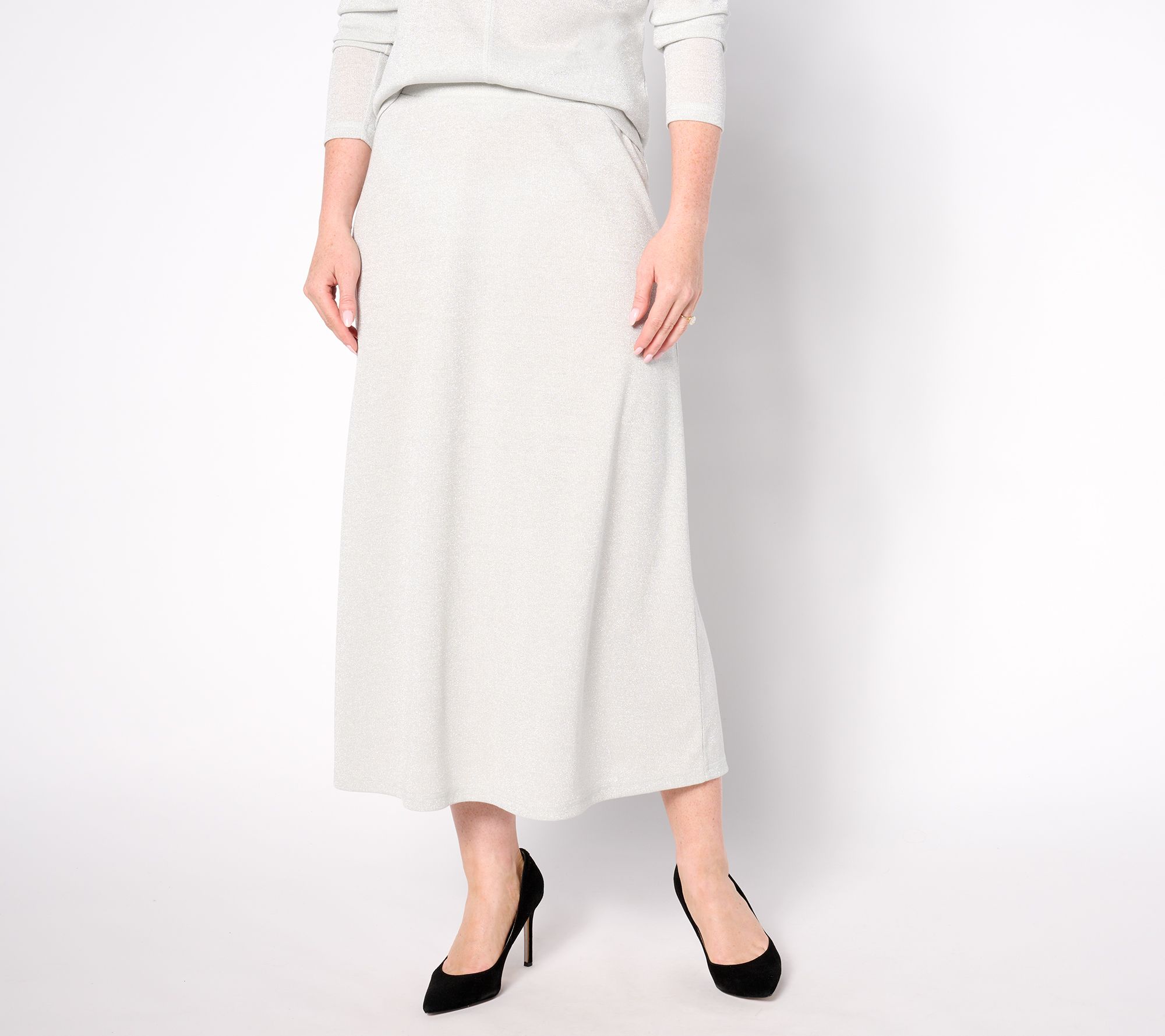 Last minute invite? Say yes to any social soiree when you have this pull-on skirt in your apparel arsenal. The chic metallic knit design is ready the moment you put it on for dancing, dining, or drinks. And the semi-fitted design and elastic waistband ensure you'll be comfy even if an early evening event extends well into the night. From Peace Love World.