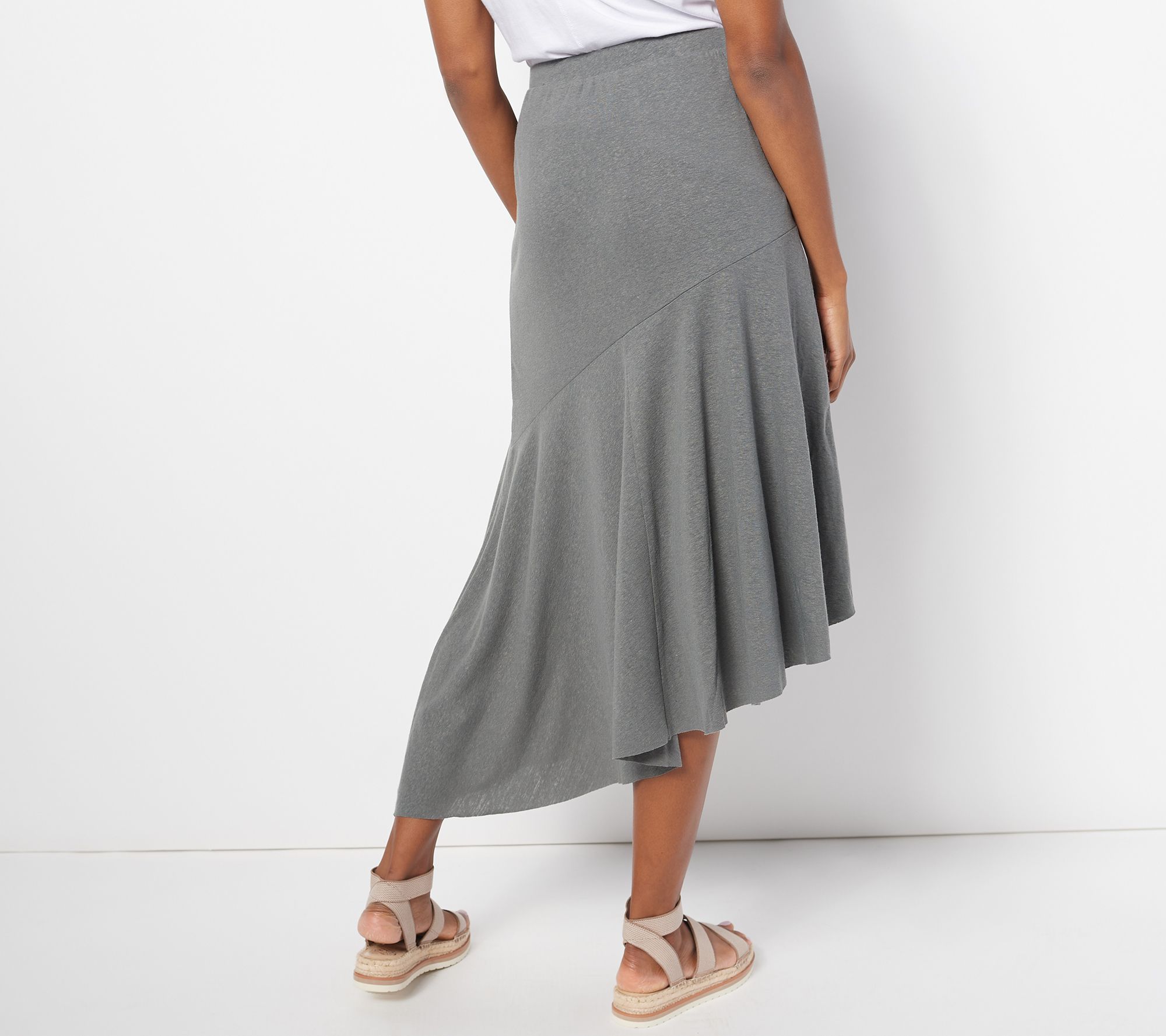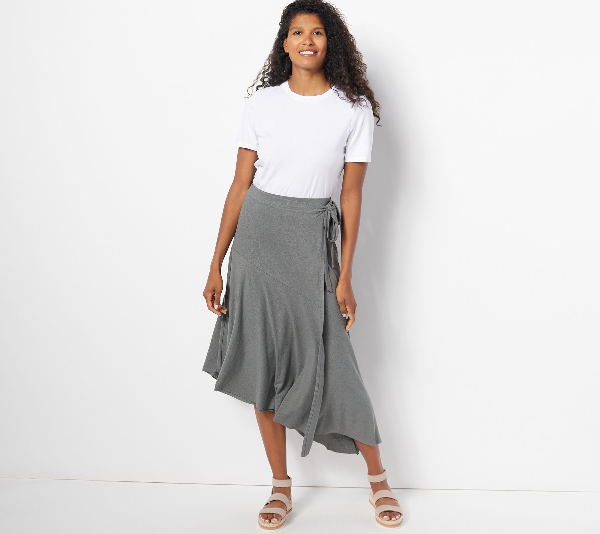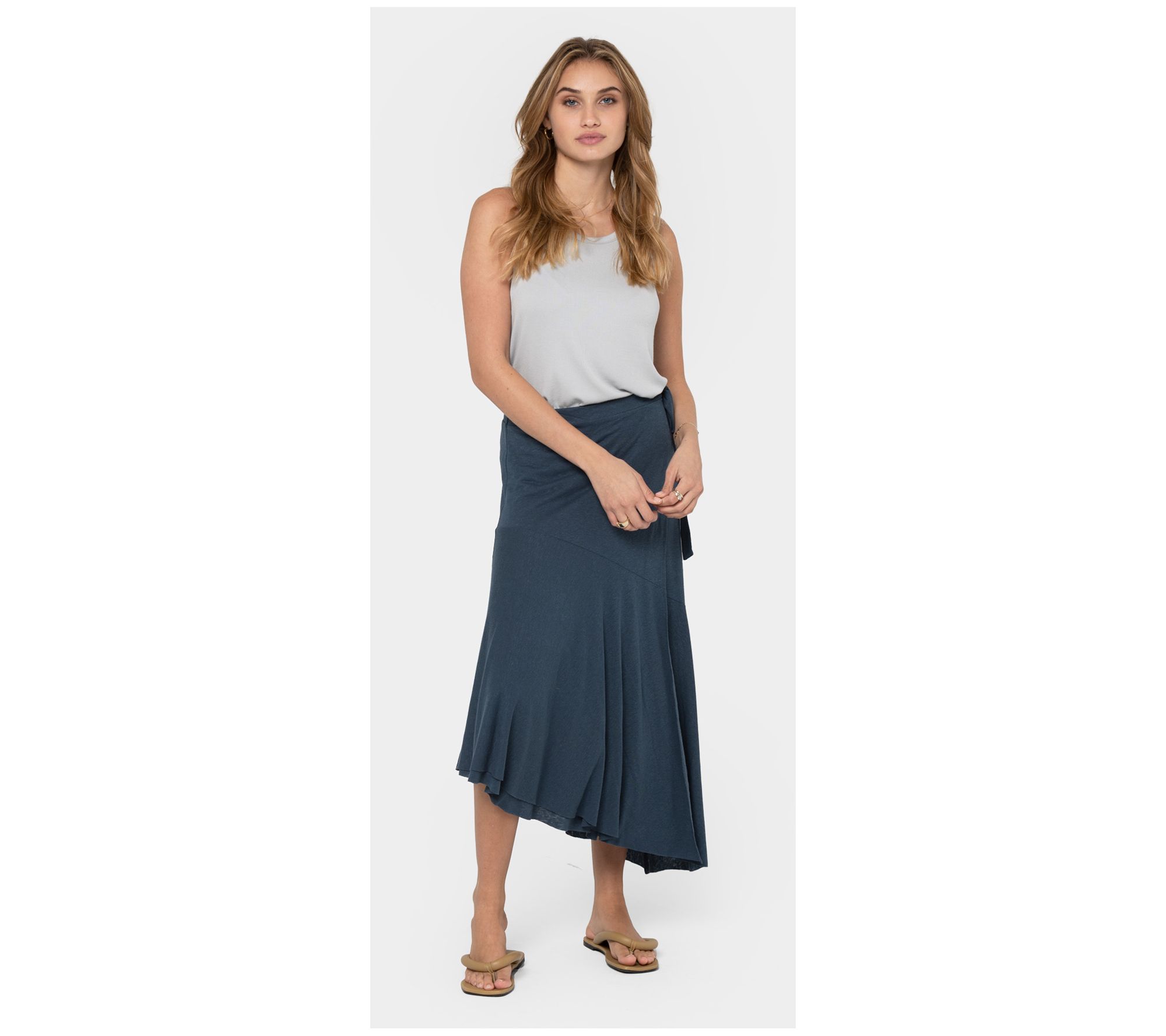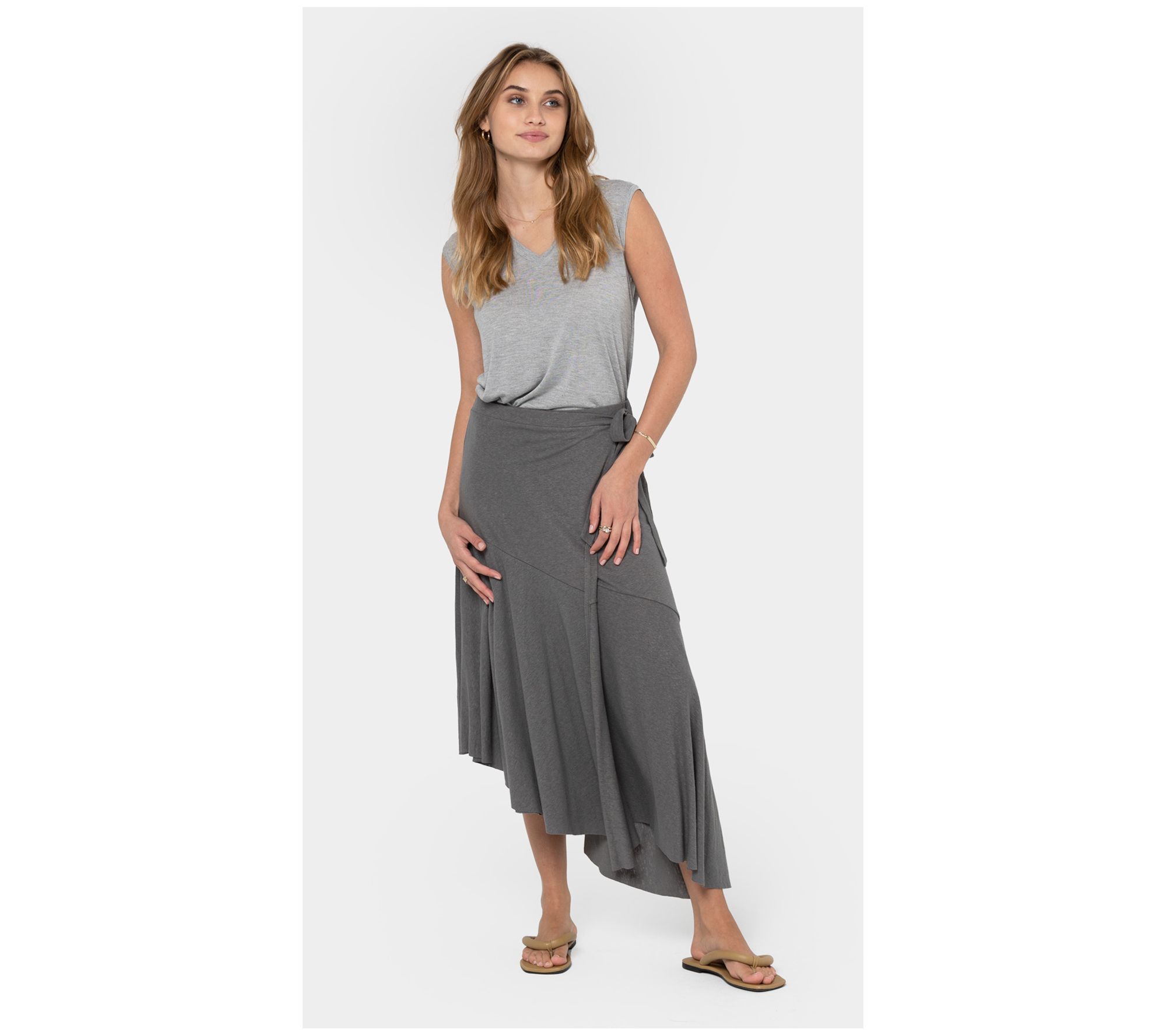 This Peace Love World Boheme wrap skirt features separate foldover flat elastic waistband along with elastic caught in seam and flouce seam. Raw edge hem. Faux wrap front panel.