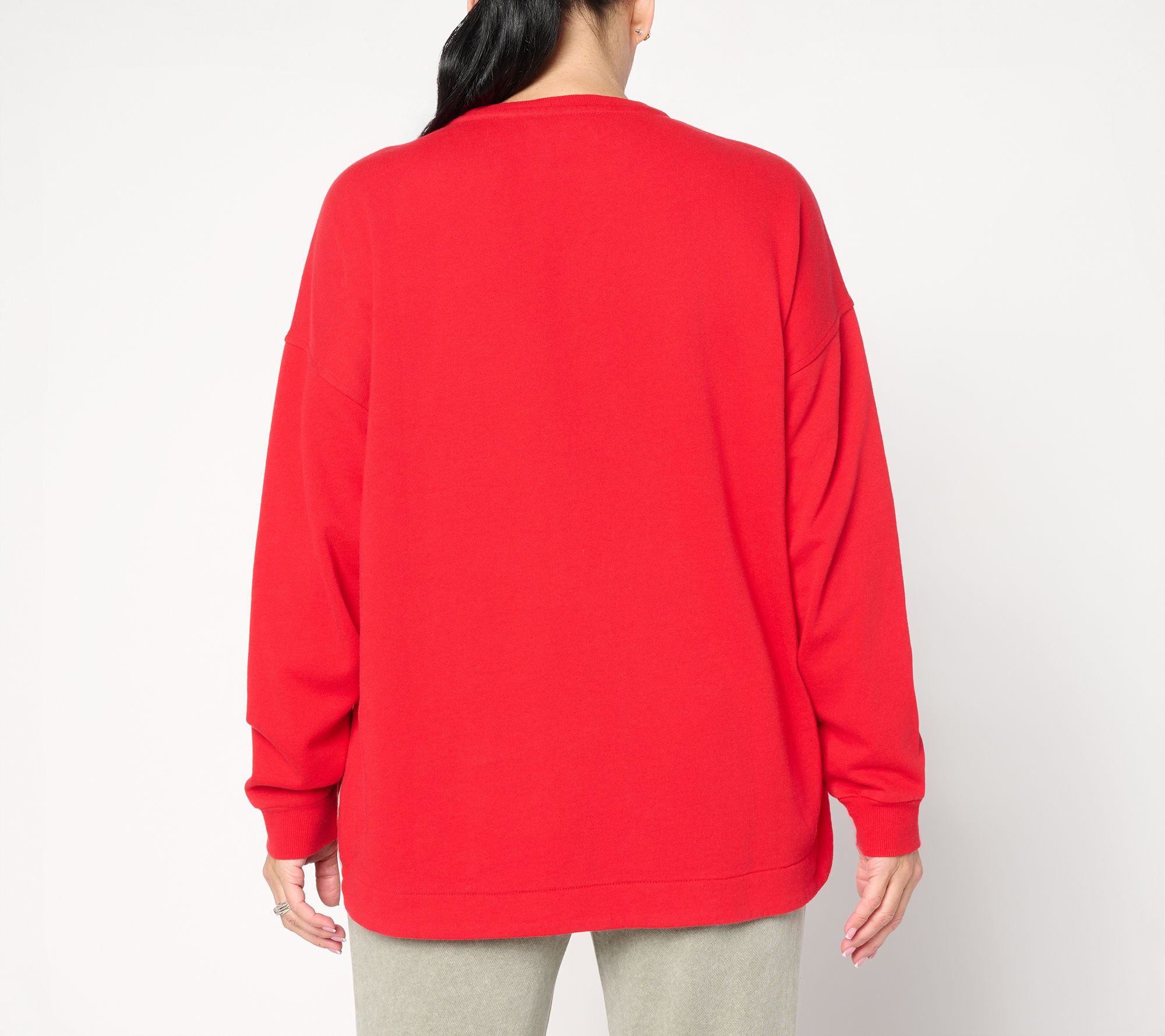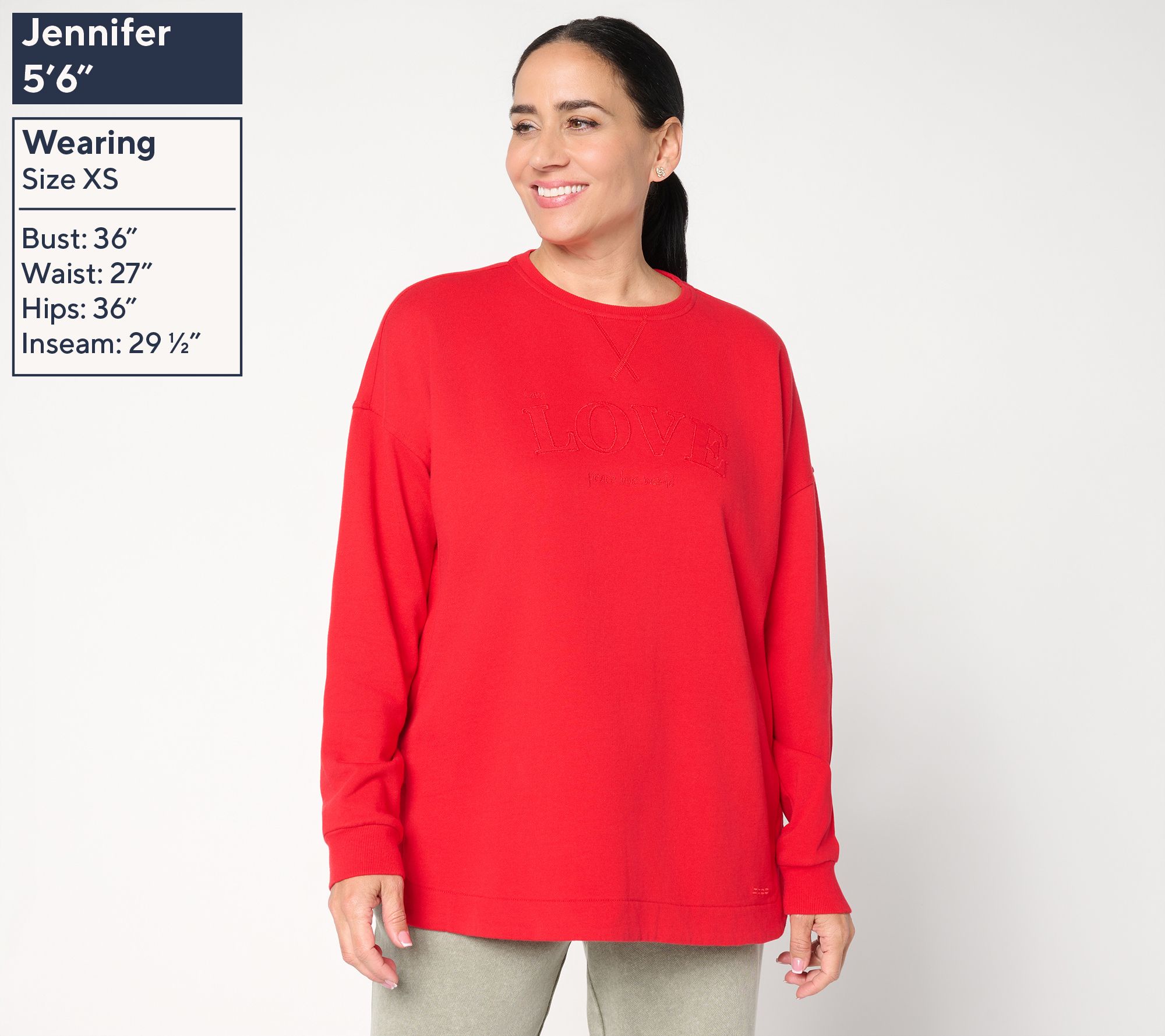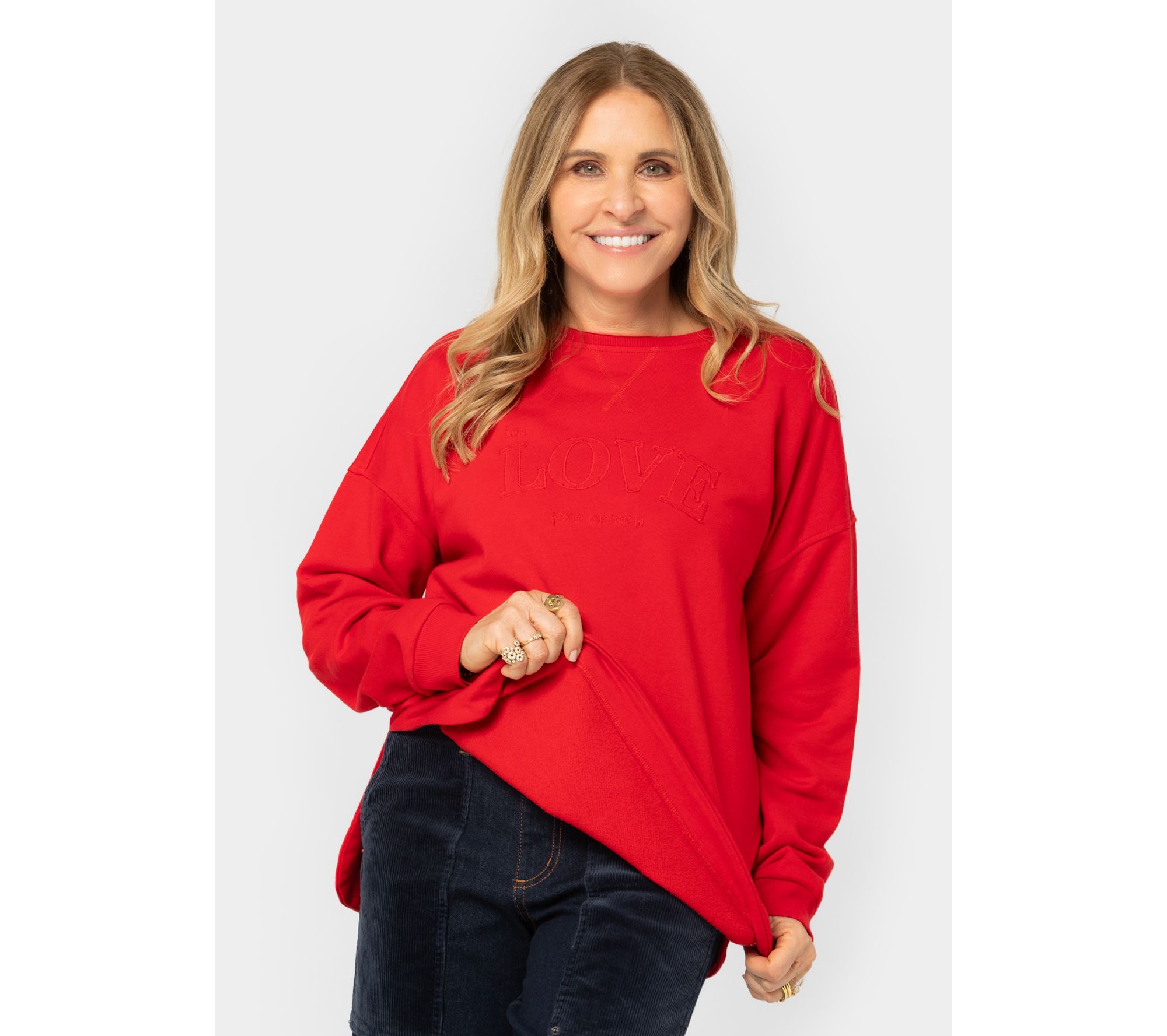 Searching your closet for that laid-back vibe? Don't sweat it. This crewneck sweatshirt features a relaxed fit and cotton-rich fabric, so you can kick back in comfort while layering over anything from leggings and joggers to denim or ponte. From Peace Love World.