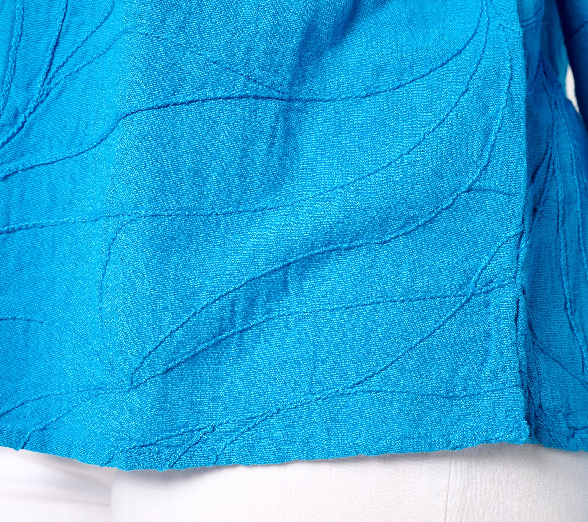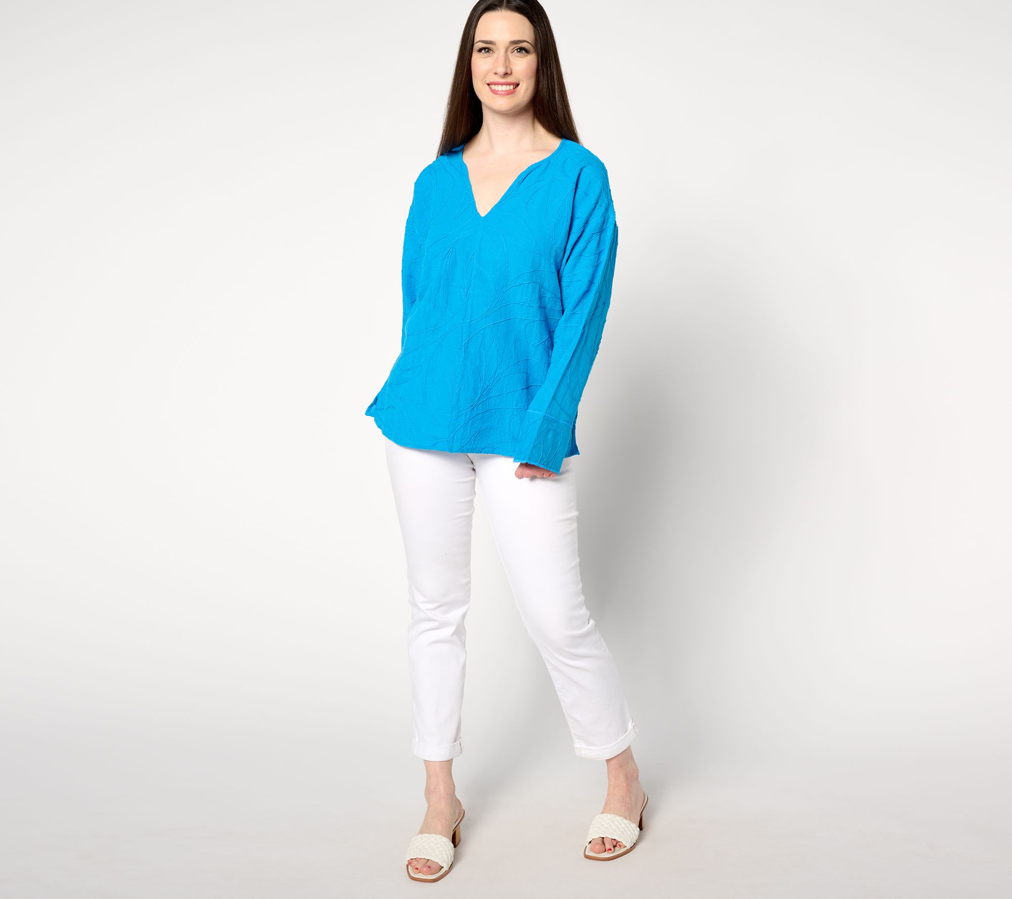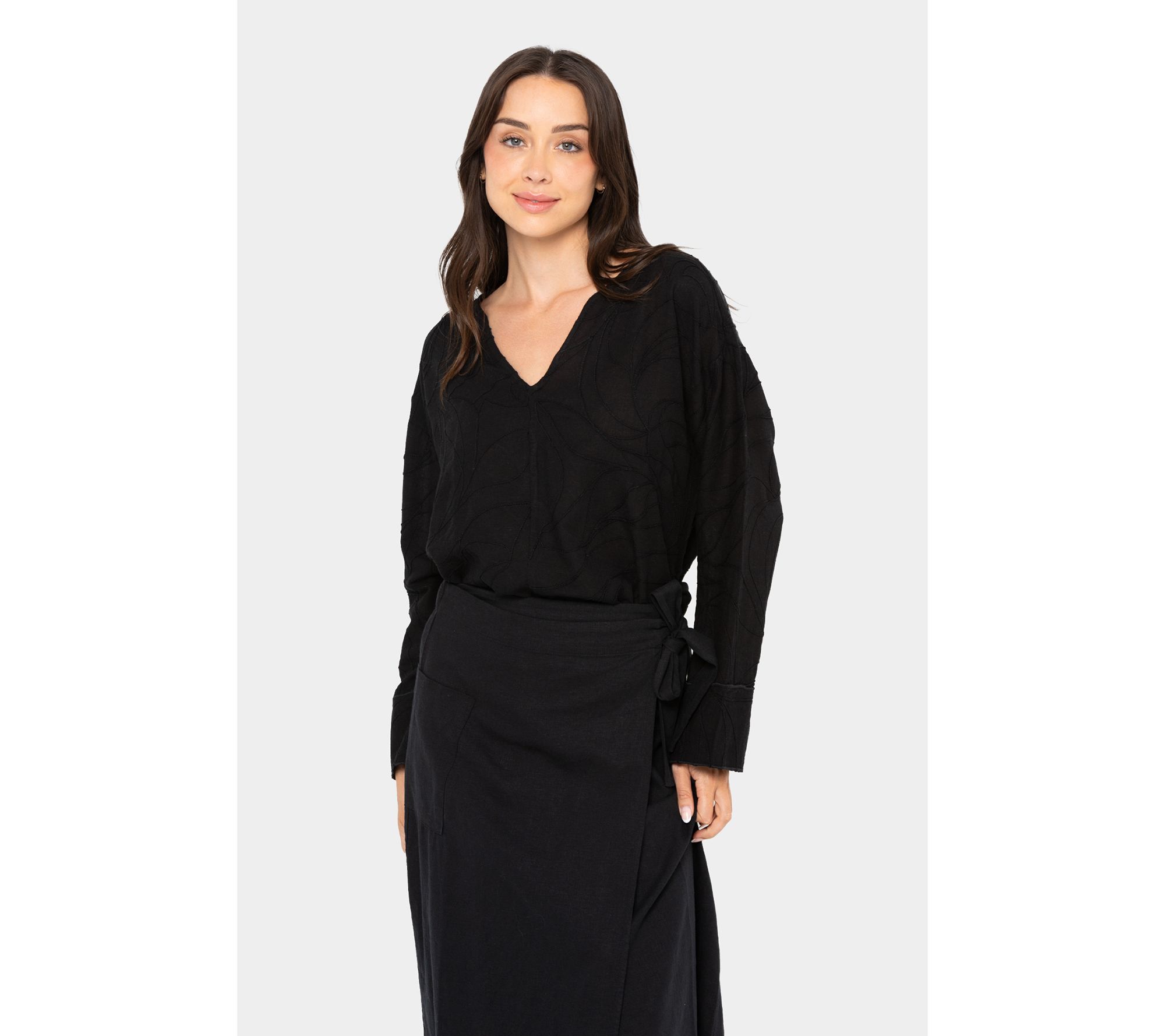 • Features: embroidered open V-neck, long sleeves with cuff, drop shoulder, side slits