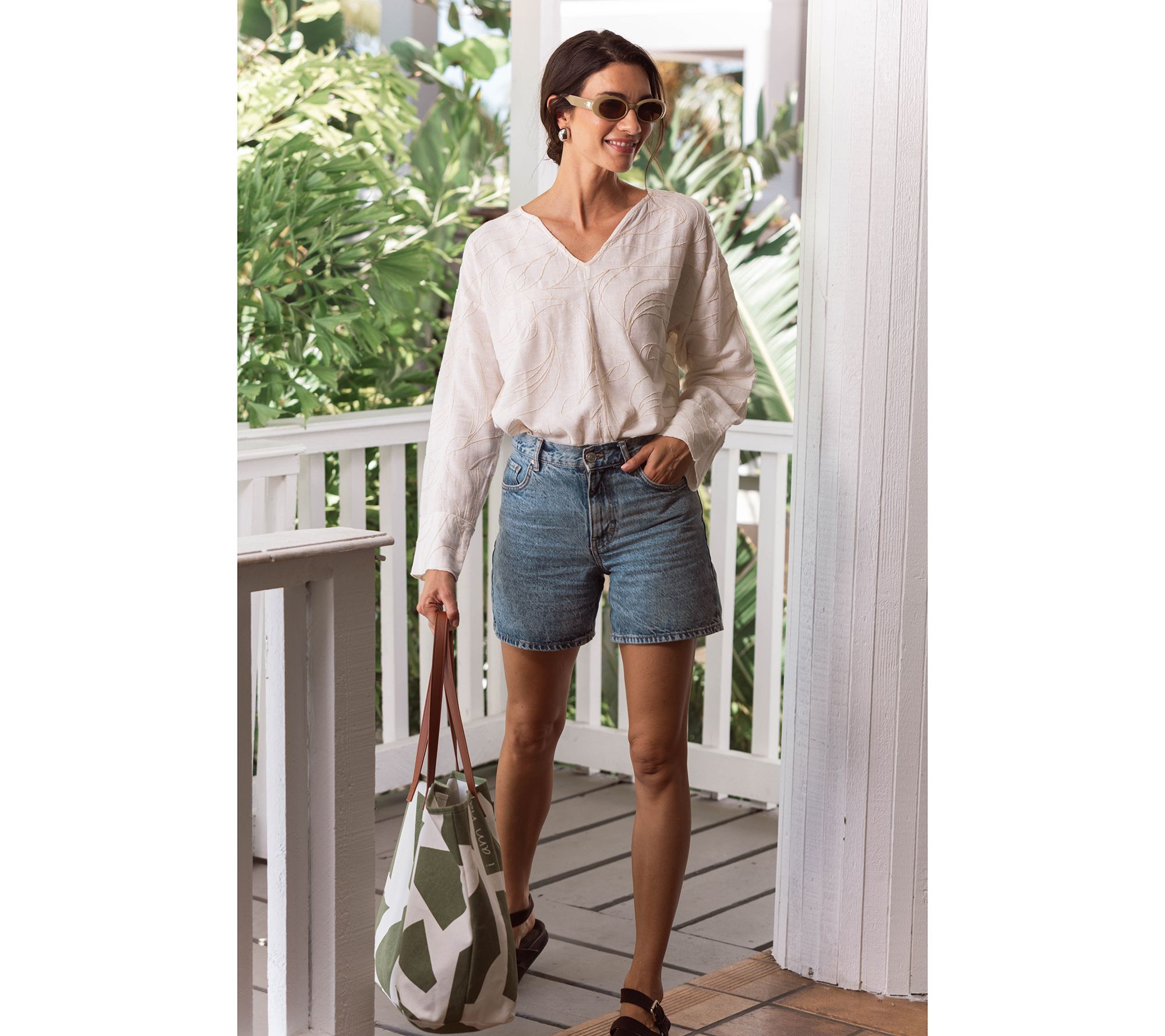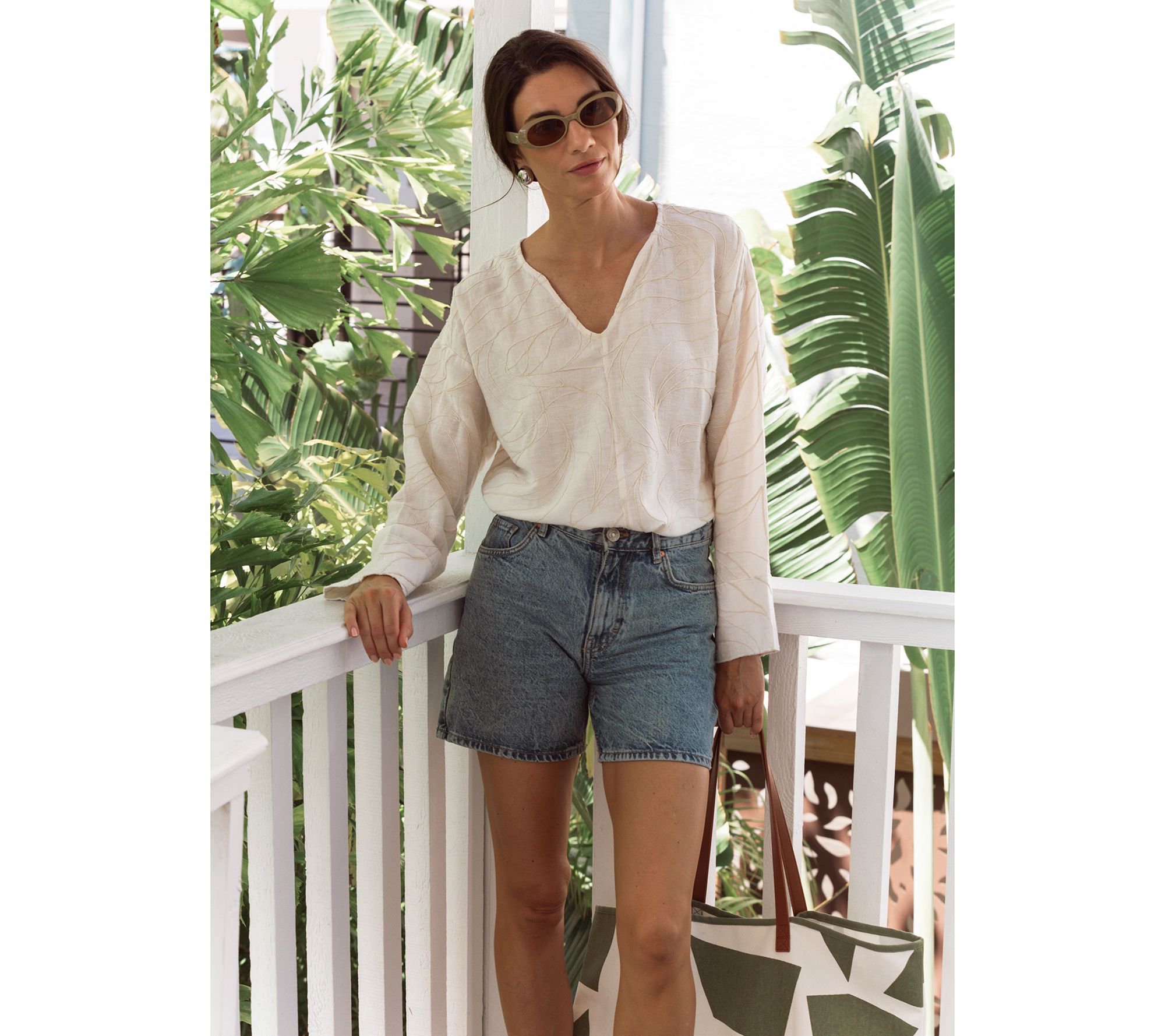 A new season is here. Time to shift into a more relaxed vibe with this easy V-neck top. Featuring a blend of summer-ready fabrics, the crinkled texture makes this piece the ideal option for a dressed-in-seconds 'fit (no steaming necessary). Traveling? This packable pick slips right into your suitcase for dress-up or dress-down days.Tuck it into light wash jean shorts or a midi skirt, or let it float freely over crisp white crops or chic wide-leg trousers. From Peace Love World.