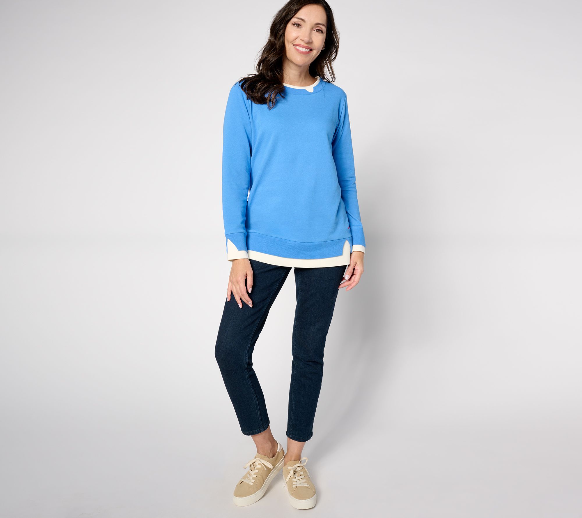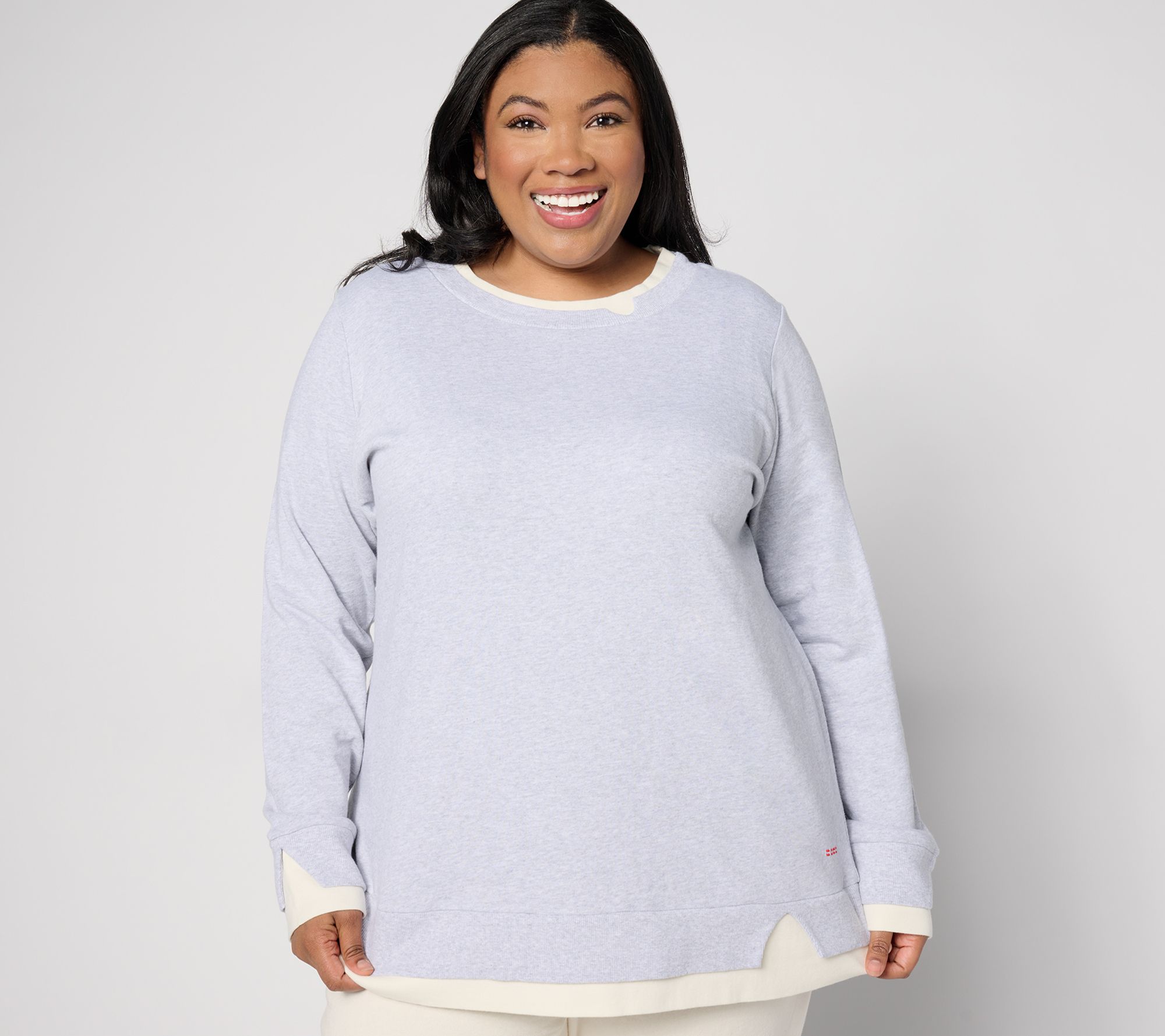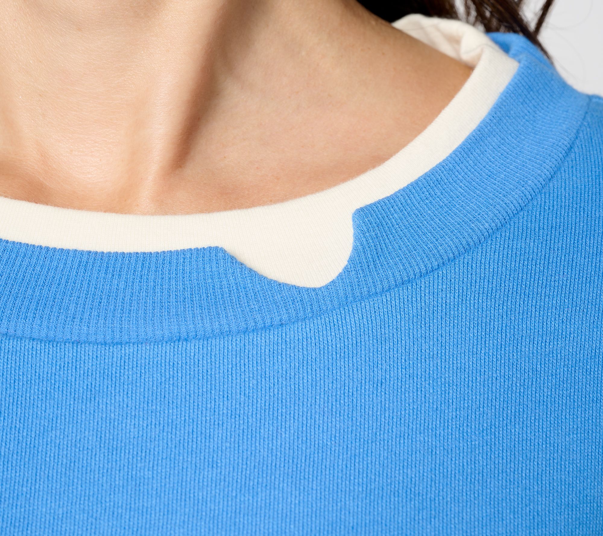 • Features: crew neckline; two-layered ribbing at neckband, sleeve cuffs, and hem; cutout details on top layer; set-in long sleeves