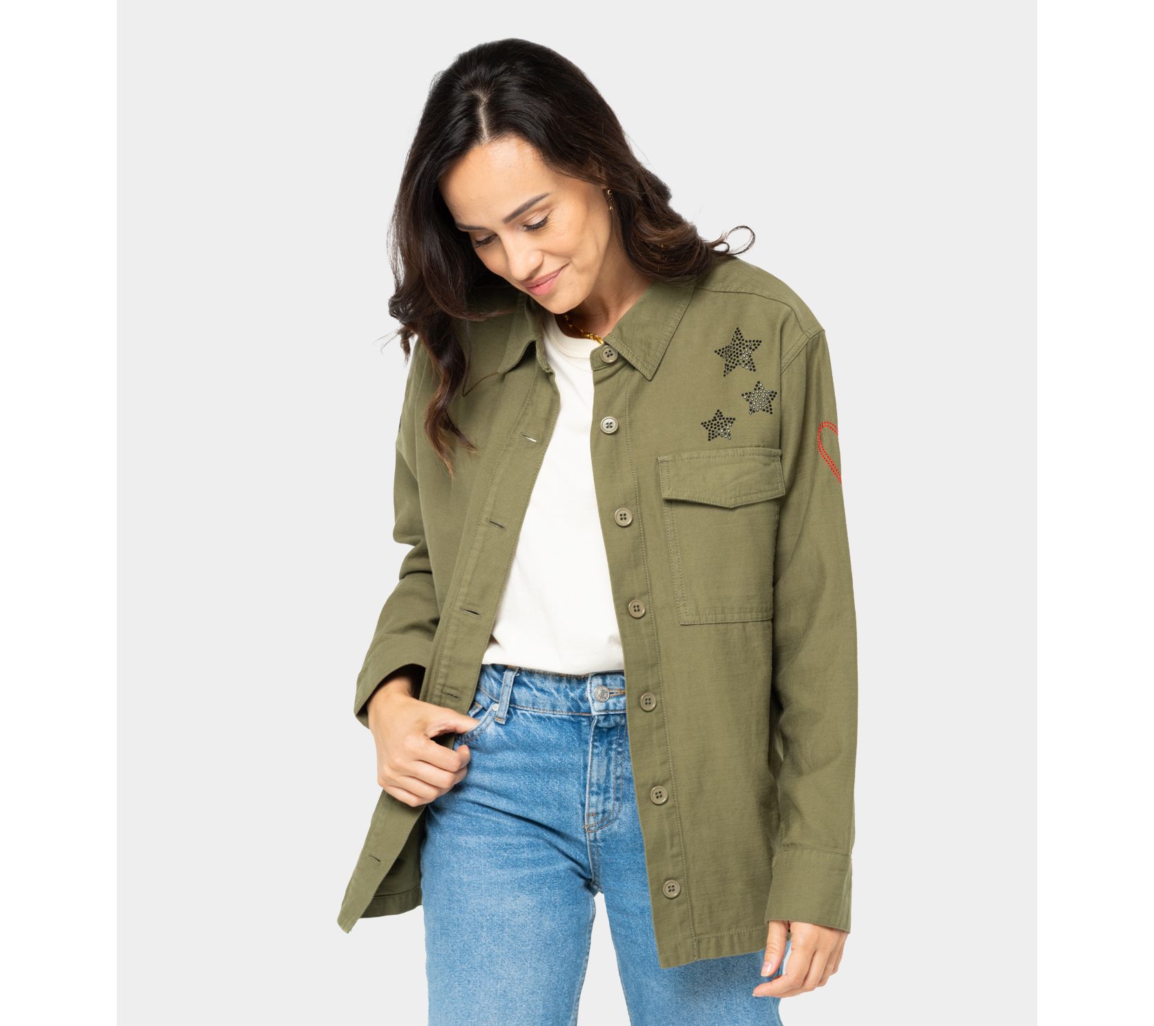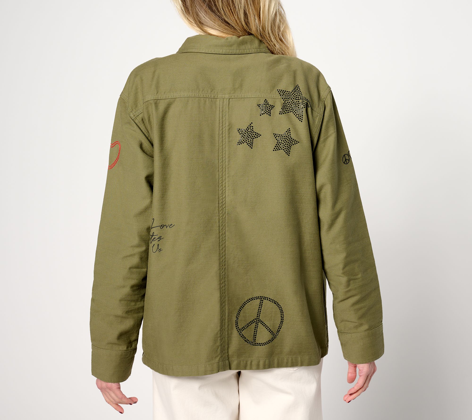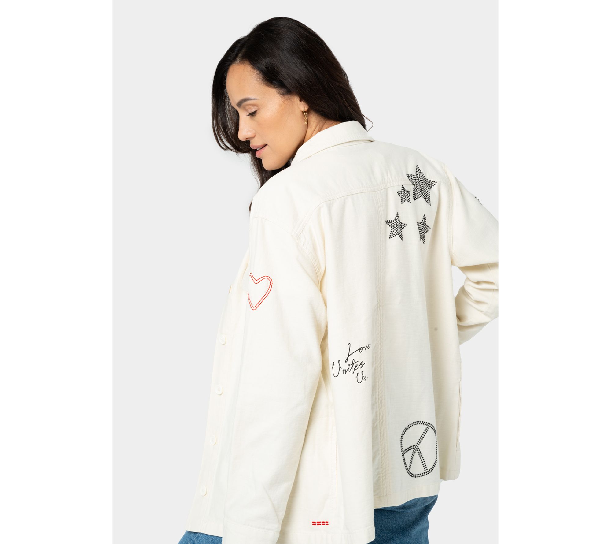 We love when fashion makes us feel good and this utility jacket is no exception. Featuring a studded heart, peace symbol, and stars, this topper is proof positive that Love Unites Us. From Peace Love World.