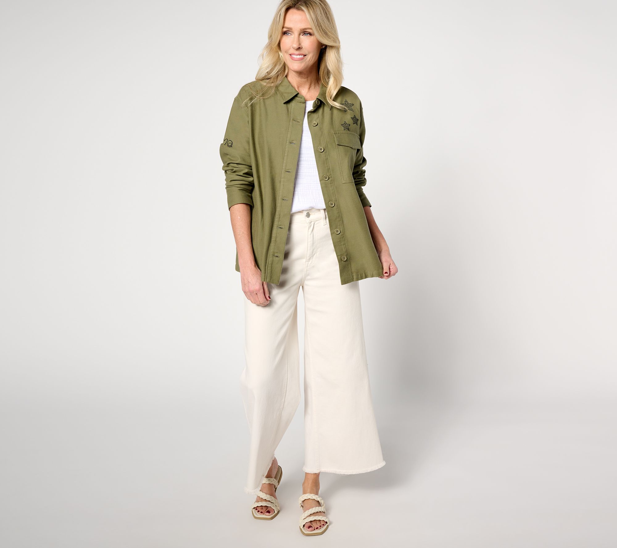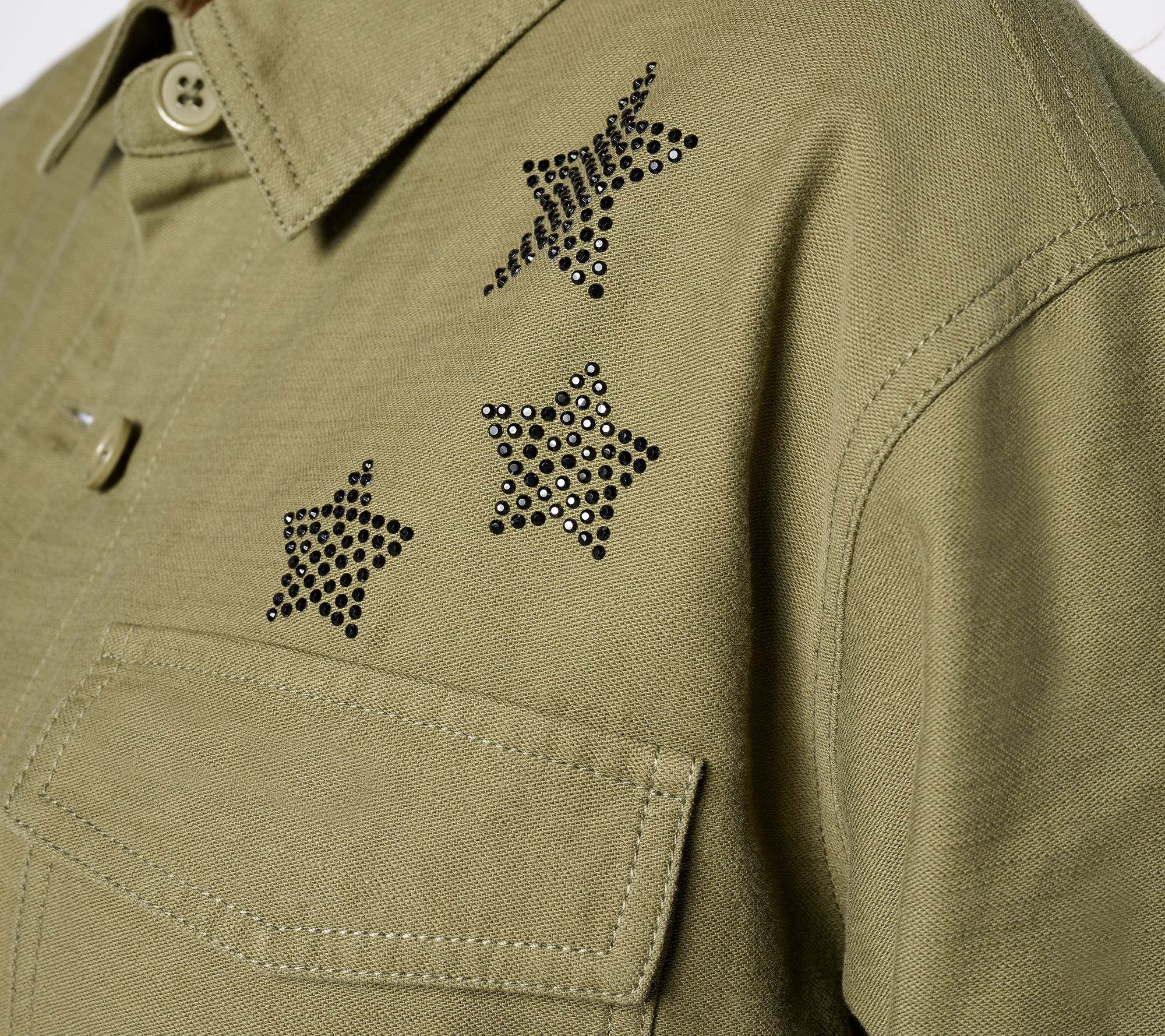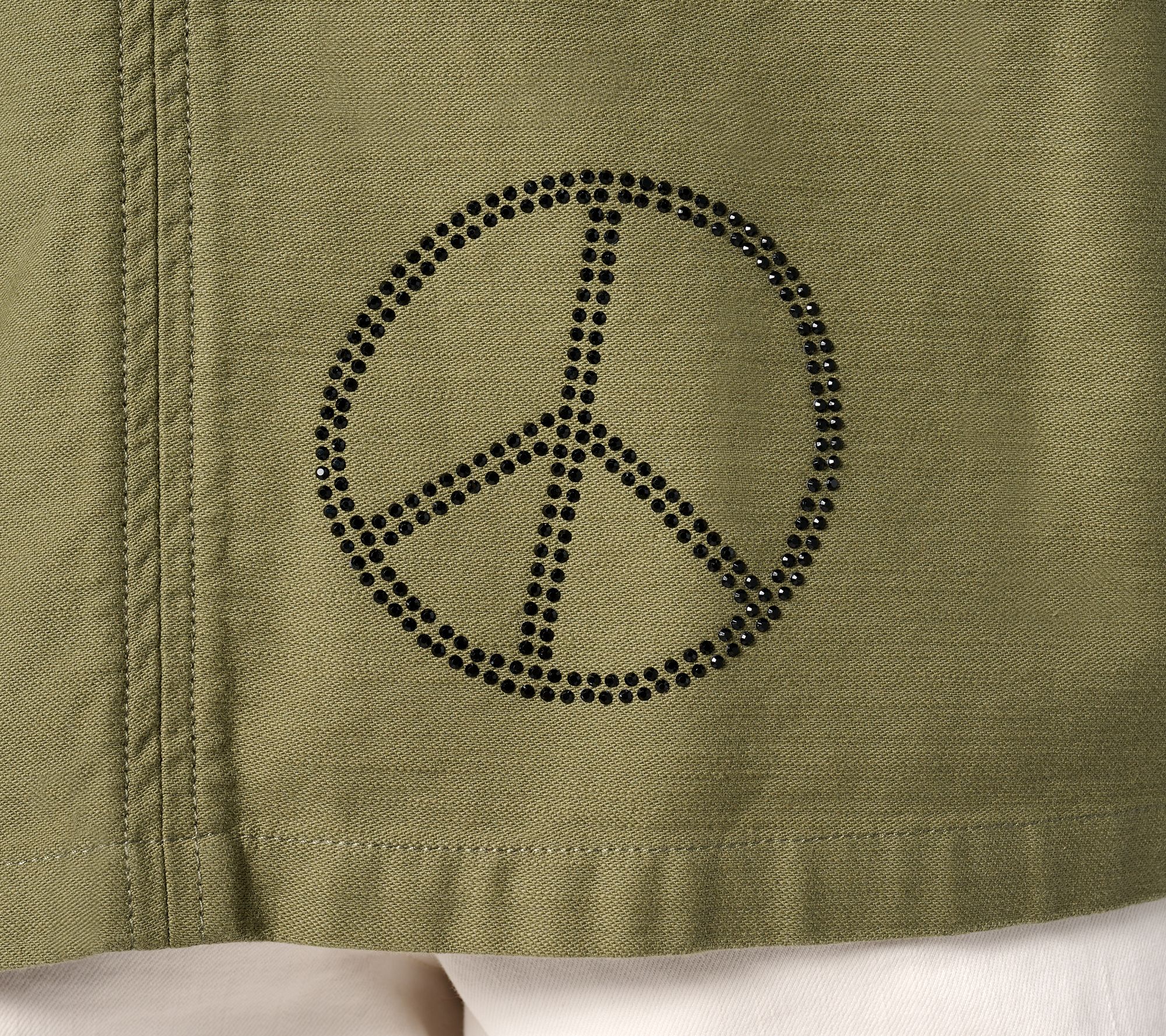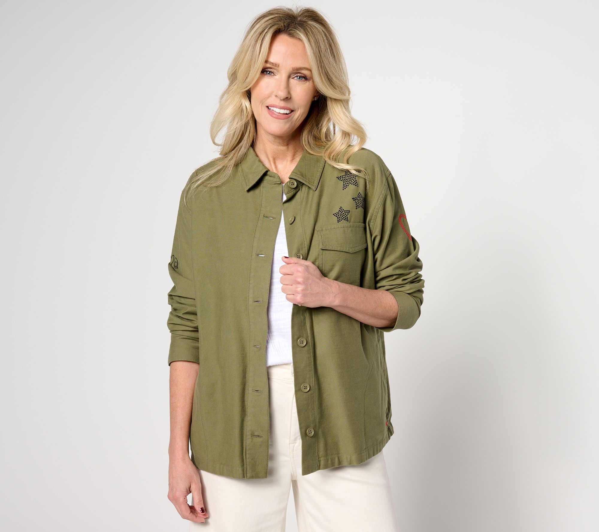 We love when fashion makes us feel good and this utility jacket is no exception. Featuring a studded heart, peace symbol, and stars, this topper is proof positive that Love Unites Us. From Peace Love World.